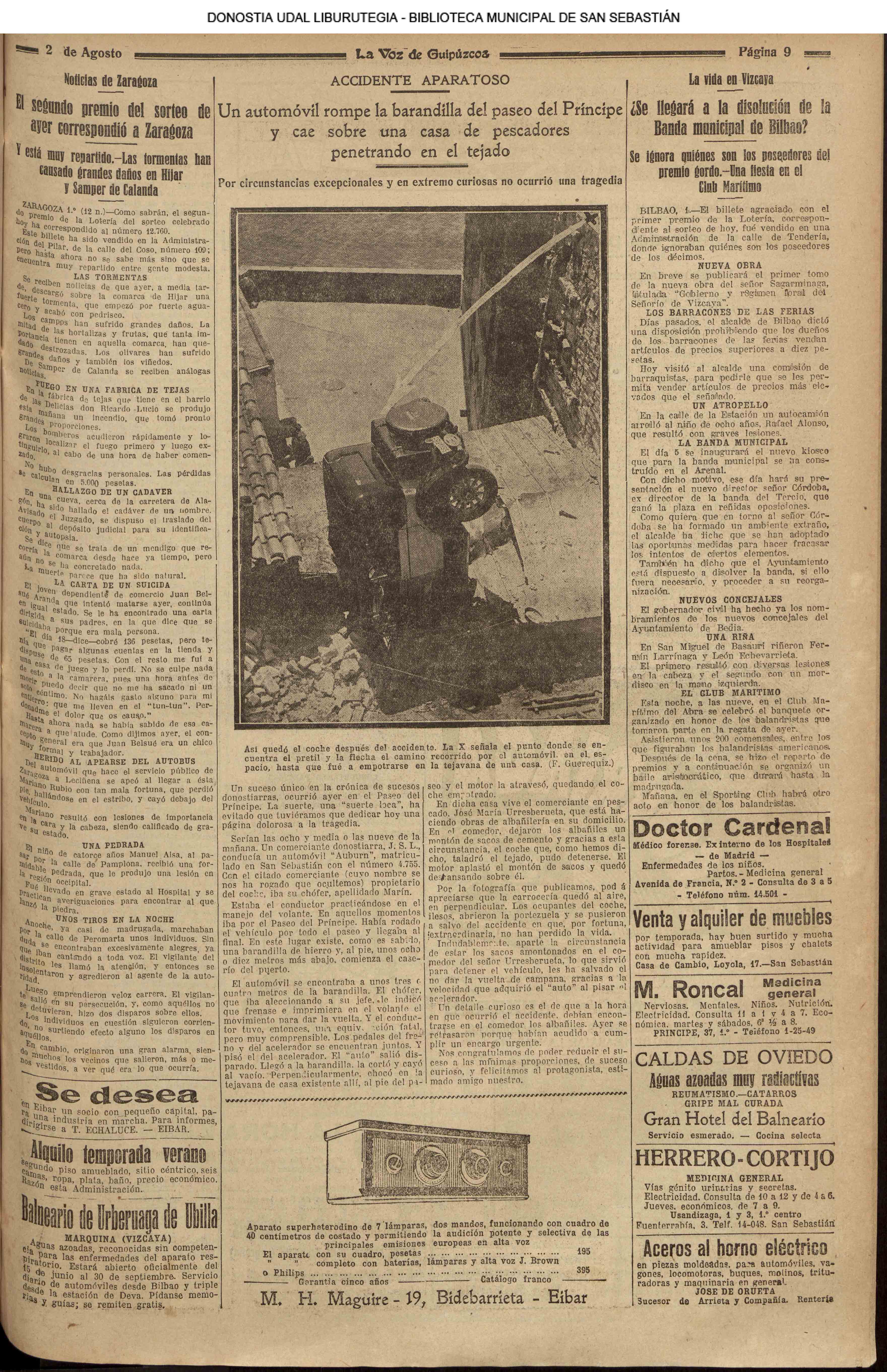 # ACCIDENTE APARATOSO - Un automóvil rompe la barandilla del paseo del Príncipe y cae sobre una casa de pescadores penetrando en el tejado