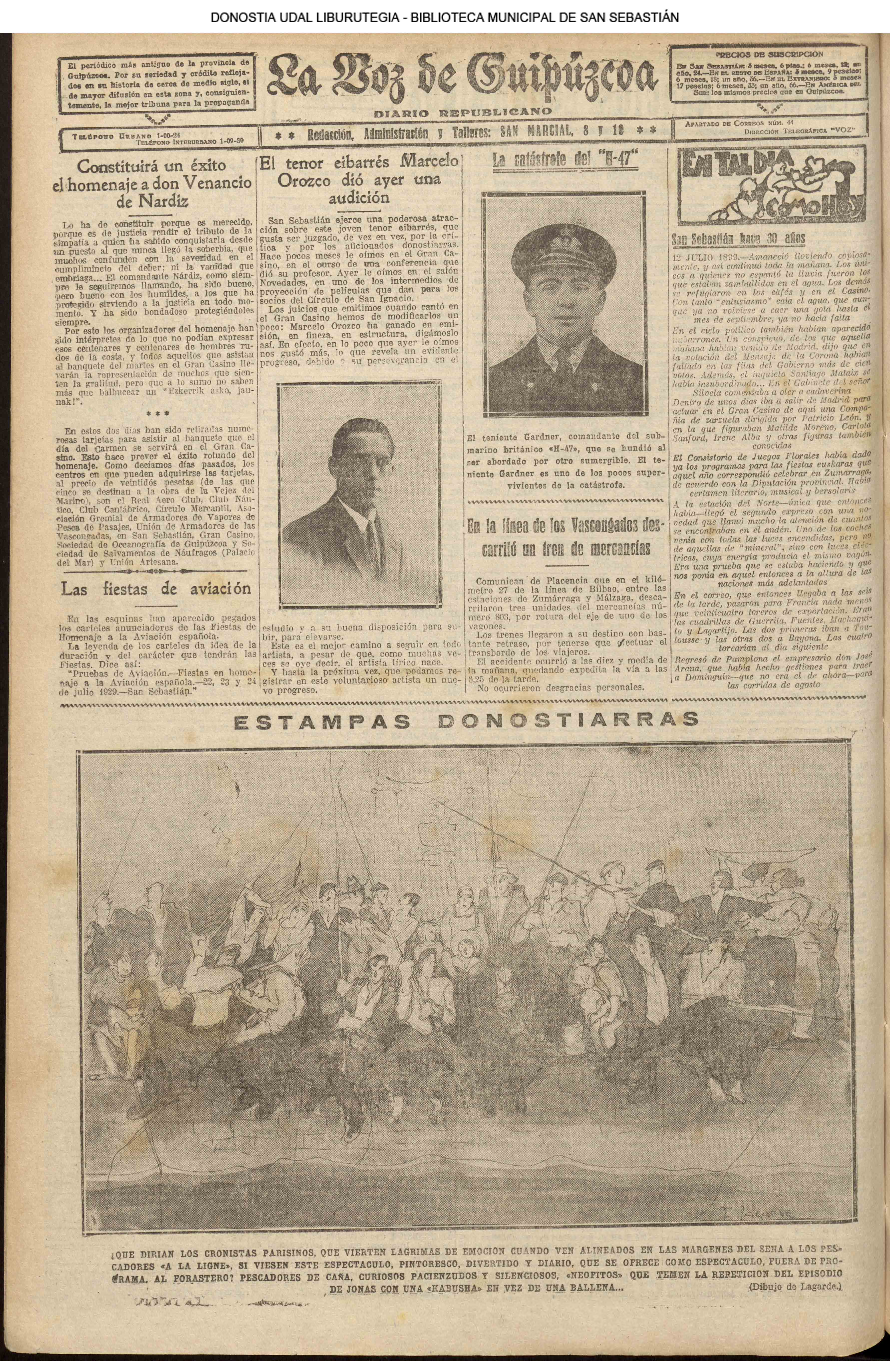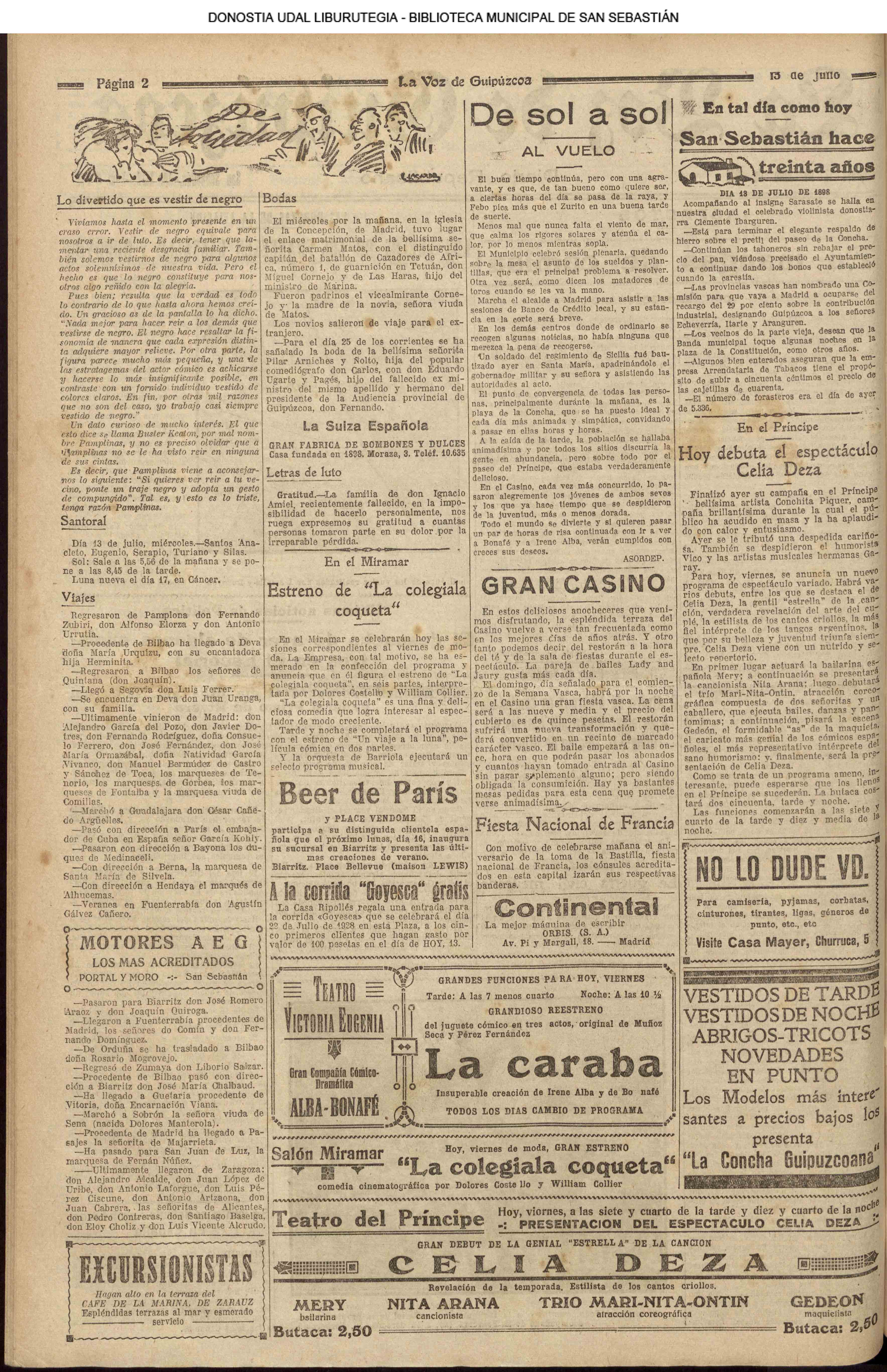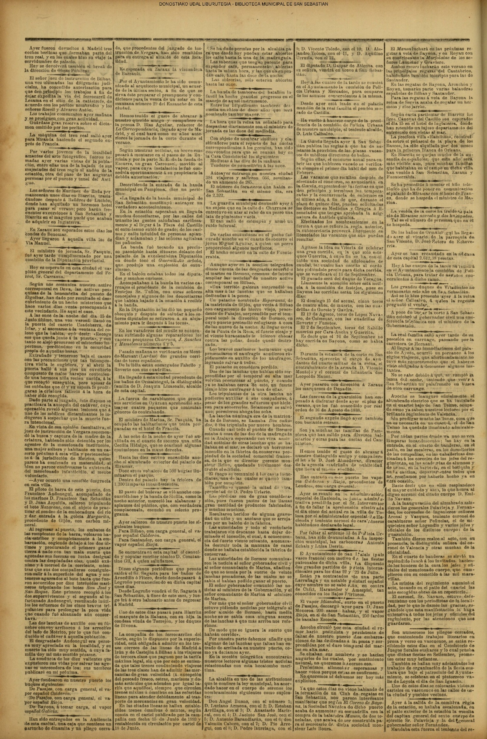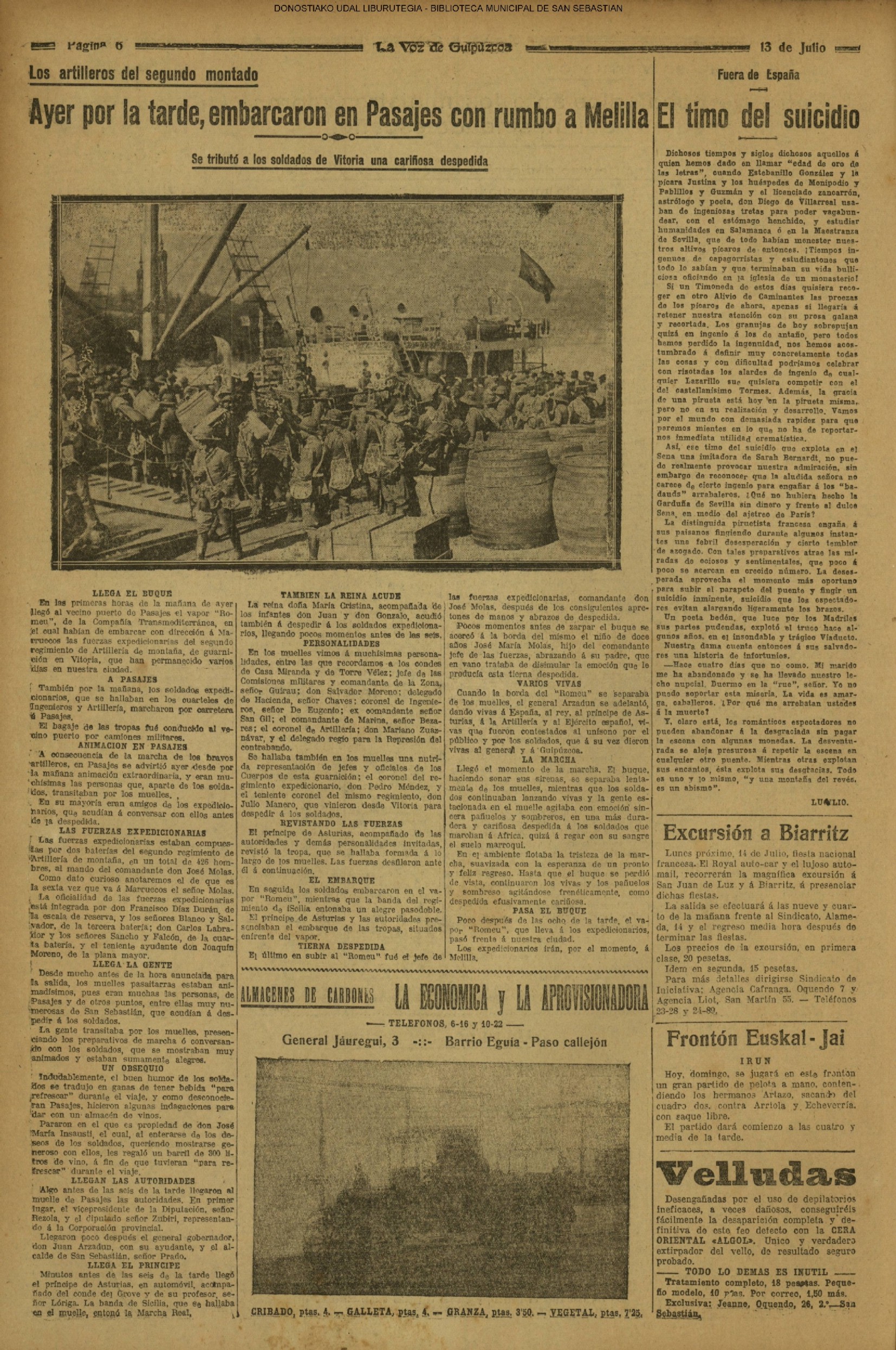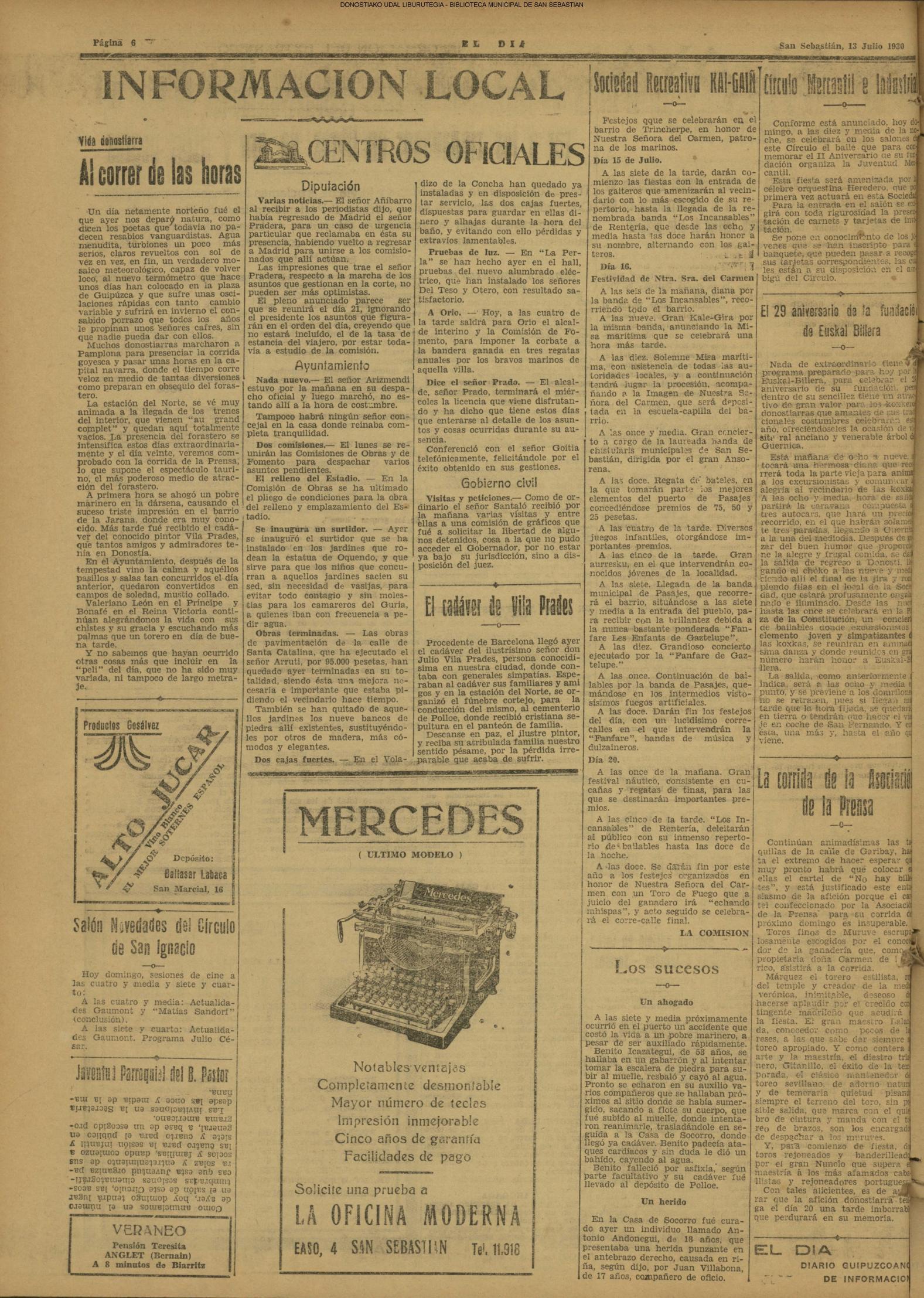 (1959) - En la ceremonia de fin de curso de las Escuelas Nacionales, efectuada en el salón de actos de la Biblioteca Municipal, es impuesta la Medalla al Mérito en la Enseñanza, a la maestra doña Carmen Gallego Santos, que ha ejercido su abnegada profesión en las Escuelas donostiarras durante más de medio siglo. (1961) - Un temporal de mar se produce hoy, tarde y noche, en el Cantábrico, originando grandes pérdidas materiales y numerosas víctimas entre la sufrida clase pescadora. Padecieron especialmente las consecuencias de esta inesperada y violentísima galerna de verano, la pequeña flota deportiva de nuestra bahía y las instalaciones veraniegas situadas en los paseos marítimos de la ciudad. (LA VOZ DE ESPAÑA) (1962) (1972) |