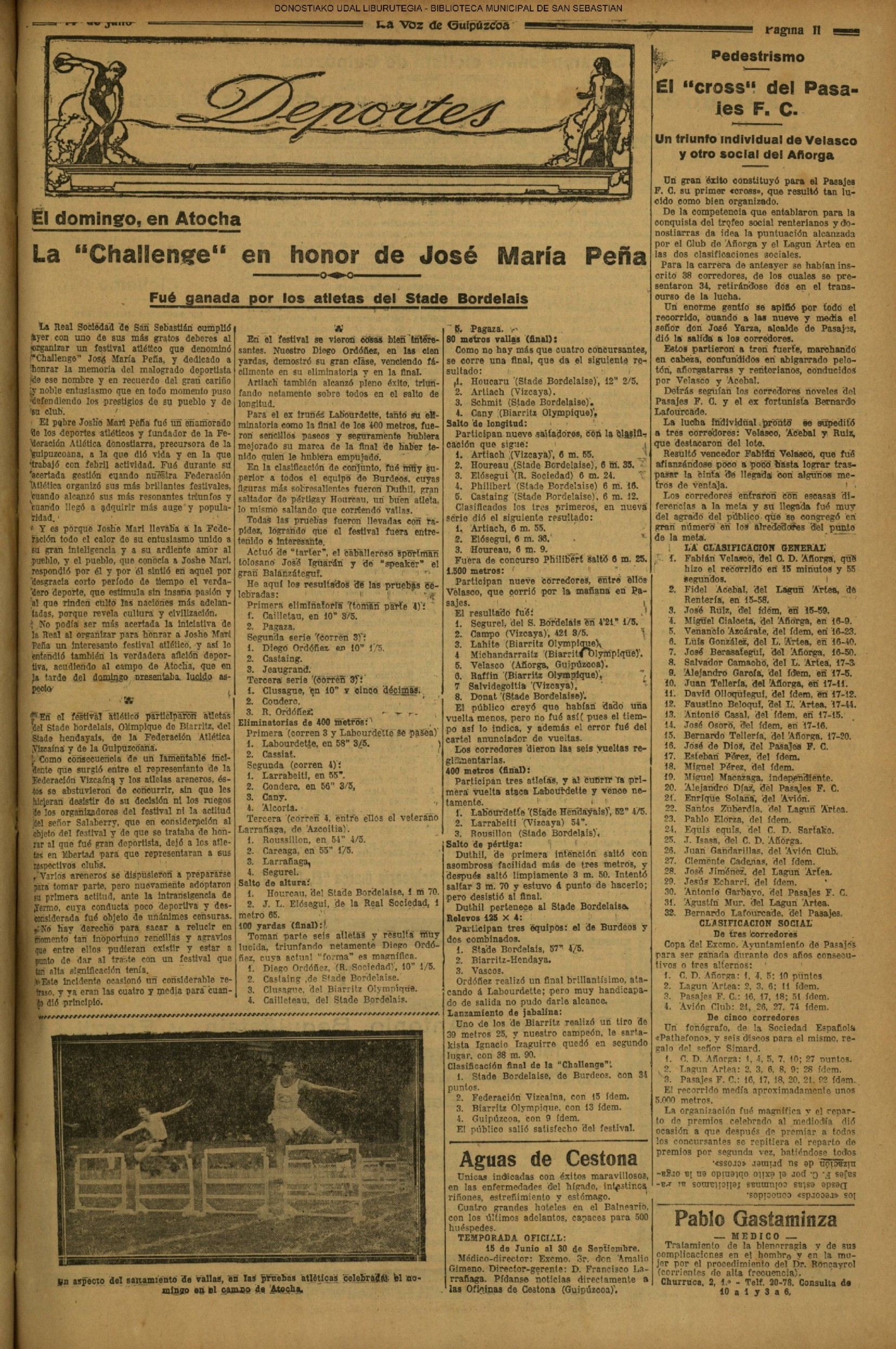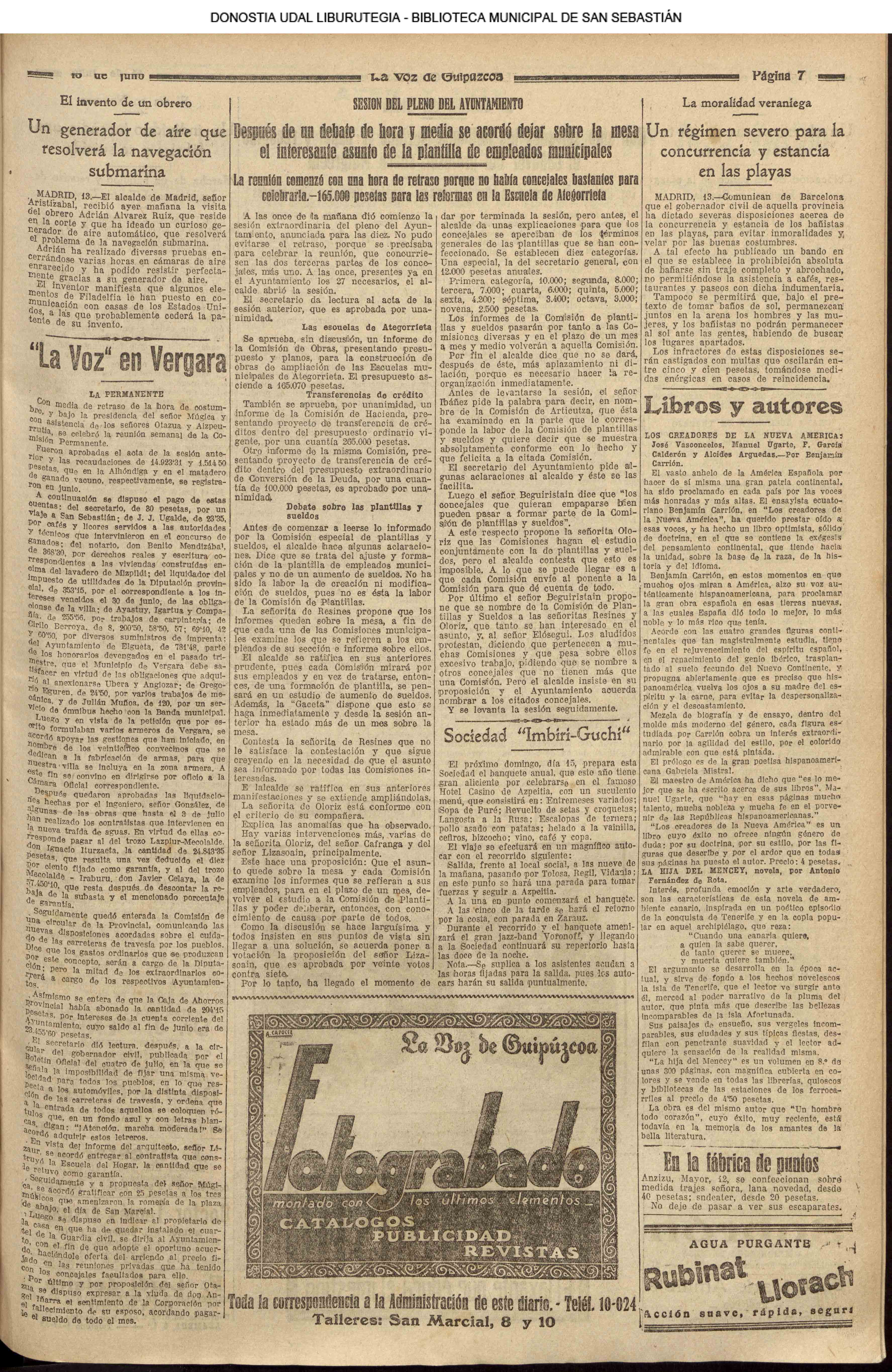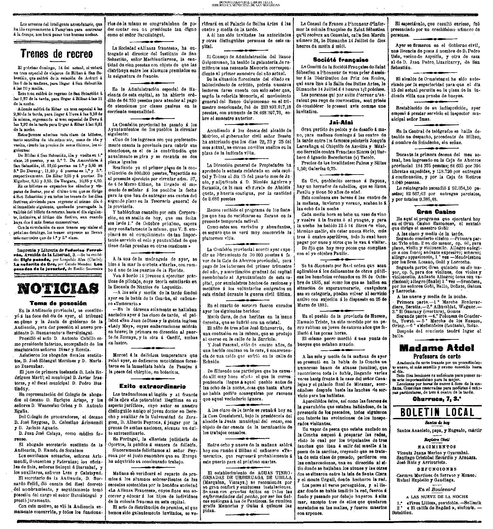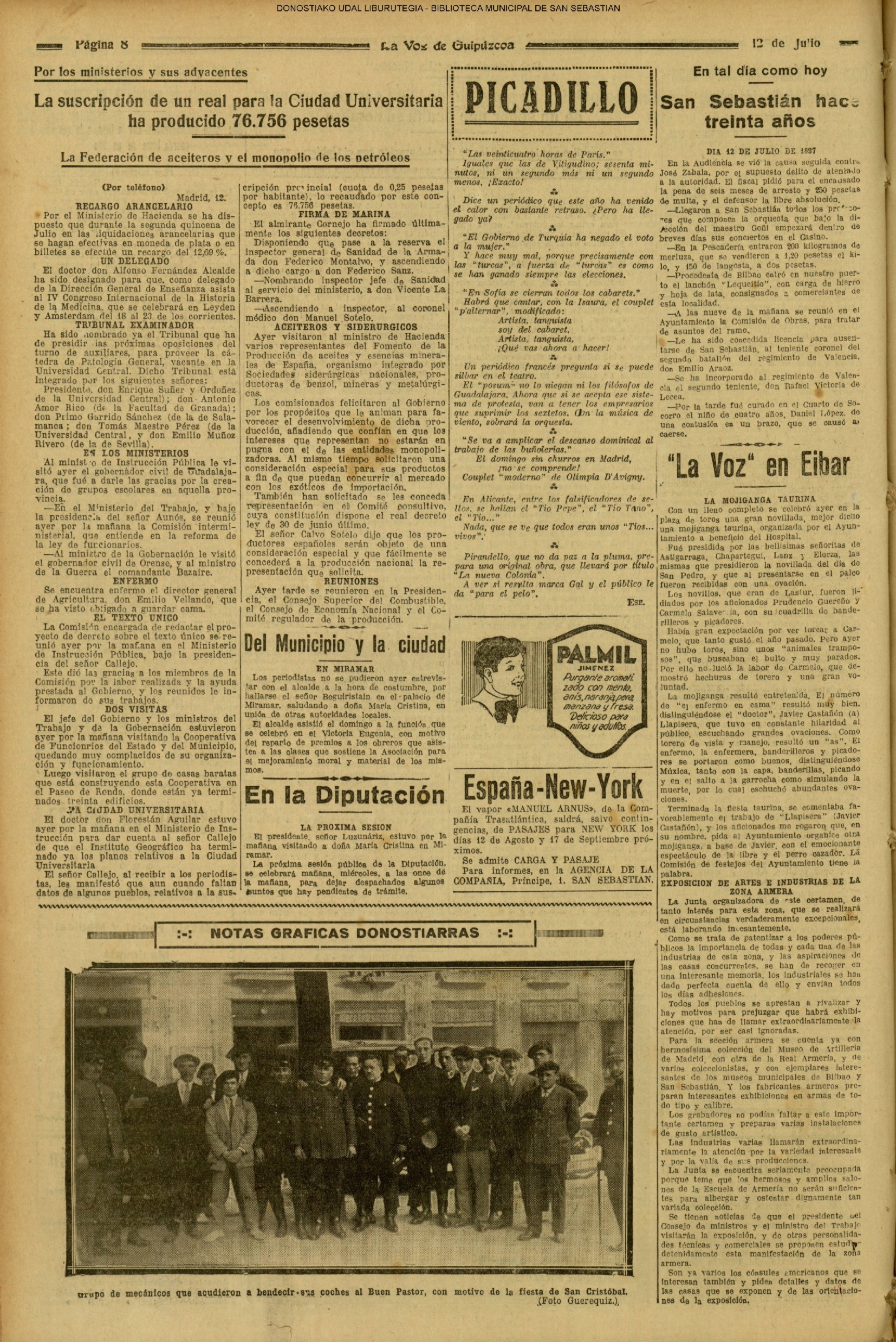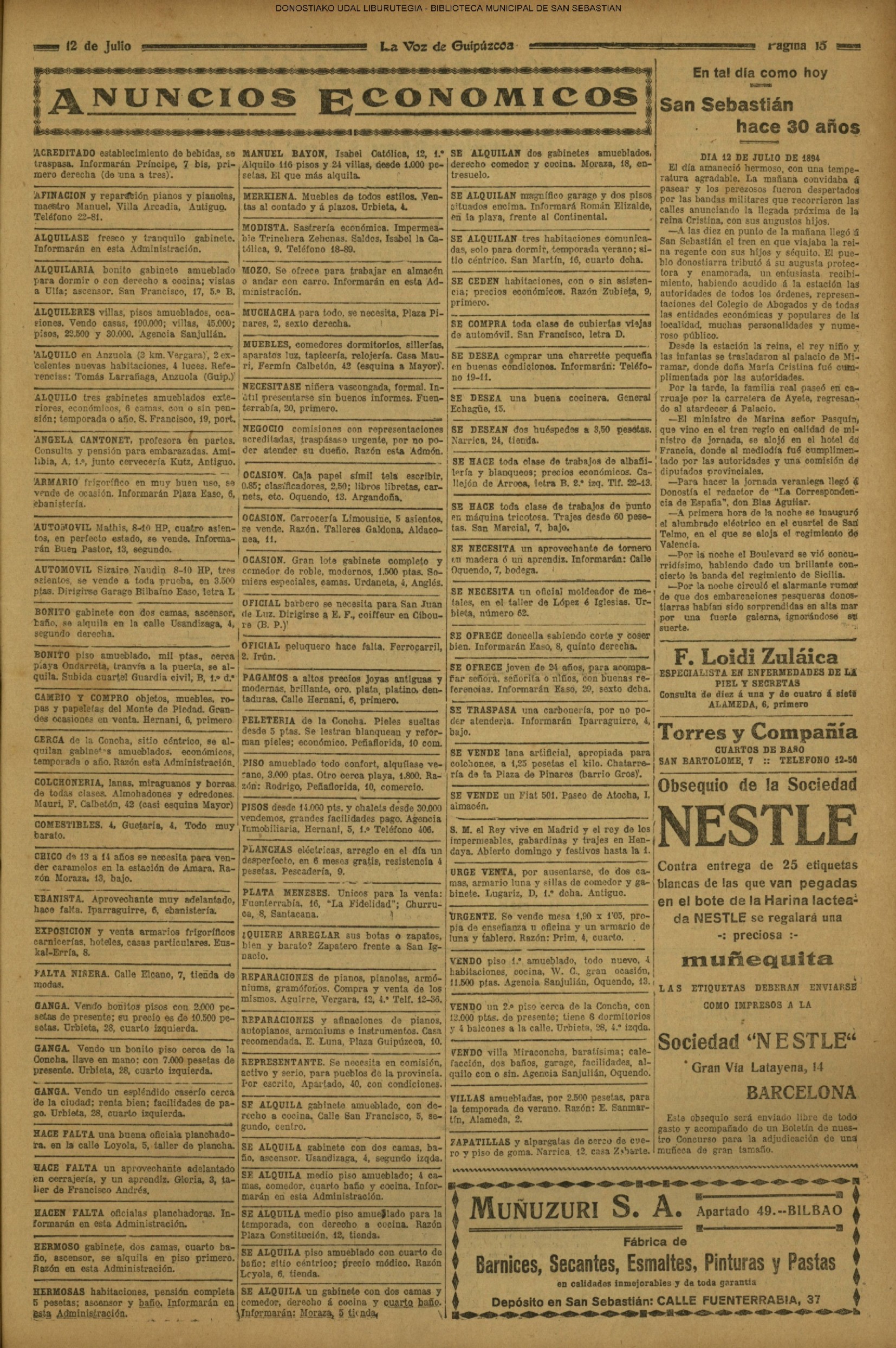 (1959) - En la ceremonia de fin de curso de las Escuelas Nacionales, efectuada en el salón de actos de la Biblioteca Municipal, es impuesta la Medalla al Mérito en la Enseñanza, a la maestra doña Carmen Gallego Santos, que ha ejercido su abnegada profesión en las Escuelas donostiarras durante más de medio siglo. (1961) - Un temporal de mar se produce hoy, tarde y noche, en el Cantábrico, originando grandes pérdidas materiales y numerosas víctimas entre la sufrida clase pescadora. Padecieron especialmente las consecuencias de esta inesperada y violentísima galerna de verano, la pequeña flota deportiva de nuestra bahía y las instalaciones veraniegas situadas en los paseos marítimos de la ciudad. (LA VOZ DE ESPAÑA) (1962) (1972) |