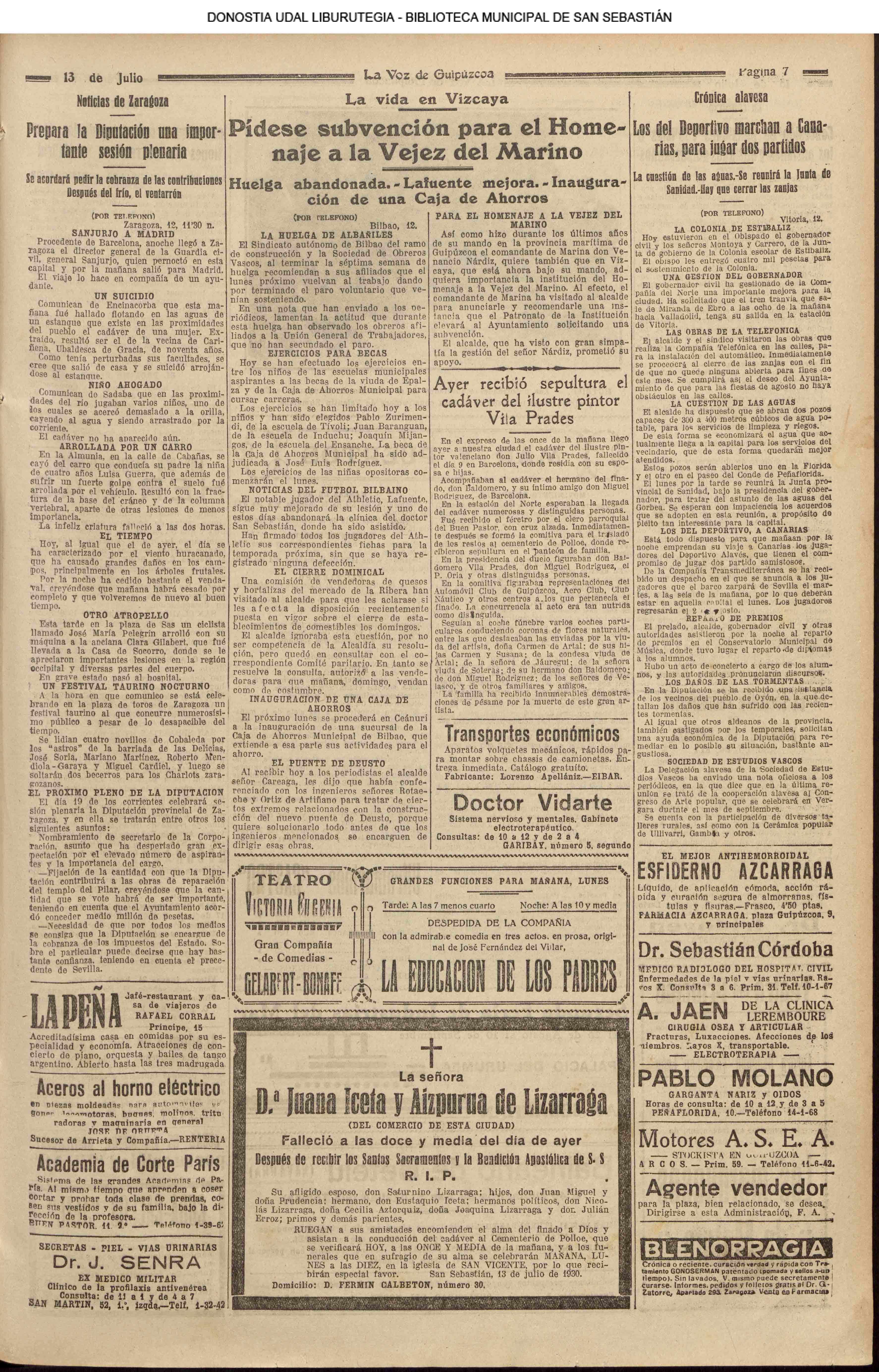 (1952) Fallece, en Madrid, de 69 años, el ilustre pintor lezotarra, Elias Salaverría.