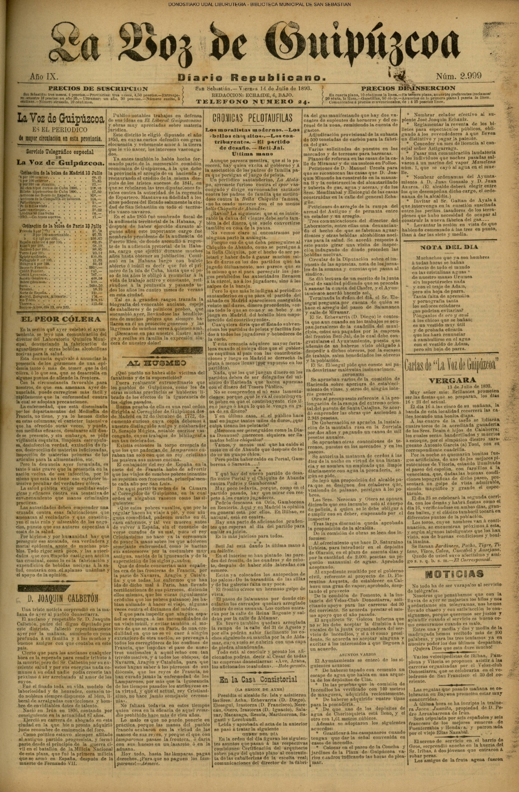 (1813) (1823) (1833) (1843) (1853) (1863) (1873) (1883) (1893).—Es jubilado el Administrador de la Aduana de San Sebastián, don Pedro Gómez Salazar, (1893) Llegaron los focos reflectores eléctricos para las torres del Gran Casino, comenzándose inmediatamente a su instalación. (1893) Fallece, de 87 años, D. Joaquín Calbetón y Legarra, ex-diputado y ex-fiscal y ex-presidente de la Audiencia de La Habana. (1894) EL TRIUNFO DE LA BANDA MUNICIPAL (La Voz de Guipúzcoa) (1893) TAL DÍA COMO HOY # PLENO MUNICIPAL (En la Casa Consistorial) (1894) TAL DÍA COMO HOY (1895) TAL DÍA COMO HOY (1896) TAL DÍA COMO HOY (1897) TAL DÍA COMO HOY (1898) TAL DÍA COMO HOY (1899) TAL DÍA COMO HOY (1900) TAL DÍA COMO HOY |