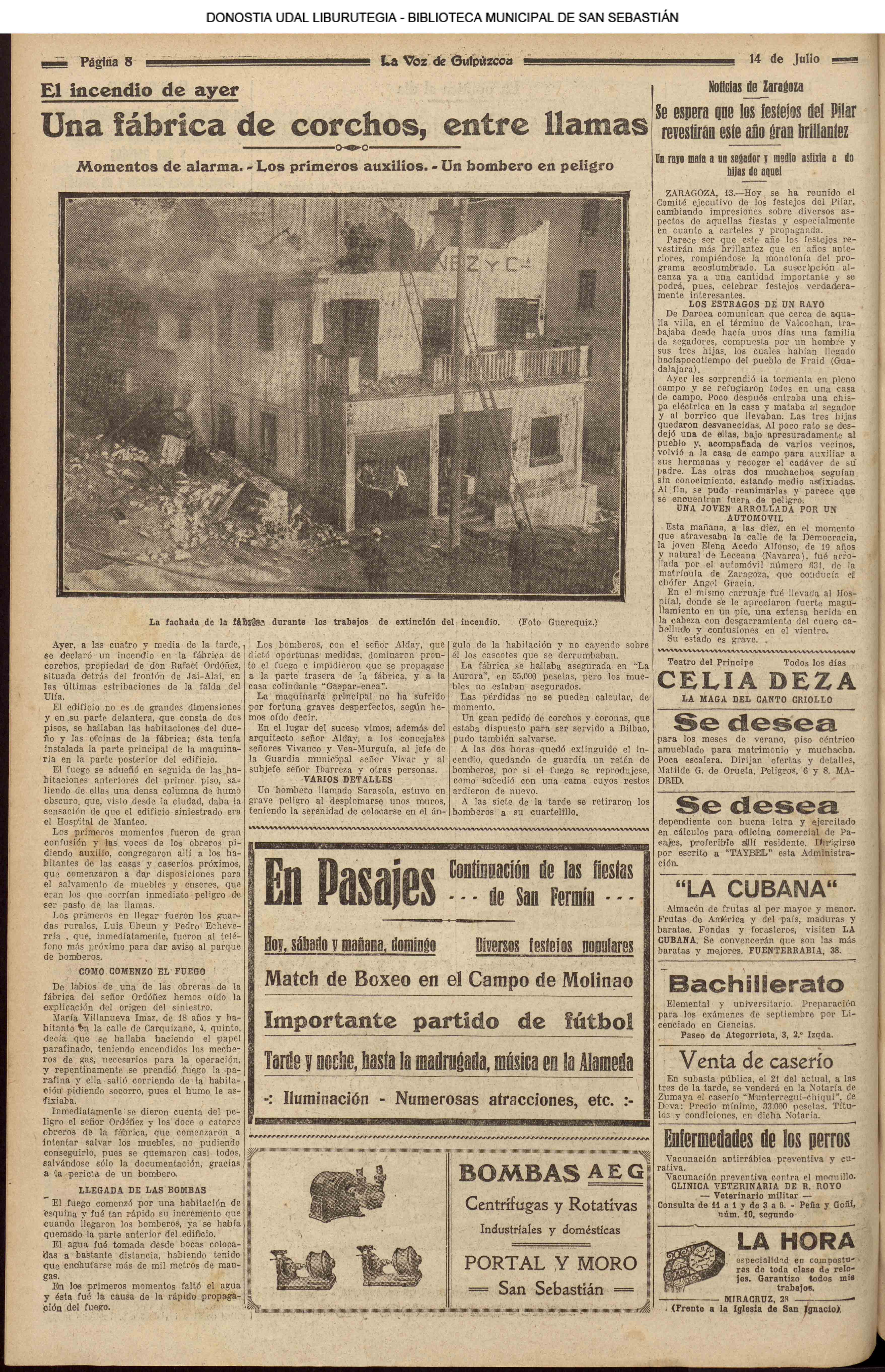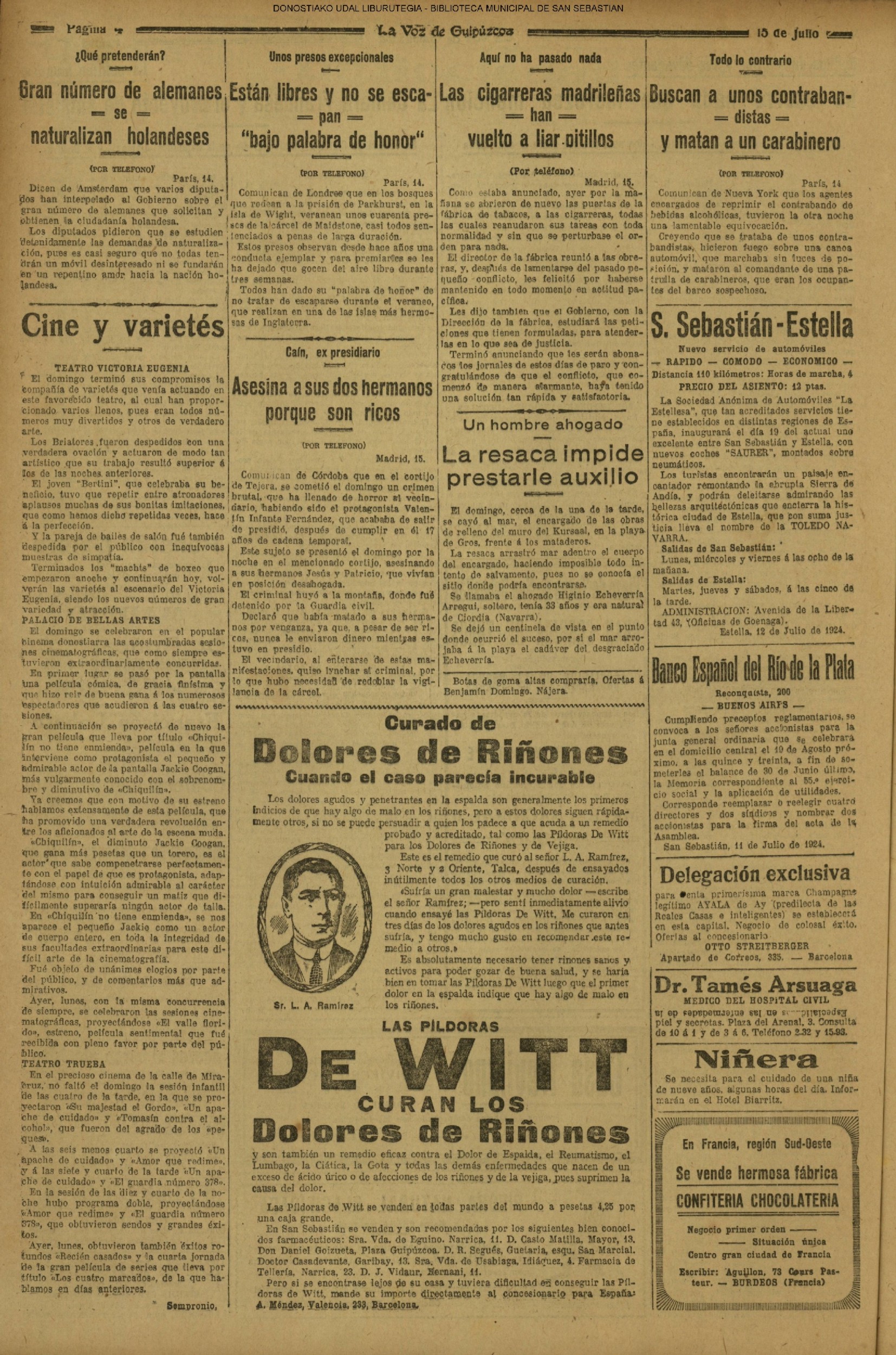 (1924) DE SOL A SOL (DOMINGO) (1924) El encargado de las obras de relleno del muro del Kursaal, Higinio Echeverría Arregui, de 33 años, soltero y navarros,se cae este mediodía al mar en la playa de Gros, frente al Matadero. La corriente se lo llevó, pereciendo. Al día siguiente fué rescatado el cadáver. (La Voz de Guipúzcoa)(El Pueblo Vasco)(El Pais Vasco)(La Constancia) # CHARLOTADA .- Los bufos, parodian, torean y hasta se dejan coger. (La Voz de Guipúzcoa)(El Pueblo Vasco)(El Pais Vasco)(La Constancia) # EN AMEZQUETA.- Homenaje en memoria de "Pernando Amezketarra" (La Voz de Guipúzcoa)(El Pueblo Vasco)(El Pais Vasco)(La Constancia) (1925) DE SOL A SOL (LUNES) - El lunes ha sido un buen día también, al que no hay que pedir nada, pues hizo una temperatura que ni pedir de boca. (1926) DE SOL A SOL (MARTES) (1927) DE SOL A SOL (MIÉRCOLES) - Continúa haciendo buen tiempo (1928) DE SOL A SOL (VIERNES) (1928) COMISIÓN PERMANENTE MUNICIPAL (La Voz de Guipúzcoa)(El Pueblo Vasco)(El Pais Vasco)(La Constancia) # INCENDIO.- Una fábrica de corchos, de la falda de Ulía, en llamas.- Momentos de alarma - Los primeros auxilios - Un bombero en peligro. (La Voz de Guipúzcoa)(El Pueblo Vasco)(El Pais Vasco)(La Constancia) (1929) DE SOL A SOL |