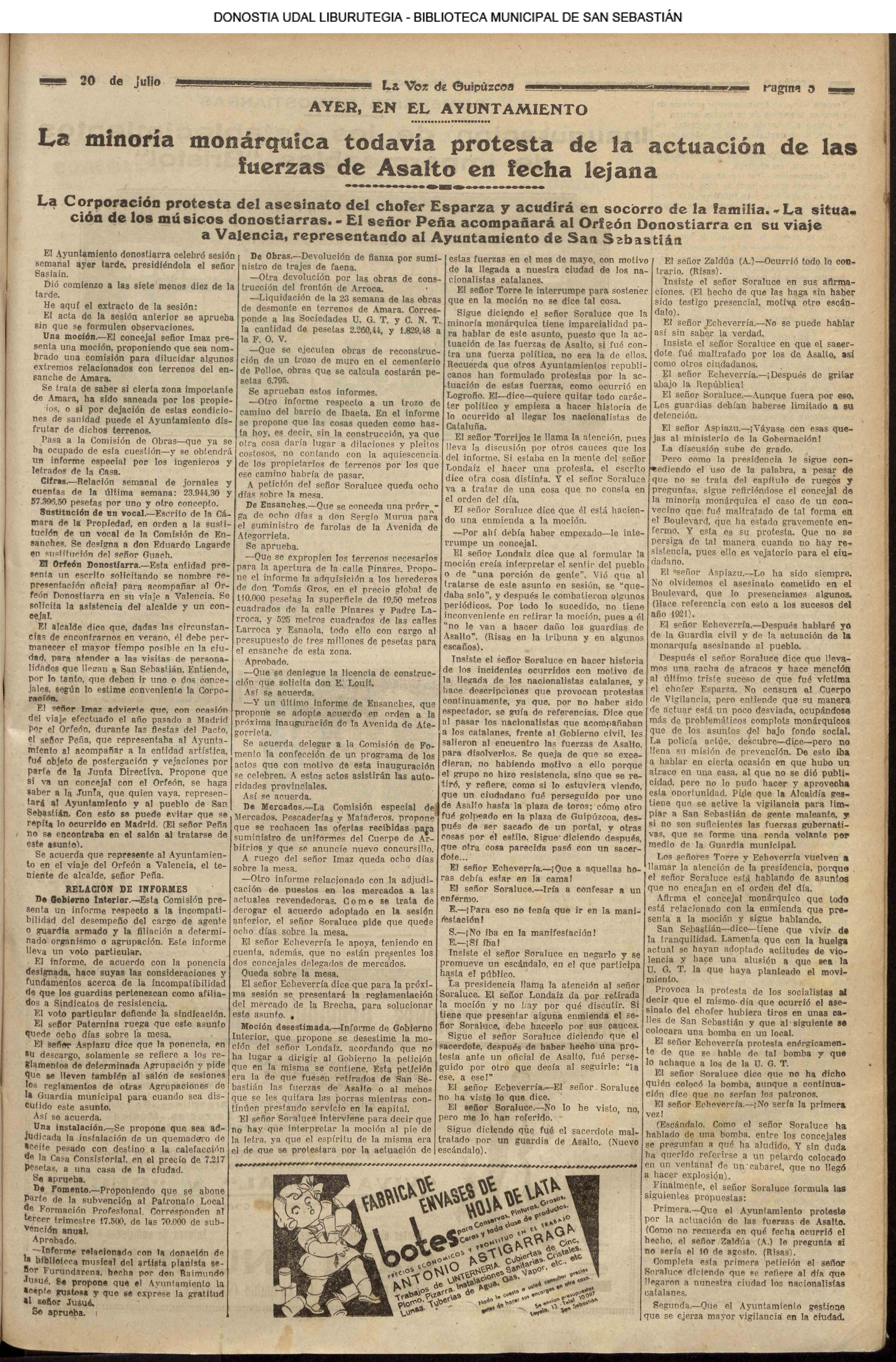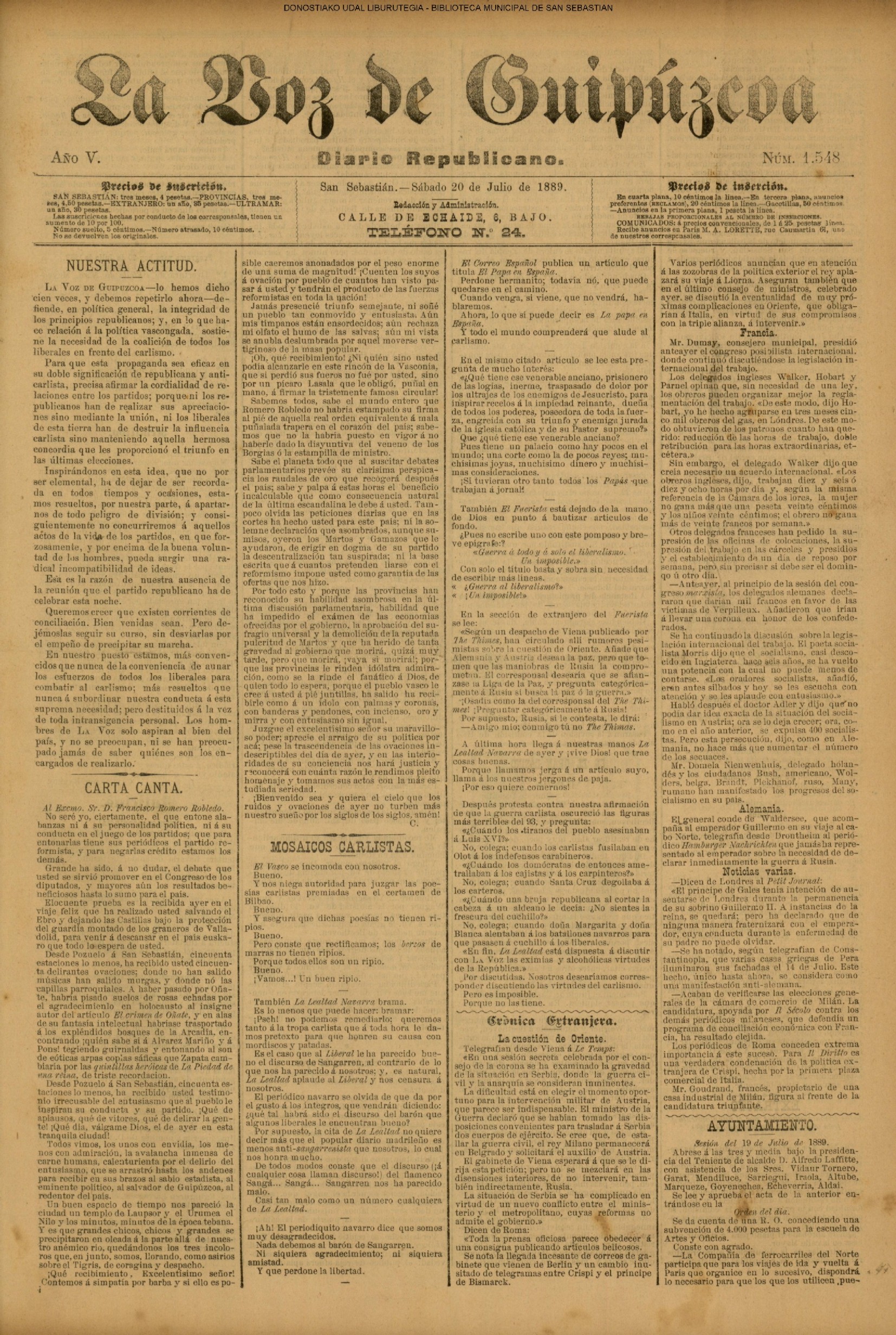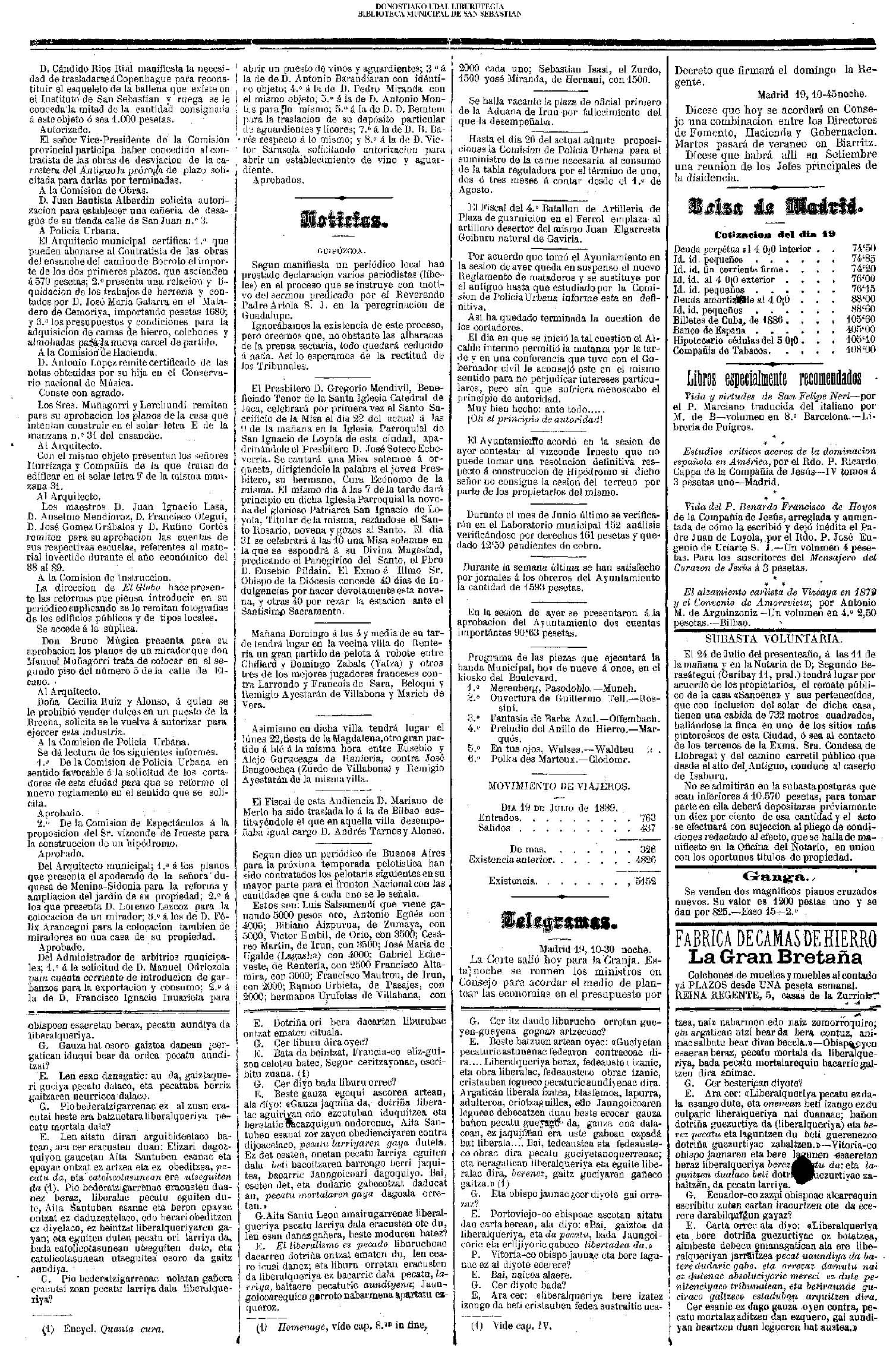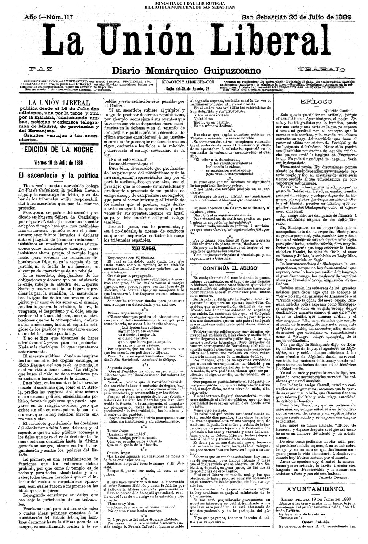 La noche de 19 a 20 han continuado en hacer un soberbio trabajo formando otra línea o retrincheramiento entre el mar de la Concha y el río de Santa Catalina, empezando desde la casa y ermita de San Martín por lo más eminente de los montones de arena de esta parte del arrabal de San Martín , tirando la paralela hasta encontrarse y aun pasar de la pared sobre el (sic) cual viene la fuente a esta ciudad, formando también otro trozo de línea desde esta parte dirigiendo en línea recta al convento de monjas del Antiguo, que hasta llegar a la orilla del camino que se forma en dicho arenal para para la calzada y convento de San Bartolomé, recelando iban formando otras líneas semejantes la noche inmediata, no obstante el gran fuego de la artillería y mosquetería.