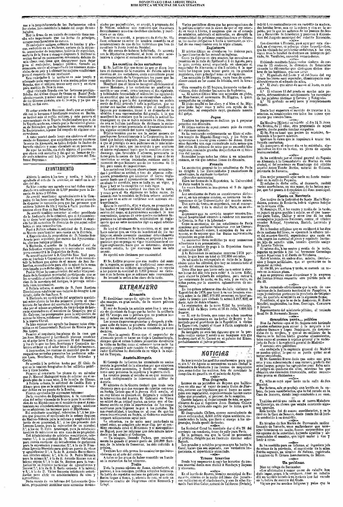 La "Gazeta" informa Durante la noche de ese día, los franceses abren trinchera delante de San Sebastián. Las tropas, mandadas por el teniente general Marqués de Silli, se componen de 4 batallones y 50 dragones. Se construyó la paralela desde el mar hasta el río "Astigarraga" (Urumea), cerca de 200 toesas del camino cubierto de la obra coronada. Los donostiarras no descubrieron estos trabajos hasta muy de día, no pudiendo hacer frente a los franceses, por lo cual no sufrieron estos ninguna baja. Se esperaba que durante la siguiente noche los franceses construyeran otra paralela a 60 toesas de la primera. y de que los reyes viajan a Pamplona, para participar en los festejos por la derrota de los alemanes. Se lanzan salvas y demostraciones de acción de gracias por la victoria, tanto en el ejército, como en Pamplona. En la catedral de Pamplona, con asistencia de los reyes, se canta un Te Deum, cosa que también se ha mandado ejecutar en otras plazas y ciudades importantes. #Berwick1719.