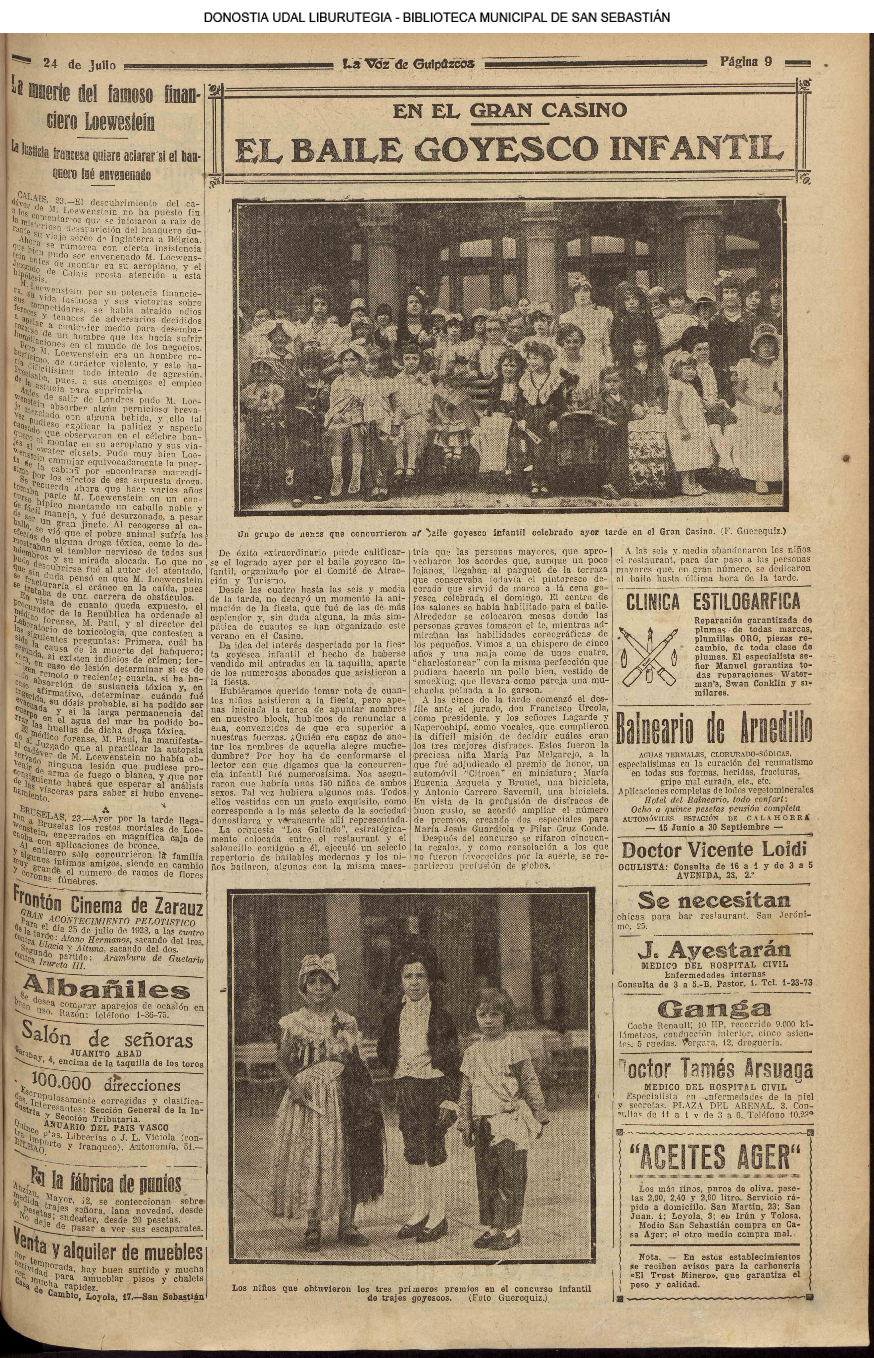 1922.- MOTOR. Primer día de carreras en el CIRCUITO AUTOMOVILÍSTICO de Lasarte. La prueba inaugural es el Campeonato Internacional de MOTORISMO. Esta iniciativa, como otras muchas de la época, es resultado de dos factores. Primero, de una acumulación intensa de capital; y luego del dinamismo de la sociedad donostiarra y de sus clases dirigentes.(1956) En la Comandancia de Marina !e es impuesta a D. Juan Goicoechea Gárate, auxiliar de oficinas de dicha Comandancia, la Cruz del Mérito Naval de Primera clase, con distintivo blanco, en atención a su labor en aquel cargo durante 40 años.