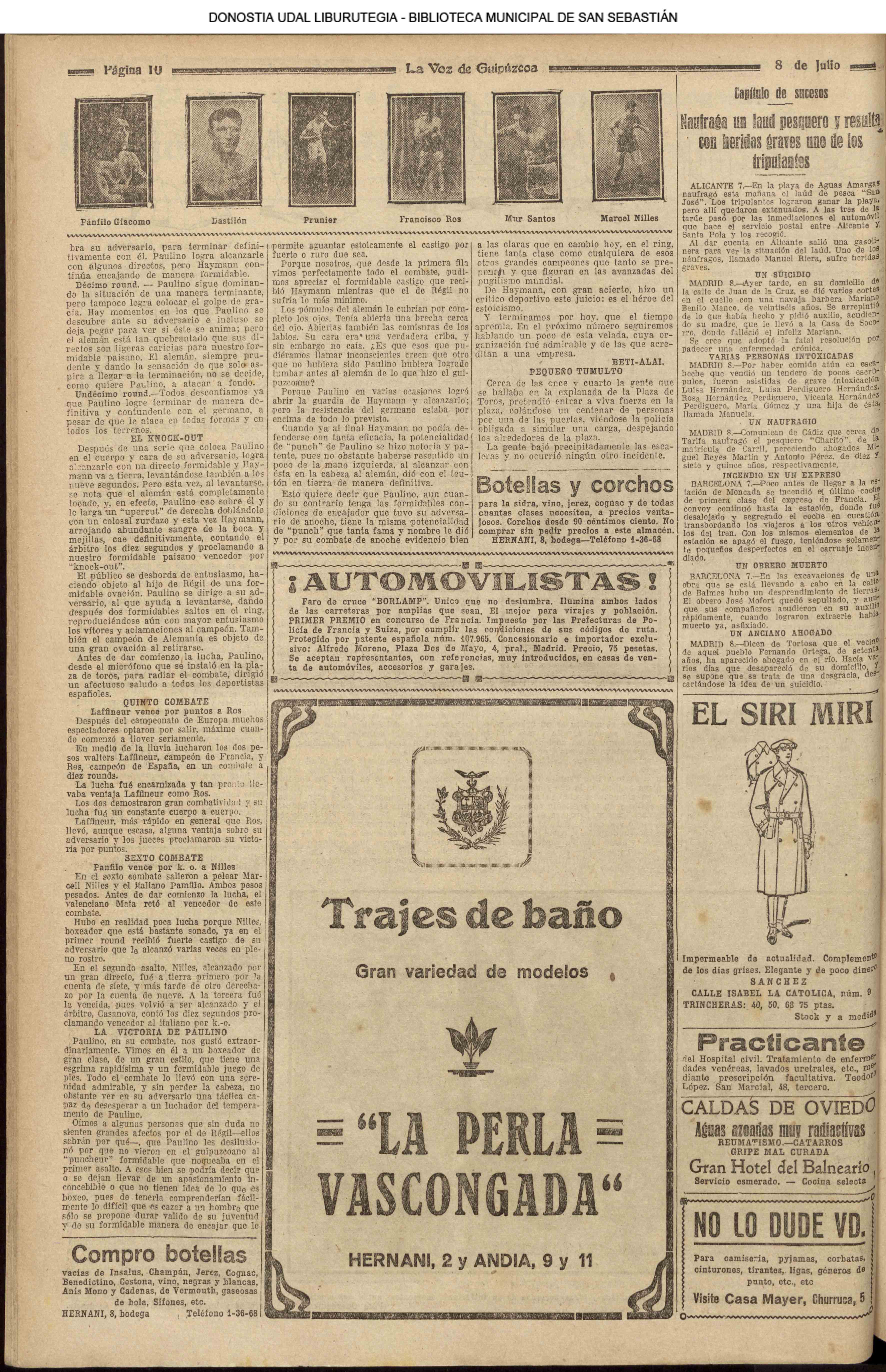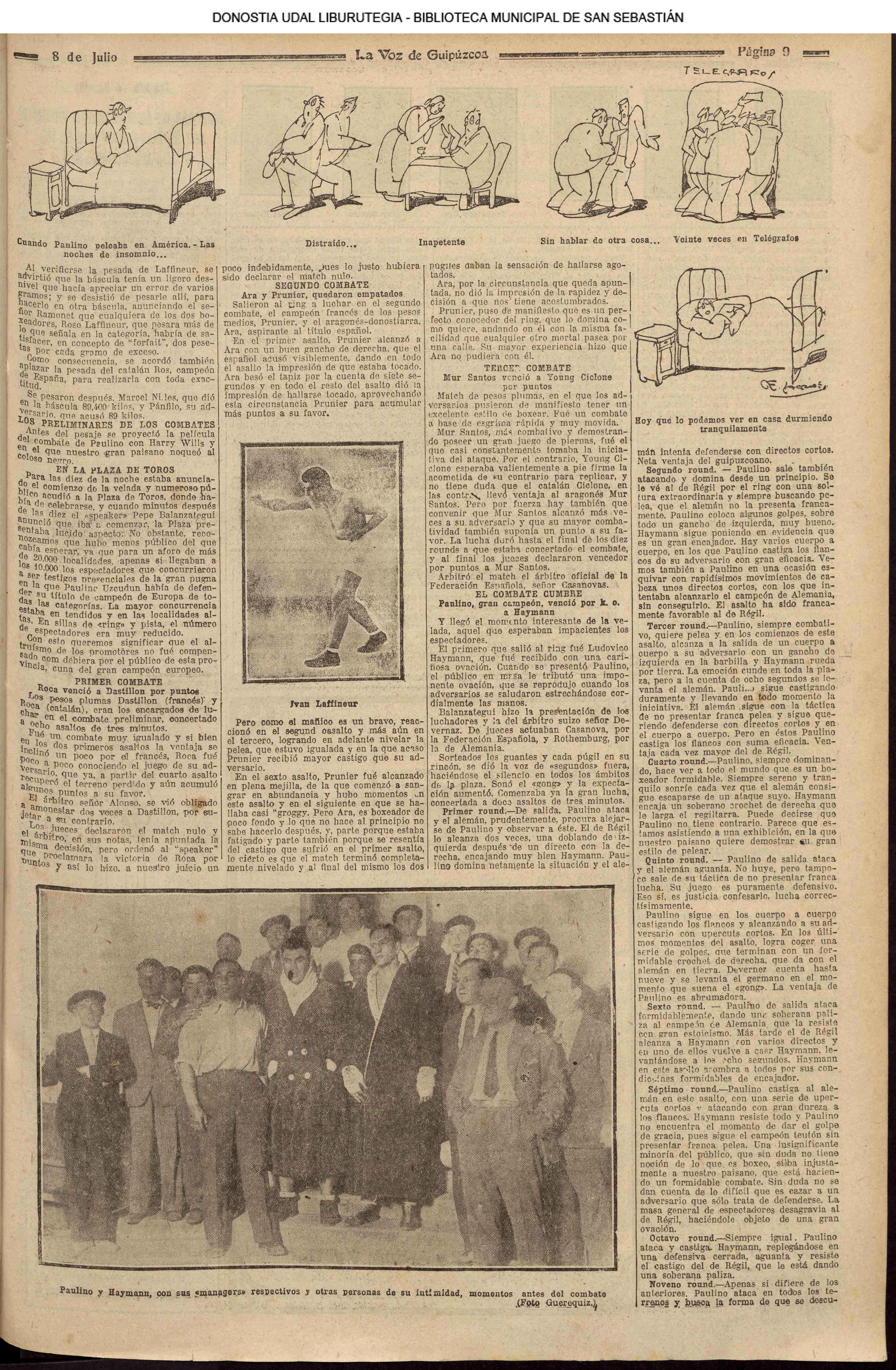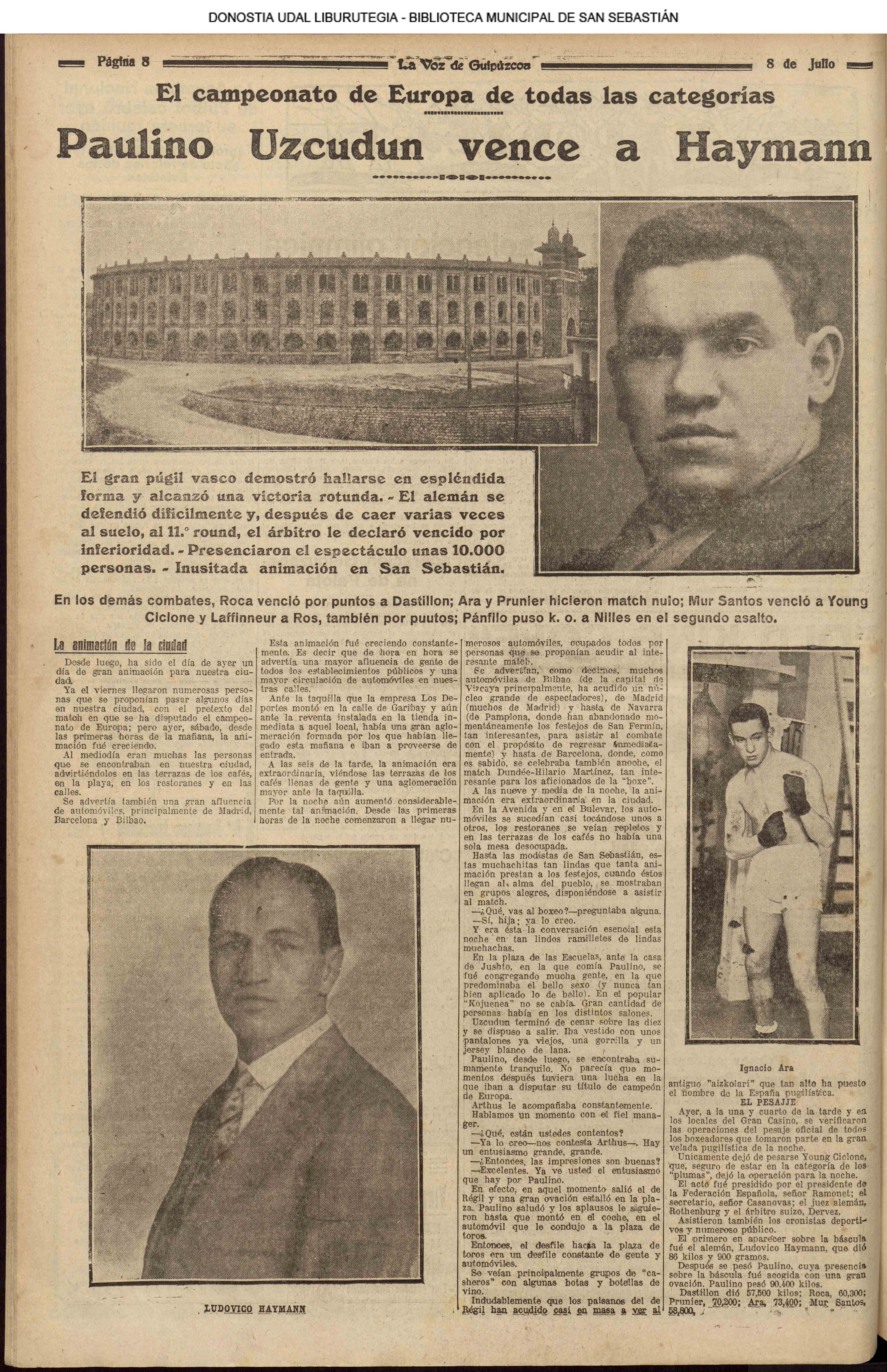 1928.- BOXEO. En la plaza de toros del Chofre, UZCUDUN pone K.O. al alemán Haymann en el 11º asalto y se proclama campeón de Europa.