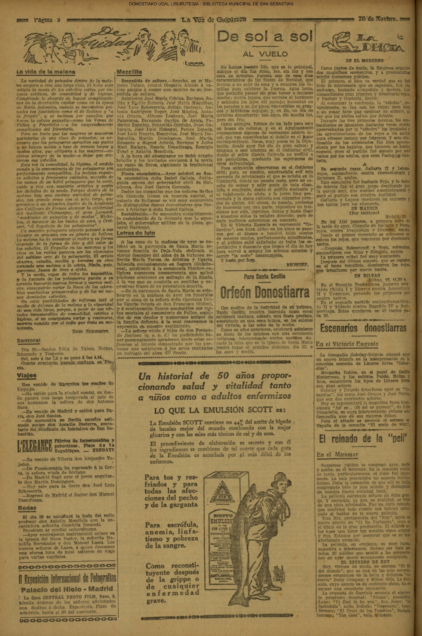 | 1926 - DE SOL A SOL (VIERNES) - El tiempo esta indeciso y con cierta ten-deneia a empeorar definitivamente. Tan pronto hace un buen día como empieza a llover co-plosamente; unas horas está la temperatura como para abrigarse y en otras sobran todes les adminiculos quitafríos. Es indudable que la culpa de todo la tiene el mar, que lleva dos o tres días muy revuelto y como queriéndose meter tierra adentro saltando sobre todos los diques que se le han puesto para evitar estas invasiones que de vez en cuando se le ocurre intentar al Cantábrico, umas veces manso y tranquilo y otras soberbio y altanero como el que más. (......)