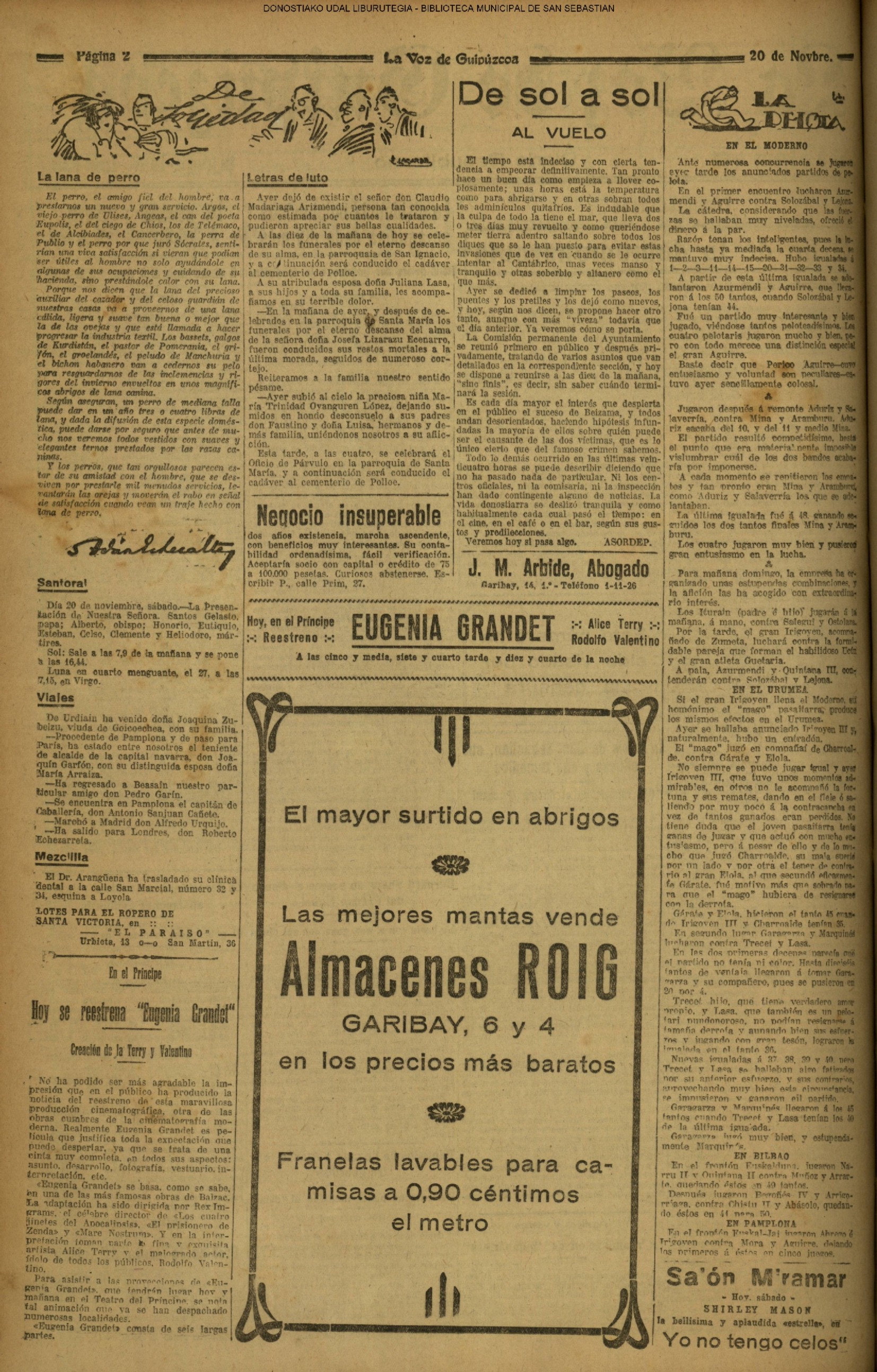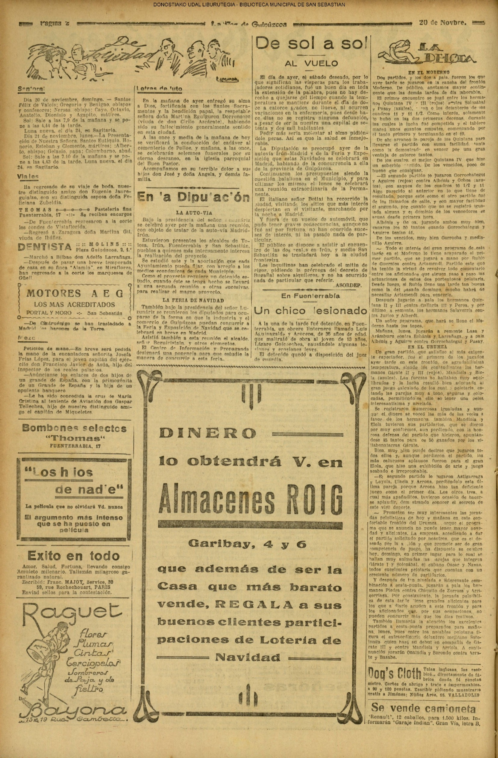 | 1925 - DE SOL A SOL (JUEVES) No hamos partido frio, que es lo principal. aunque el día fué sucio, feo, sin lux y con cara de invierno. Parecía uno de esos días característicos de las flestas de Navidad, que Invitan a no salir de casa y a reunirse las millas para celebrar la Pascua. Agua lenta, que permitía pasear sin gran temor a mojarso muche; niebla lejana, que cerraba el horizonte y achicaba los lejos del paisaje; humedad en las paredes y en los pisos, convertidos en des y brillantes espojos; y, en fin, un día de Invierno donostiarra: con agua, sin mucha luz, pero sin frio,(.....)