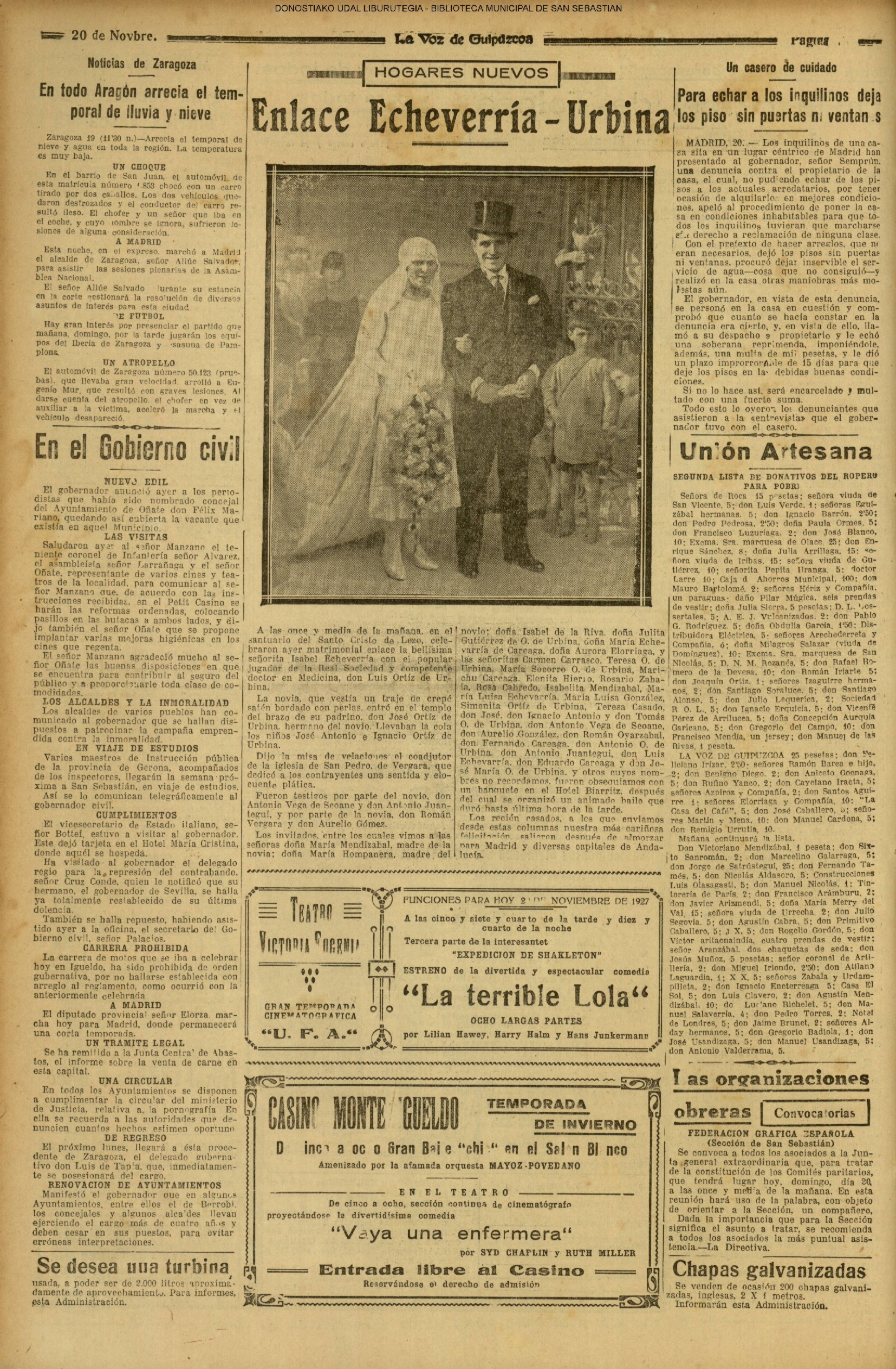 | 1927 - DE SOL A SOL ((SÁBADO) - El día , el sábado deseado, por lo que significan las visperas para los traba-jadores cotidianos, fué un buen día en toda la extensión de la palabra, pues no hay de-recho a quejarse del tiempo cuando la tem-peratura se mantiene durante el dia de do-ce a catorce grados, no llueve, ni ocurren variaciones en la enfermeria, pues desde ha-ce días no se registra ninguna defunción, a pesar de ser la nuestra una capital de se-tenta y dos mil habitantes (....)