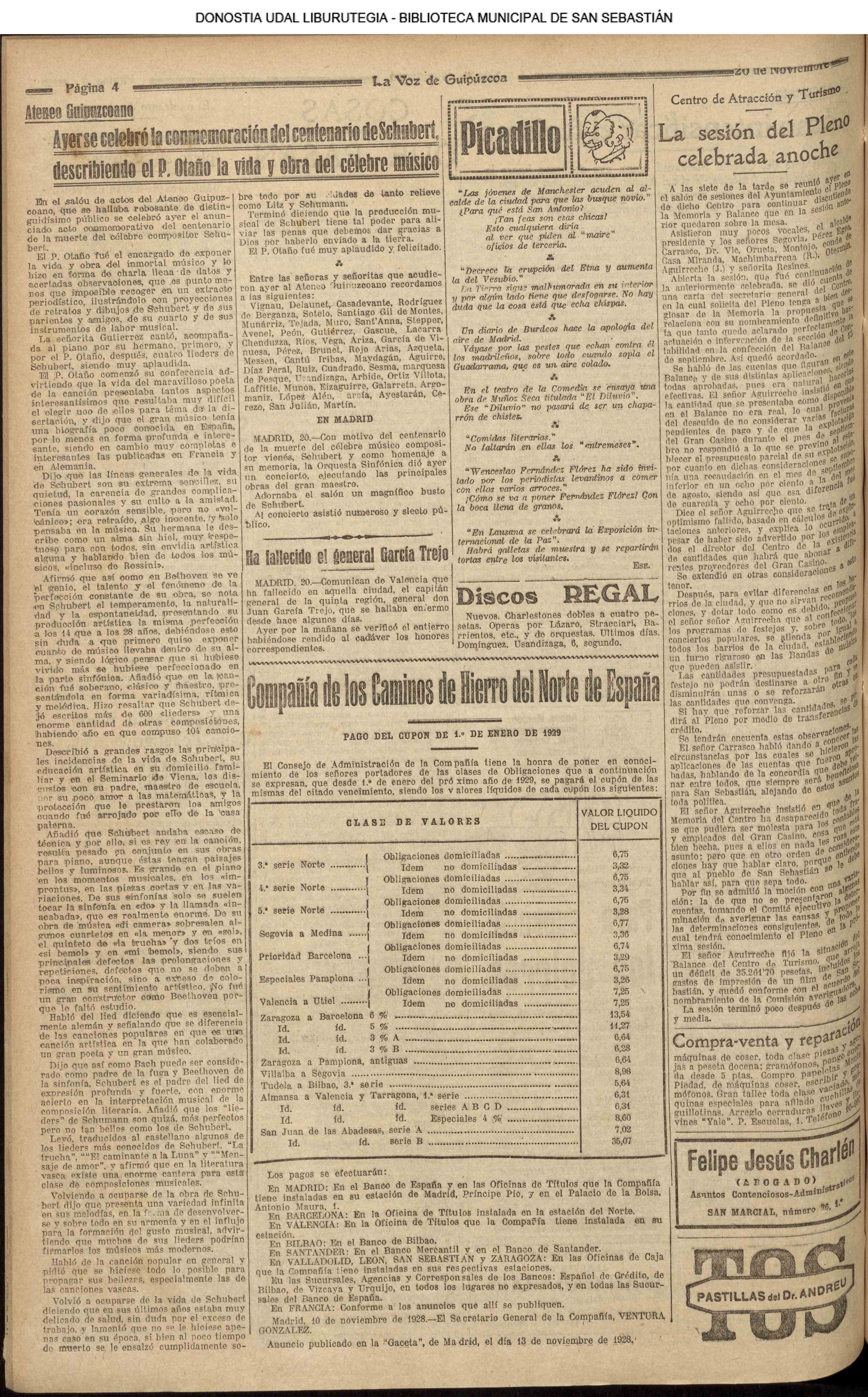 # ATENEO GUIPUZCOANO - Se celebró la conmemoración del centenario de Schubert, describiendo el P. Otaño la vida y obra del célebre músico