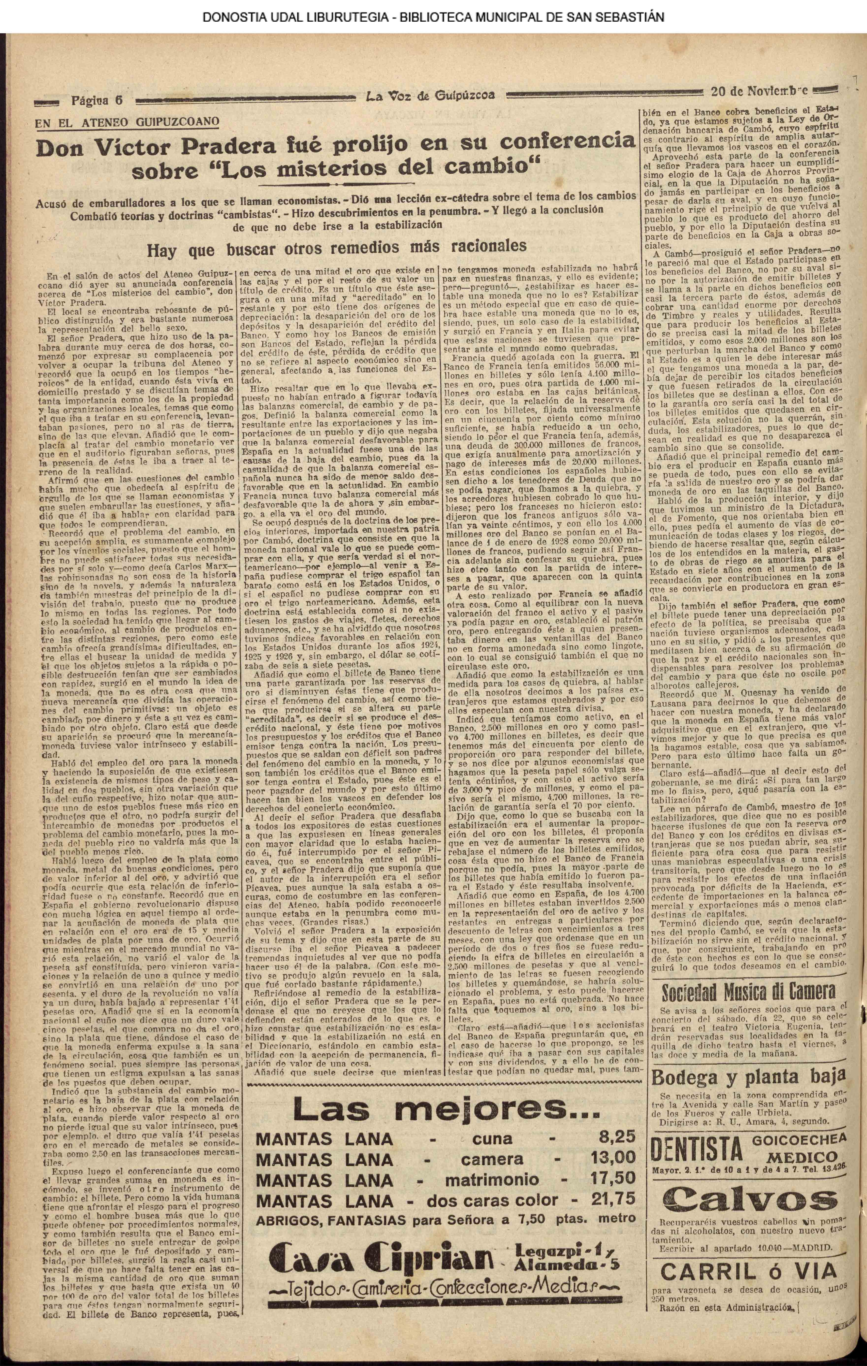 # EN EL ATENEO GUIPUZCOANO - Don Victor Pradera fué prolijo en su conferencia sobre "Los misterios del cambio" - Acusó de embarulladores a los que se llaman economistas. - Dió una lección ex-cátedra sobre el tema de los cambios - Combatió teorías y doctrinas "cambistas". - Hizo descubrimientos en la penumbra. - Y llegó a la conclusión de que no debe irse a la estabilización