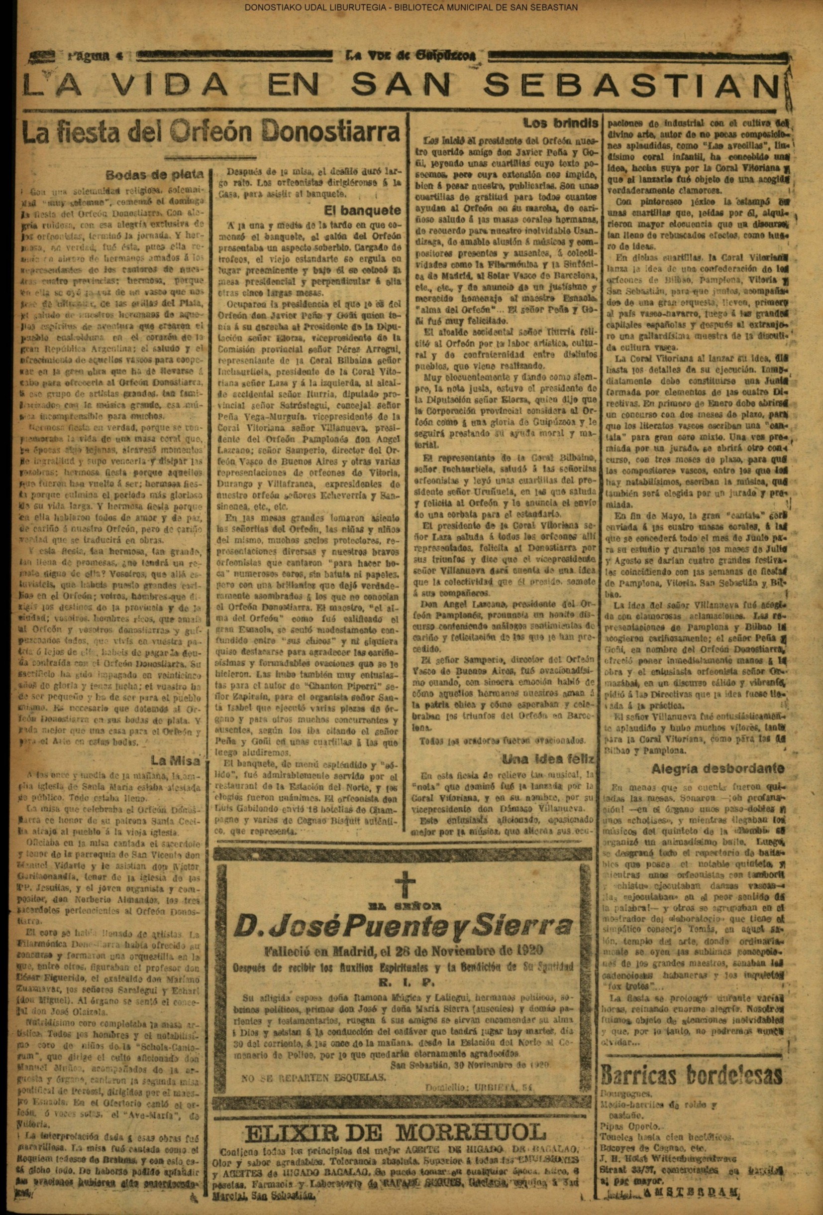 (1920) Con diversos actos celebra el Orfeón Donostiarra sus bodas de Plata. Era presidente D.Javier Peña y Goñi.