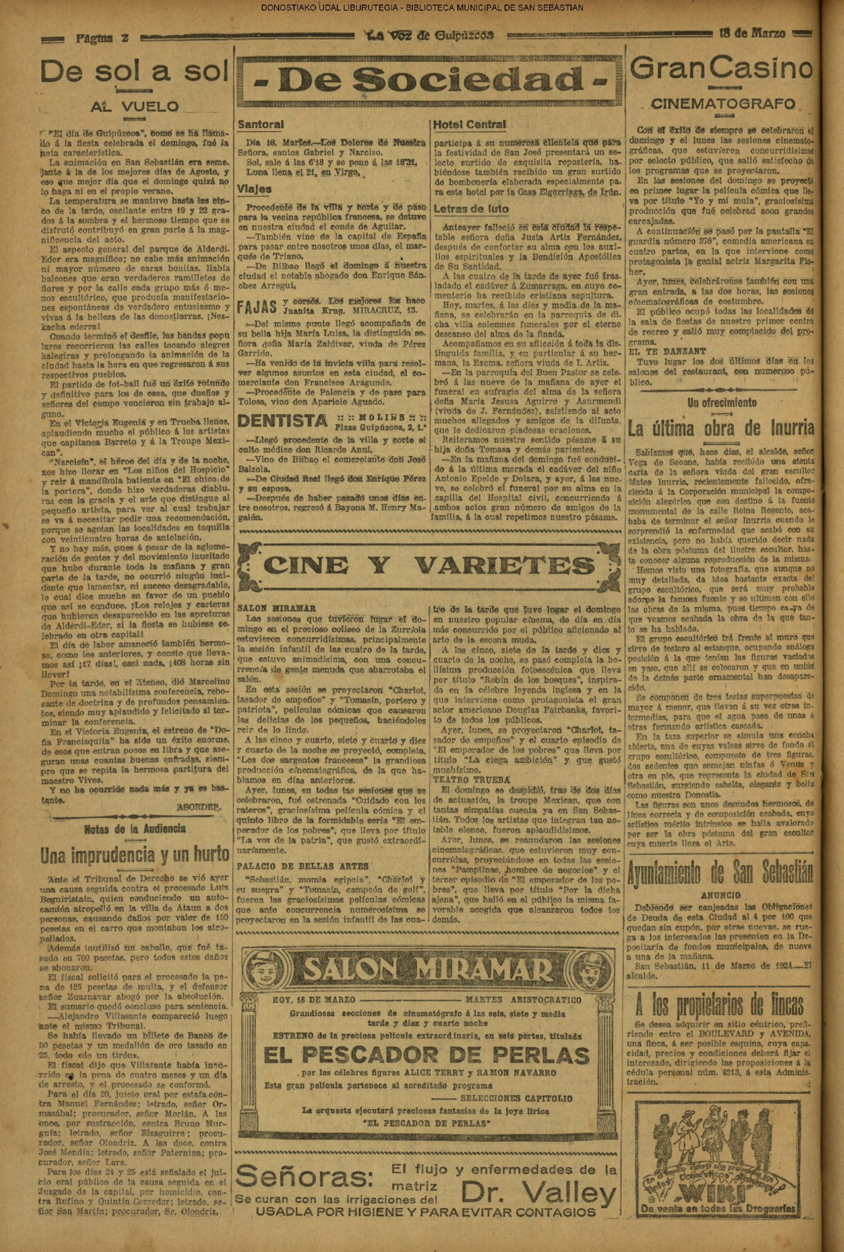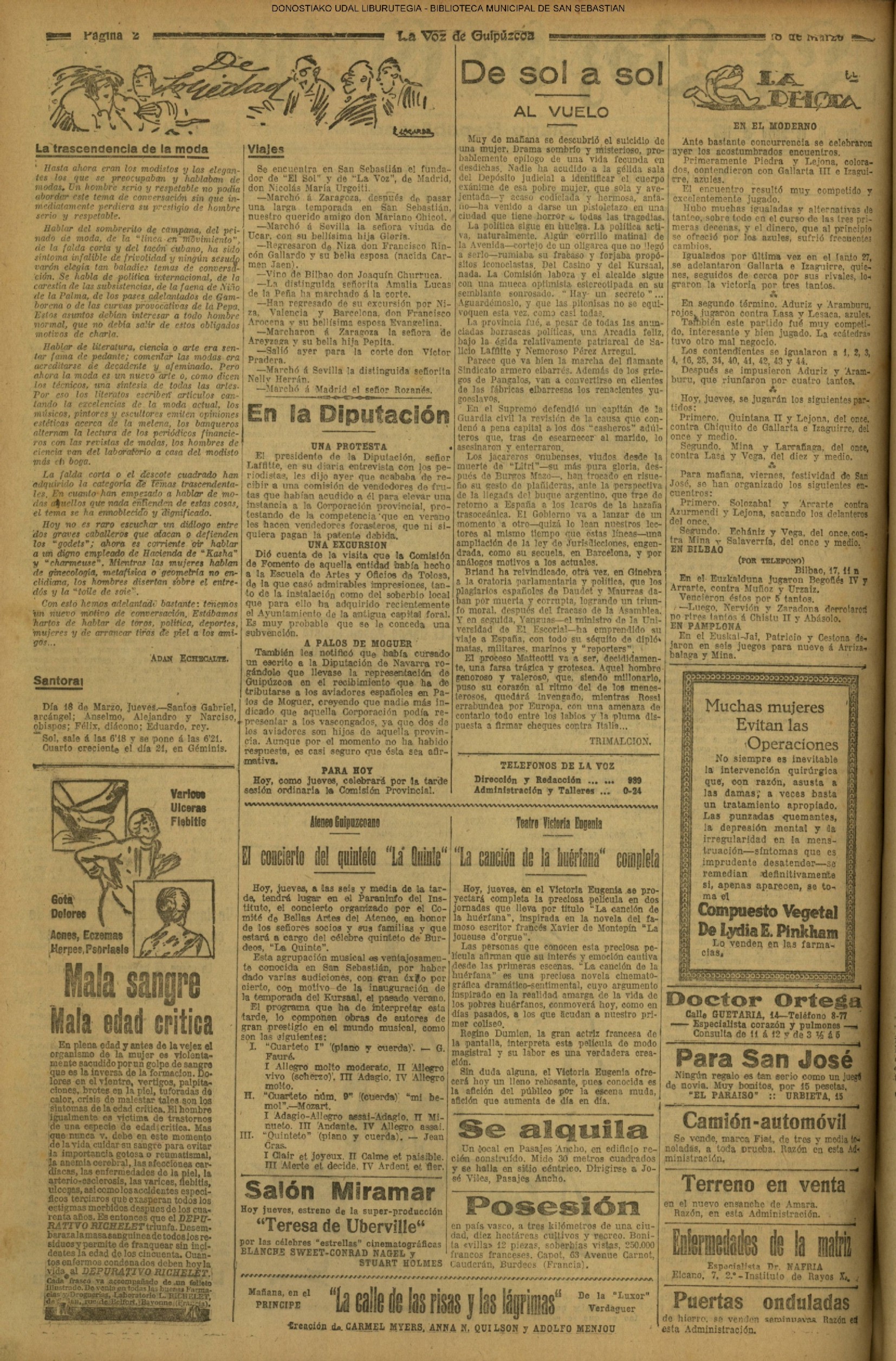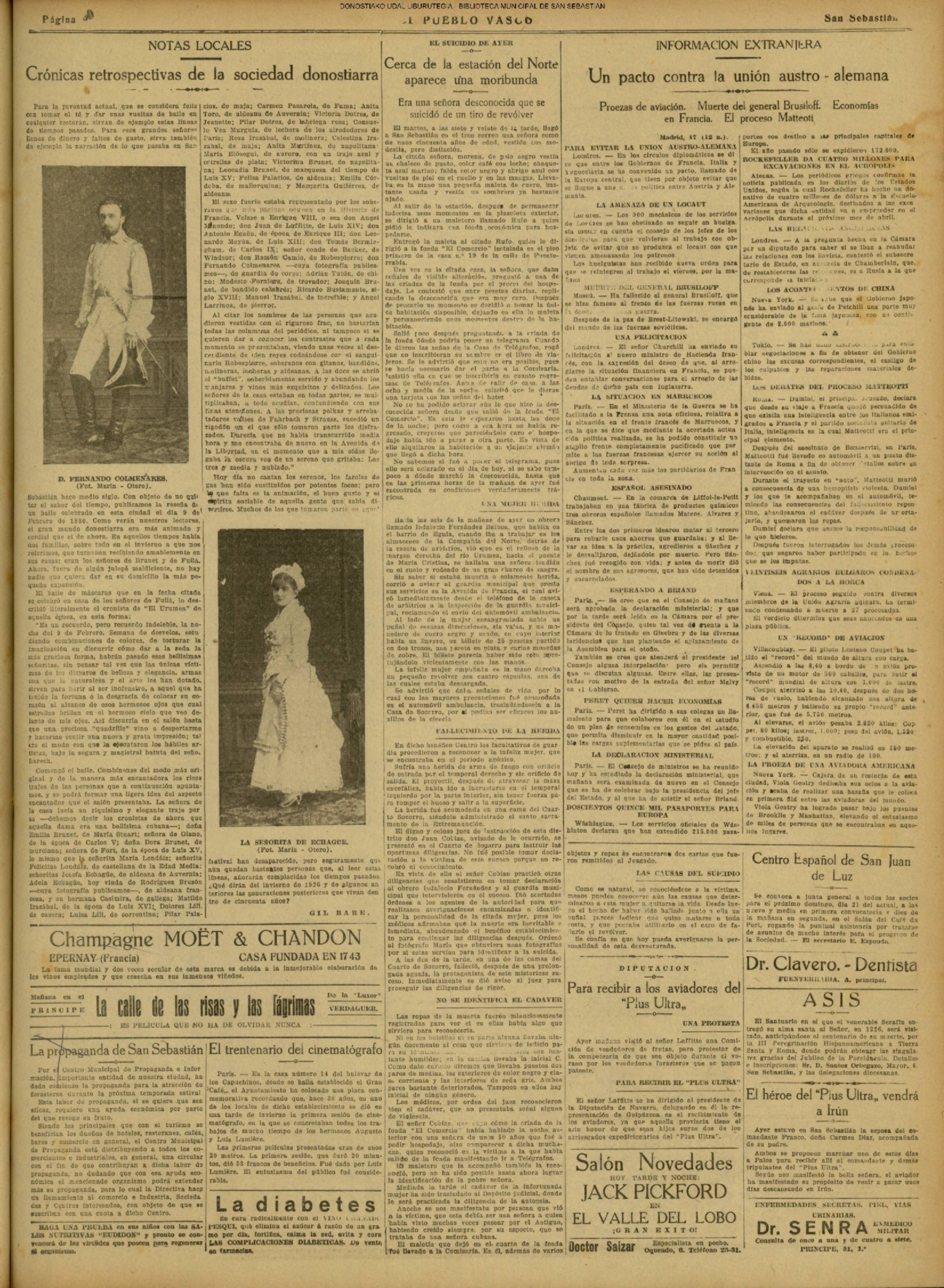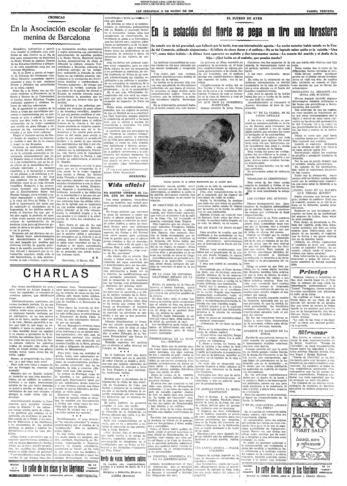 (La Voz de Guipúzcoa)(El Pueblo Vasco)(El Pais Vasco)(La Constancia) # Un suicidio en extrañas circunstancias (La Voz de Guipúzcoa)(El Pueblo Vasco)(El Pais Vasco)(La Constancia) (1927) (La Voz de Guipúzcoa)(El Pueblo Vasco)(El Pais Vasco)(La Constancia) (1930) - En varios cines simultaneamente - Victoria Eugenia, Príncipe,Miramar, Bellas Artes, Trueba- se inicia la proyección de películas sonoras (1930) En presencia de todo el personal de la Casa, el presidente del Consejo de Administración del Banco Guipuzcoano, D. Victoriano de Celaya, impone a D. Paulino García Ubierna, conserje del Banco y funcionario de éste desde la fundación del mismo, la Medalla de! Trabajo.(La Voz de Guipúzcoa)(El Pueblo Vasco)(El Pais Vasco)(La Constancia)