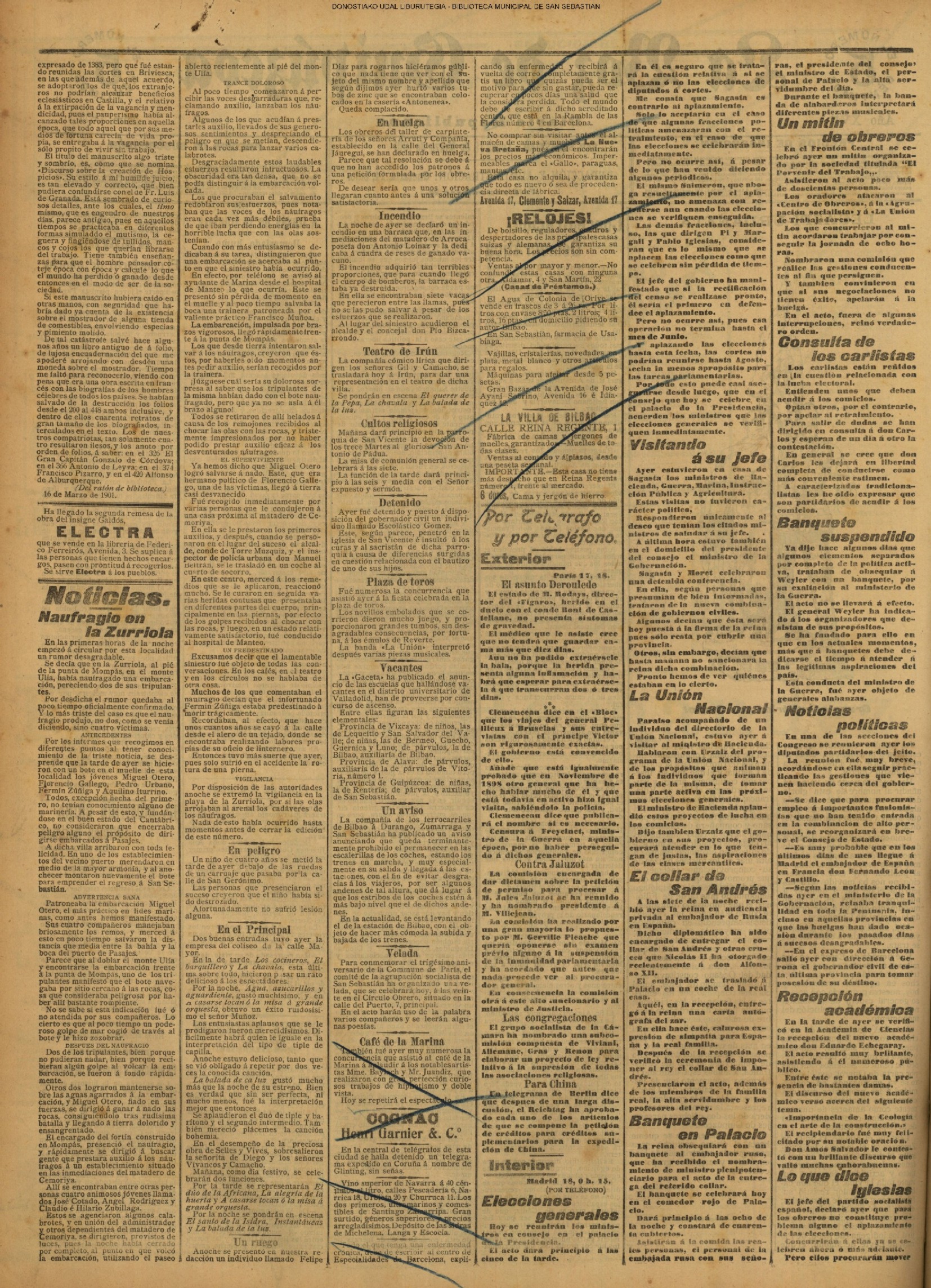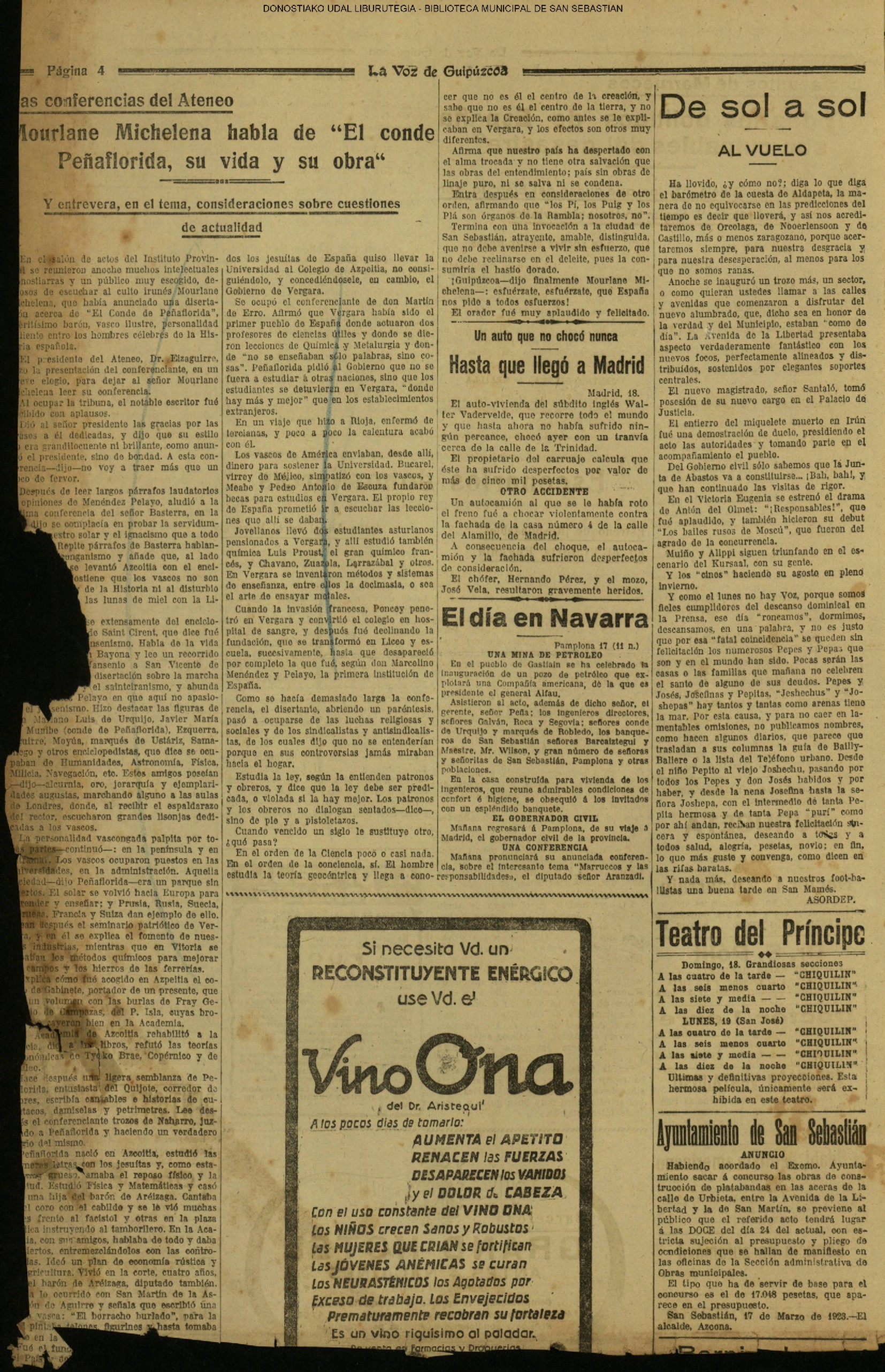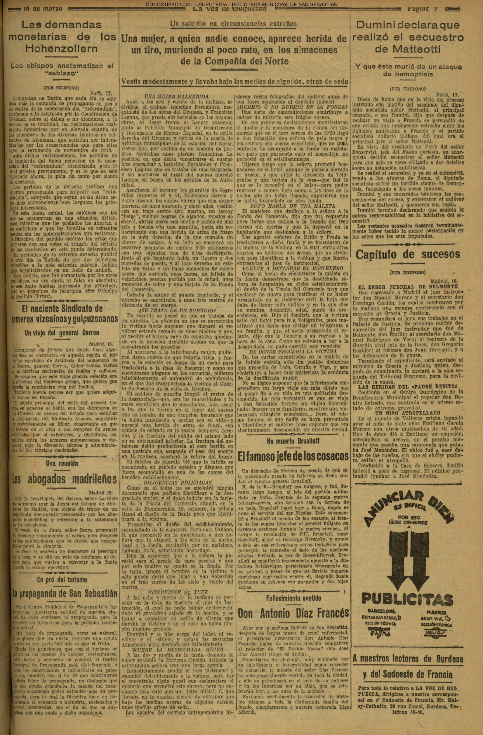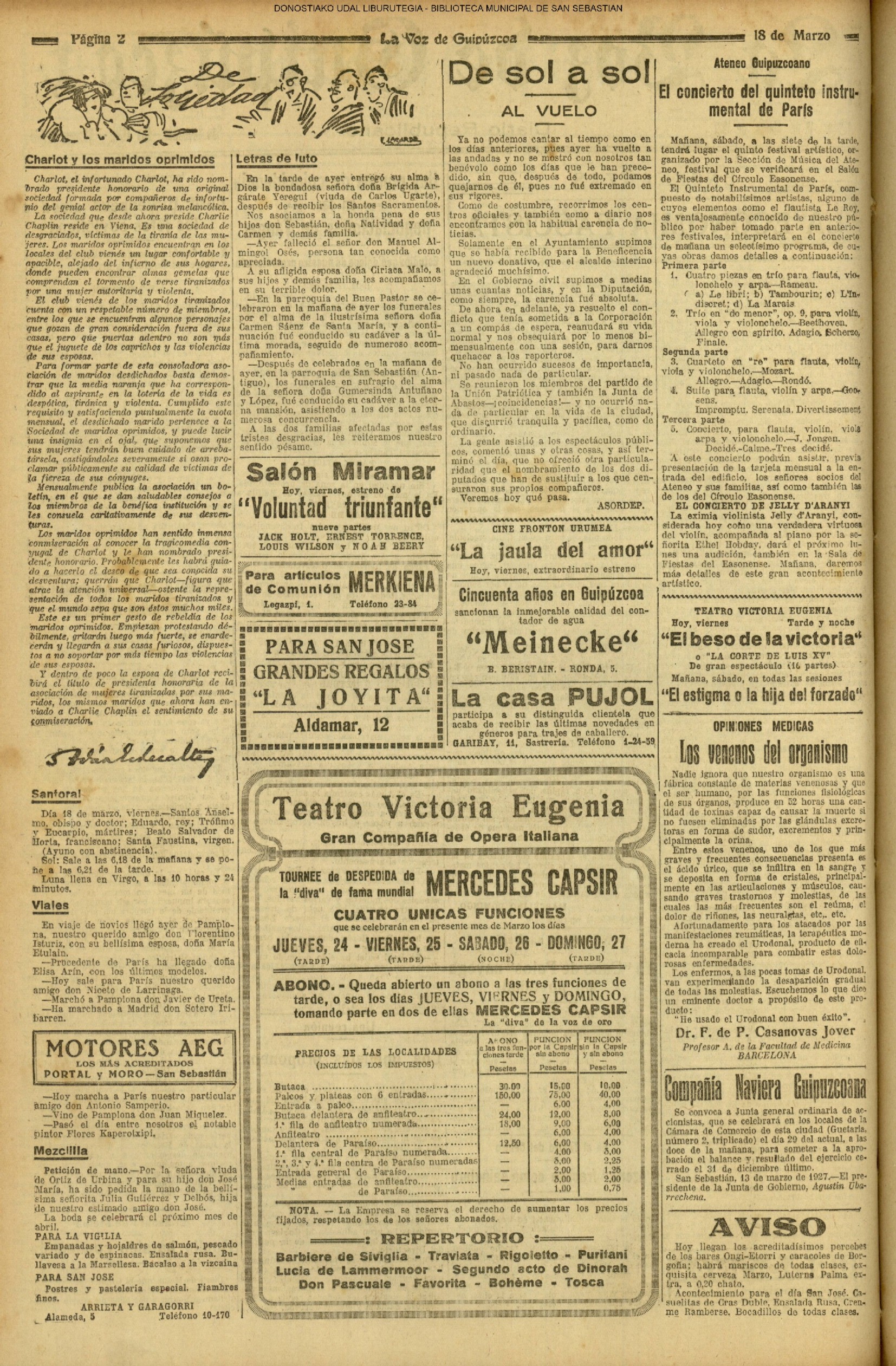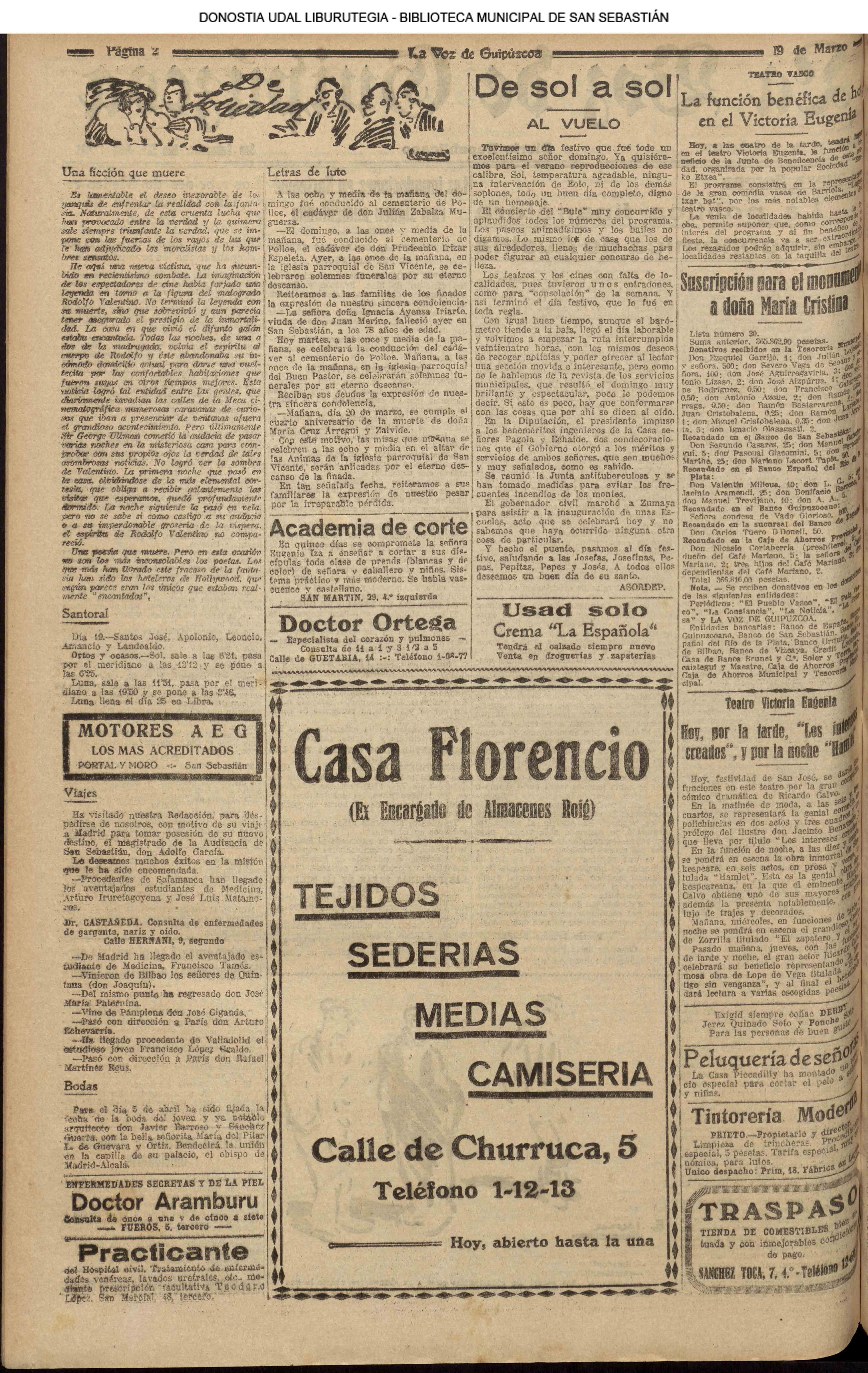 (La Voz de Guipúzcoa)(El Pueblo Vasco)(El Pais Vasco)(La Constancia) # Un suicidio en extrañas circunstancias (La Voz de Guipúzcoa)(El Pueblo Vasco)(El Pais Vasco)(La Constancia) (1927) (La Voz de Guipúzcoa)(El Pueblo Vasco)(El Pais Vasco)(La Constancia) (1930) - En varios cines simultaneamente - Victoria Eugenia, Príncipe,Miramar, Bellas Artes, Trueba- se inicia la proyección de películas sonoras (1930) En presencia de todo el personal de la Casa, el presidente del Consejo de Administración del Banco Guipuzcoano, D. Victoriano de Celaya, impone a D. Paulino García Ubierna, conserje del Banco y funcionario de éste desde la fundación del mismo, la Medalla de! Trabajo.(La Voz de Guipúzcoa)(El Pueblo Vasco)(El Pais Vasco)(La Constancia)
