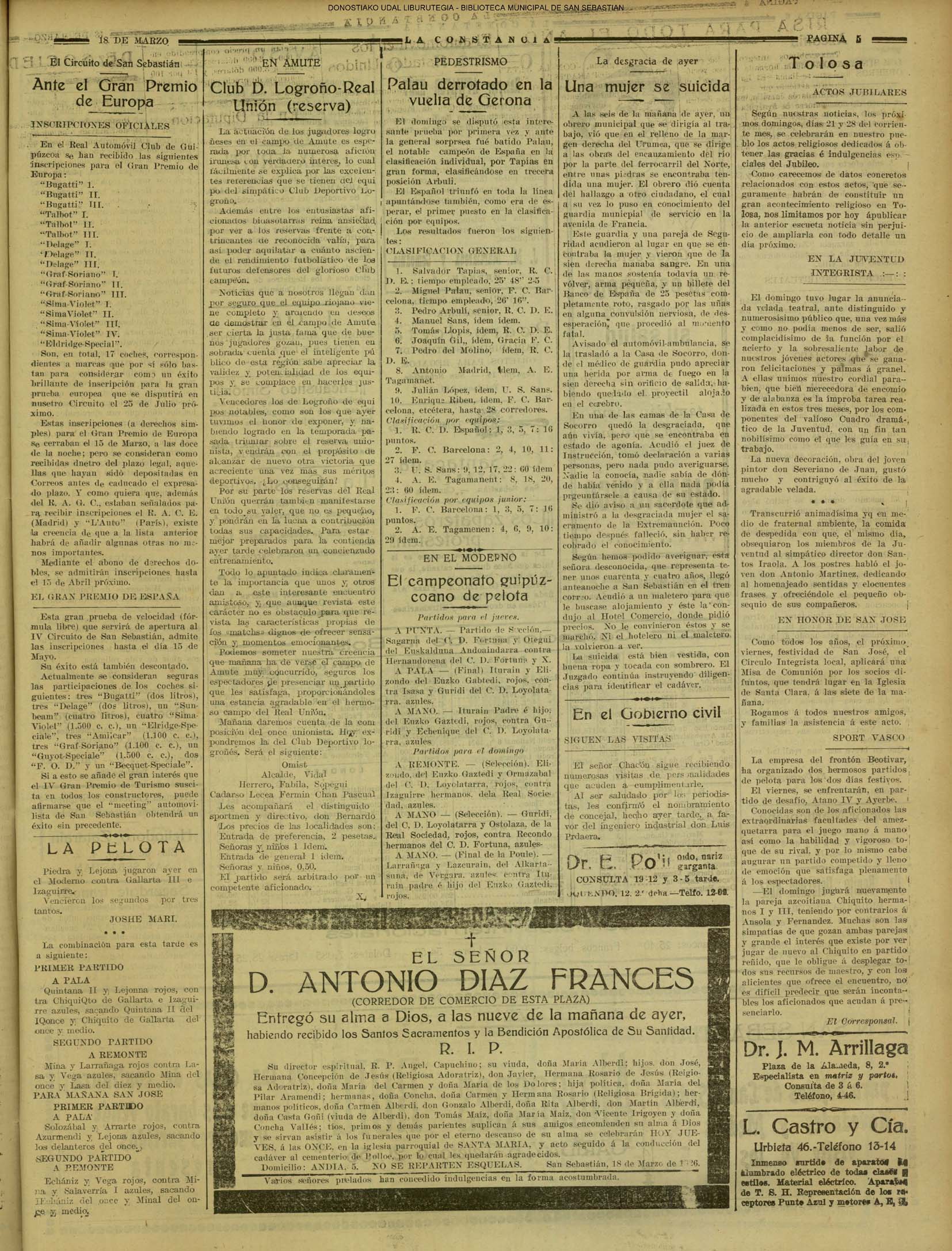 (1901) Domingo. En las proximidades de Mompas naufraga esta tarde un bote en el que paseaban Fermín Zúñiga, Pedro Urbano, Aquilino Iturrino, Florencio Gallego, Miguel Otero. Se ahogaron todos, excepto el último.(La Voz de Guipúzcoa) (1902) Ante el notario señor Berasategui, se constituye la Sdad. «Fomento de San Sebastián».(La Voz de Guipúzcoa) (1907) (1912) (1913) REAL SOCIEDAD (1917) (1922) (1926) - Circular del Gobernador civil poniendo trabas a las apuestas y "encaminada a evitar la industrialización perniciosa de las pruebas de hachas"