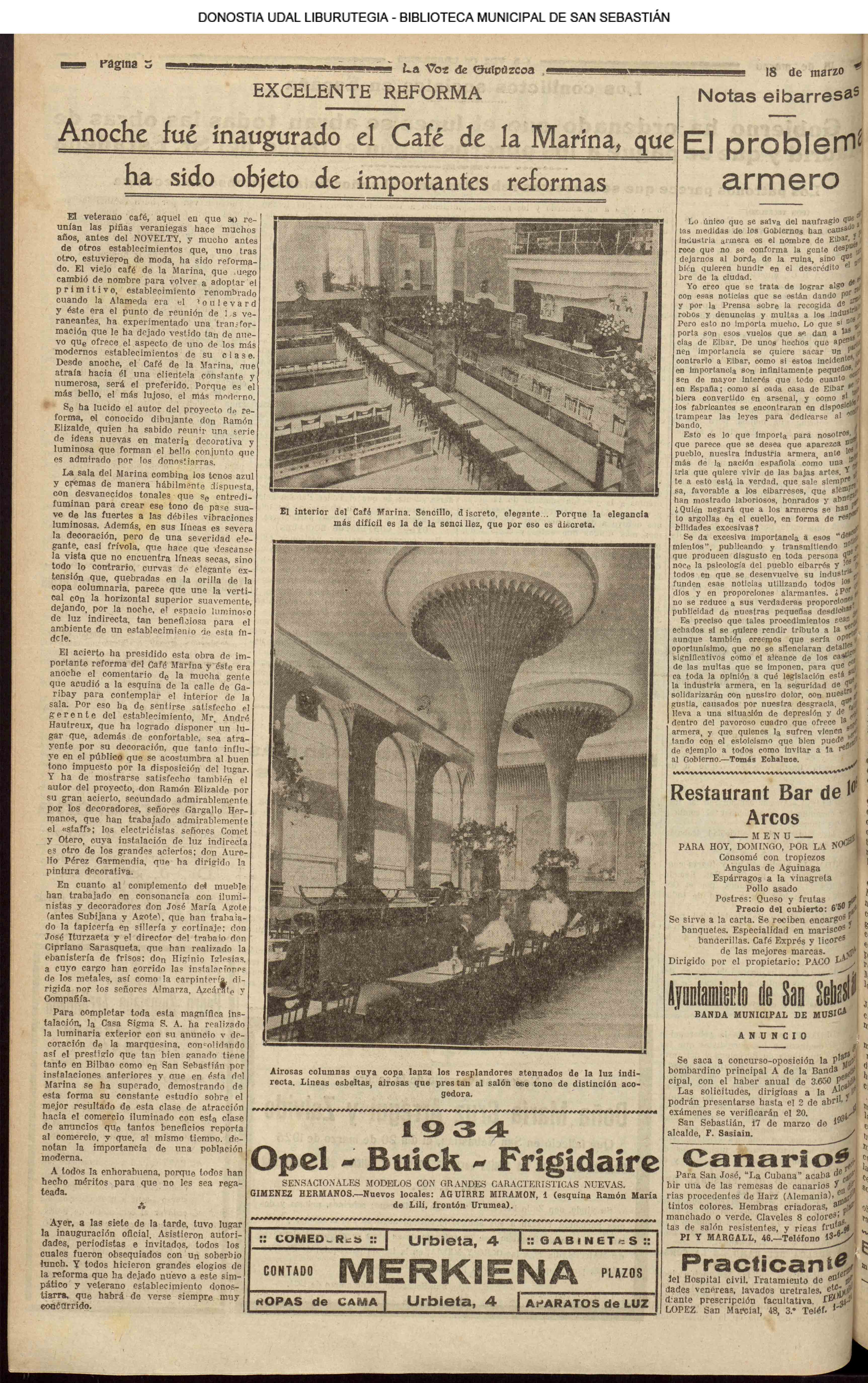 (1932) (1934)- REINAUGURACIÓN : Es inaugurado el Café de la Marina que ha sido objeto de importantes reformas (La Voz de Guipúzcoa)(El Pueblo Vasco)(El Día)(La Constancia) (1937) GUERRA CIVIL (LA VOZ DE ESPAÑA)(UNIDAD)(EL DIARIO VASCO) (1938)GUERRA CIVIL (LA VOZ DE ESPAÑA)(UNIDAD)(EL DIARIO VASCO) (1939)GUERRA CIVIL (LA VOZ DE ESPAÑA)(UNIDAD)(EL DIARIO VASCO) (1942) (1947) - El gobernador-presidente del Patronato de Protección a la Mujer oficia al alcalde: "Que la Guardia Municipal nos provea del mayor número posible de datos respecto a las mujeres de conducta torcida (.....) así como de cuantos hechos y circunstancias provoquen la ruina moral de las mismas (.....). Todo ello con la finalidad de dignificar a la mujer, apartarlas del vicio y educarlas con arreglo a las enseñanzas de la Iglesia Católica" (LA VOZ DE ESPAÑA)(EL DIARIO VASCO) (1952) (1957) (LA VOZ DE ESPAÑA) (1962) (1967) (LA VOZ DE ESPAÑA)(UNIDAD) (1970) - Reunión con RENFE para tratar de la construcción de un paso subterráneo bajo la estación, a la altura del puente de María Cristina. La construcción de la Torre de Atocha ha agravado el problema de comunicación entre ambos lados de la vía férrea. (LA VOZ DE ESPAÑA)(UNIDAD) (1972) (LA VOZ DE ESPAÑA)(UNIDAD) (1977)(LA VOZ DE ESPAÑA)(UNIDAD) (1978) - ATENTADO - Fortísima explosión de un generador de la Central nuclear de Lemóniz (LA VOZ DE ESPAÑA)(UNIDAD) (1997) (EL DIARIO VASCO) |