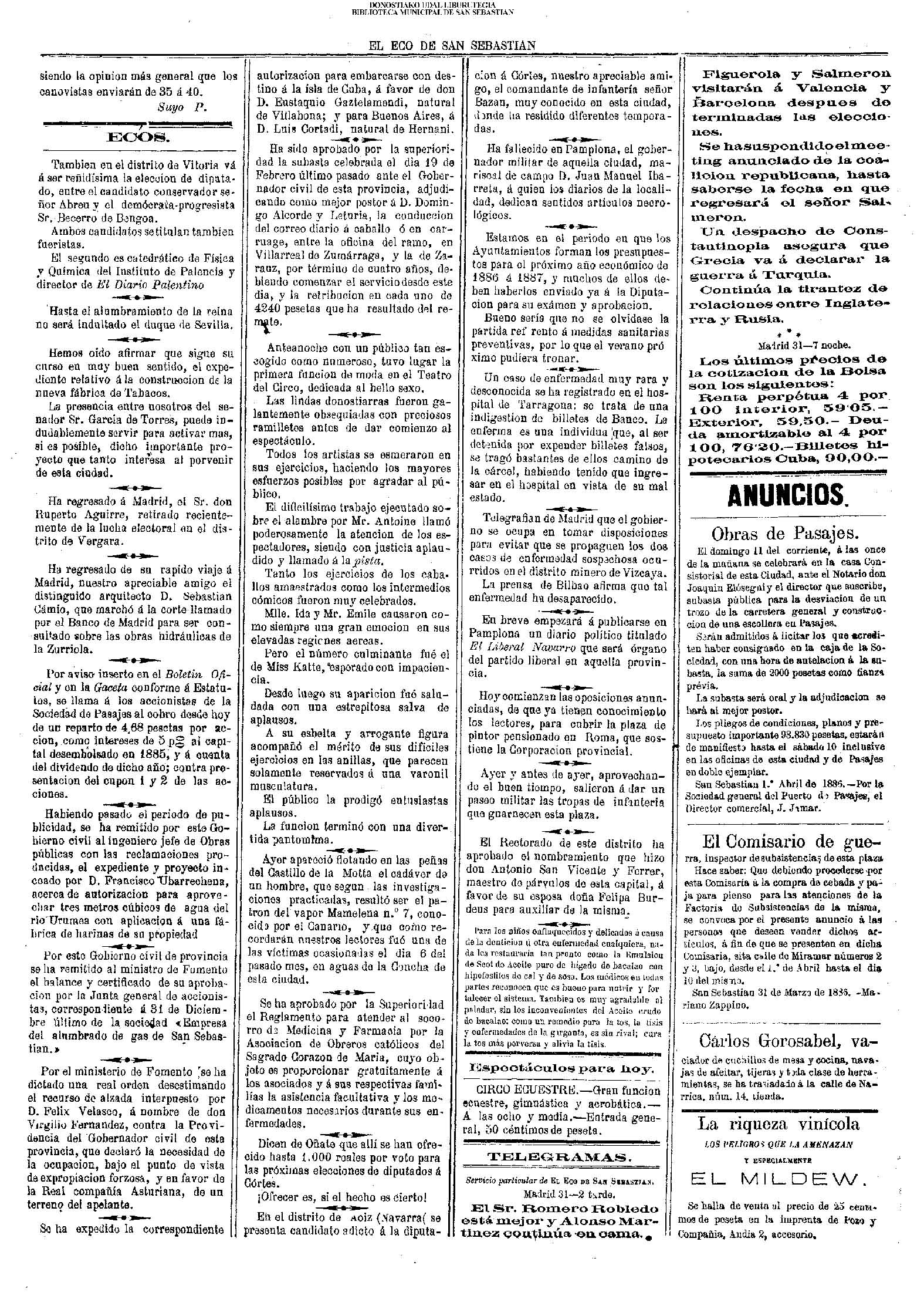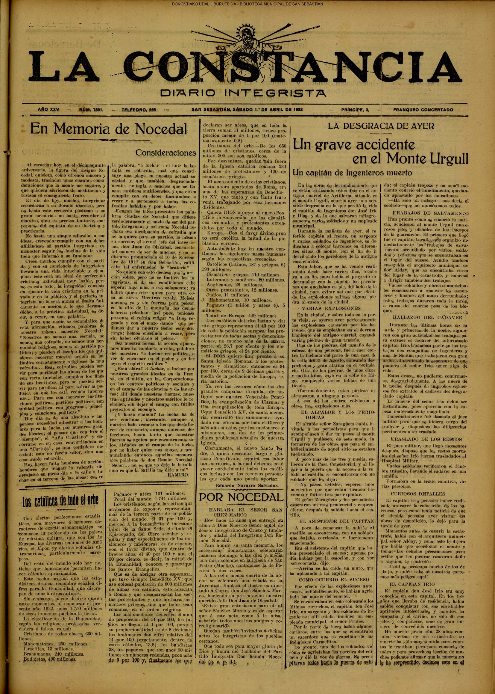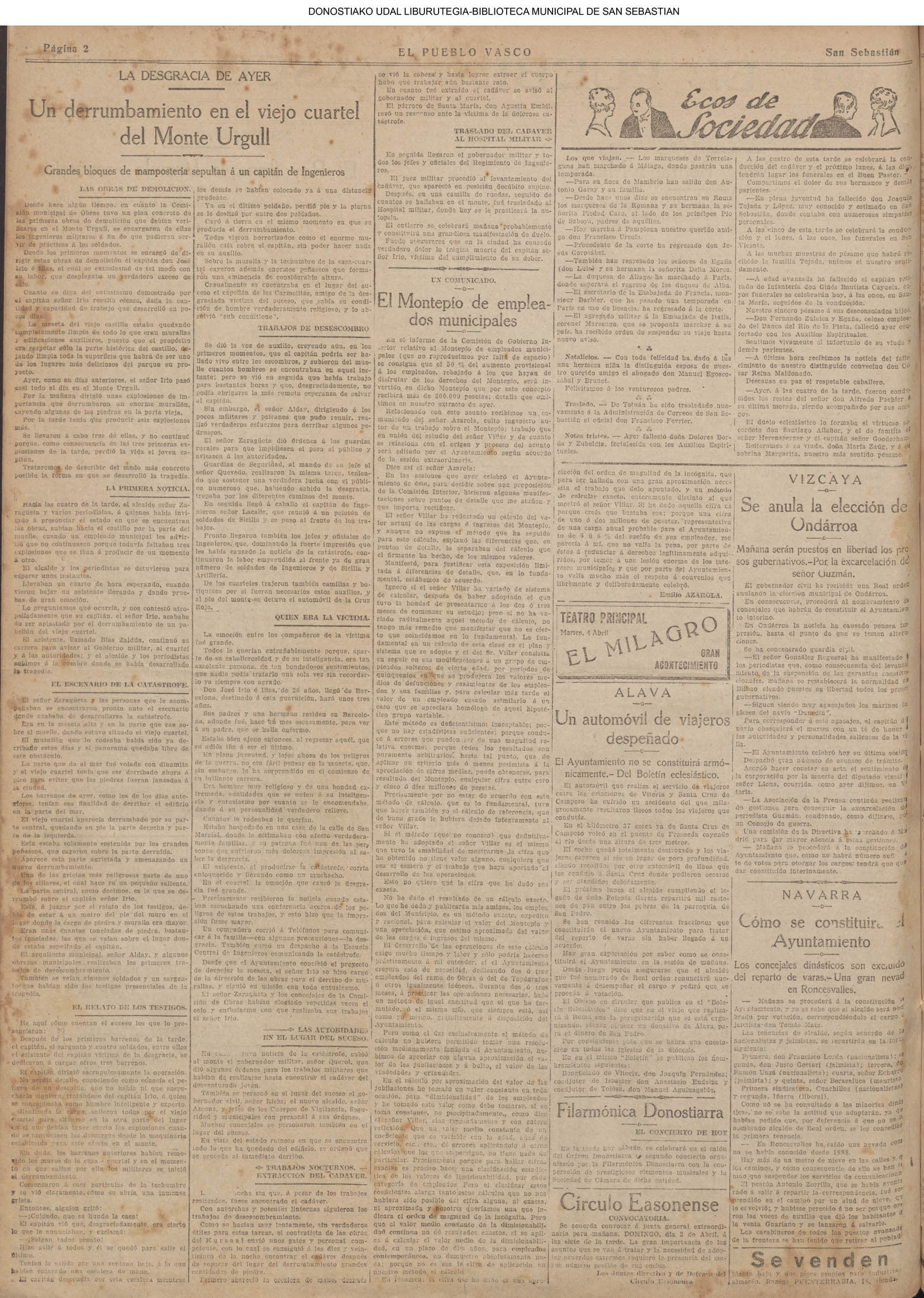 (1900) En el sudexpreso, llega de Madrid el nuevo gobernador civil de Guipúzcoa, D. Enrique Vivanco. (1903) El Ayuntamiento aprueba los planos y presupuestos para la construcción del edificio para el servicio de desinfección municipal en terrenos de Arroca, cuyo coste era de 25.382 pesetas. (1920) Emilio Pisón publica su primer libro de versos: “Sonatas ingenuas”. (1922) - SUCESO : Comienza la demolición de casamatas militares en el Castillo. El capitán de artilleria José Irio, que dirige las voladuras, es herido de muerte al caerle encima una gran piedra. Este suceso supone la paralización del derribo, y el acertado acuerdo municipal de mantener Urgull en su esencia militar.(El Pueblo Vasco) (La Constancia) (1944) Se cierra y desaparece el bar «Iribas», en cuyos locales de Garibay 23 iba a instalarse después la pastelería de Otaegui.
