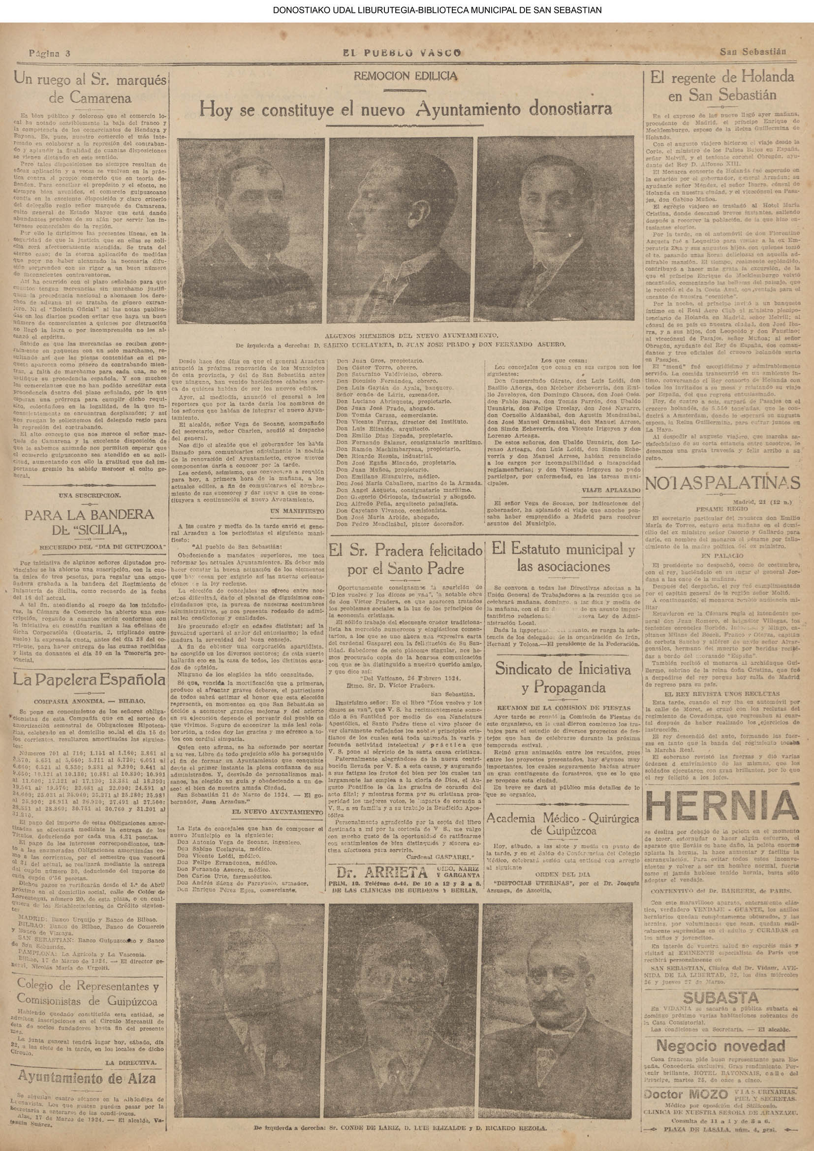 Parte del Concejo donostiarra — catorce señores— es destituida, reemplazada y ampliada por otros veintitrés, entre los que figuraban D. Saturnino Valdivielso, D. Luis Gaytán de Ayala, D. Luciano Abrisqueta, D. Juan José Prado,D. Tomás Carasa, D. Vicente Ferraz, D. Luis Elizalde, D. Fernando Salazar, D. José María Caballero, D. Ángel Azqueta, D. Gregorio Odriozola, D.Alfredo Peña, D. Cayetano Vivanco y D. José María Arbide. (La Voz de Guipúzcoa)(El Pueblo Vasco)(El Pais Vasco)(La Constancia)