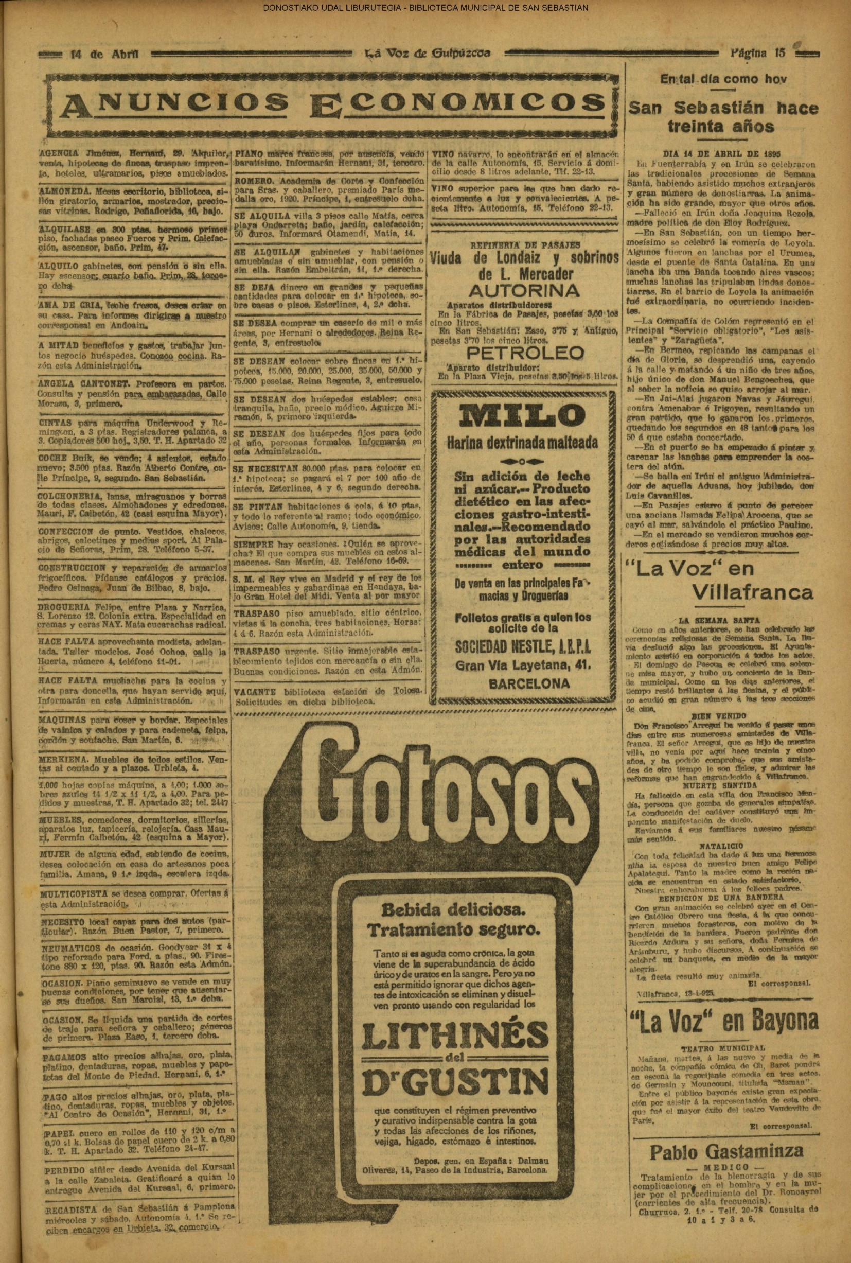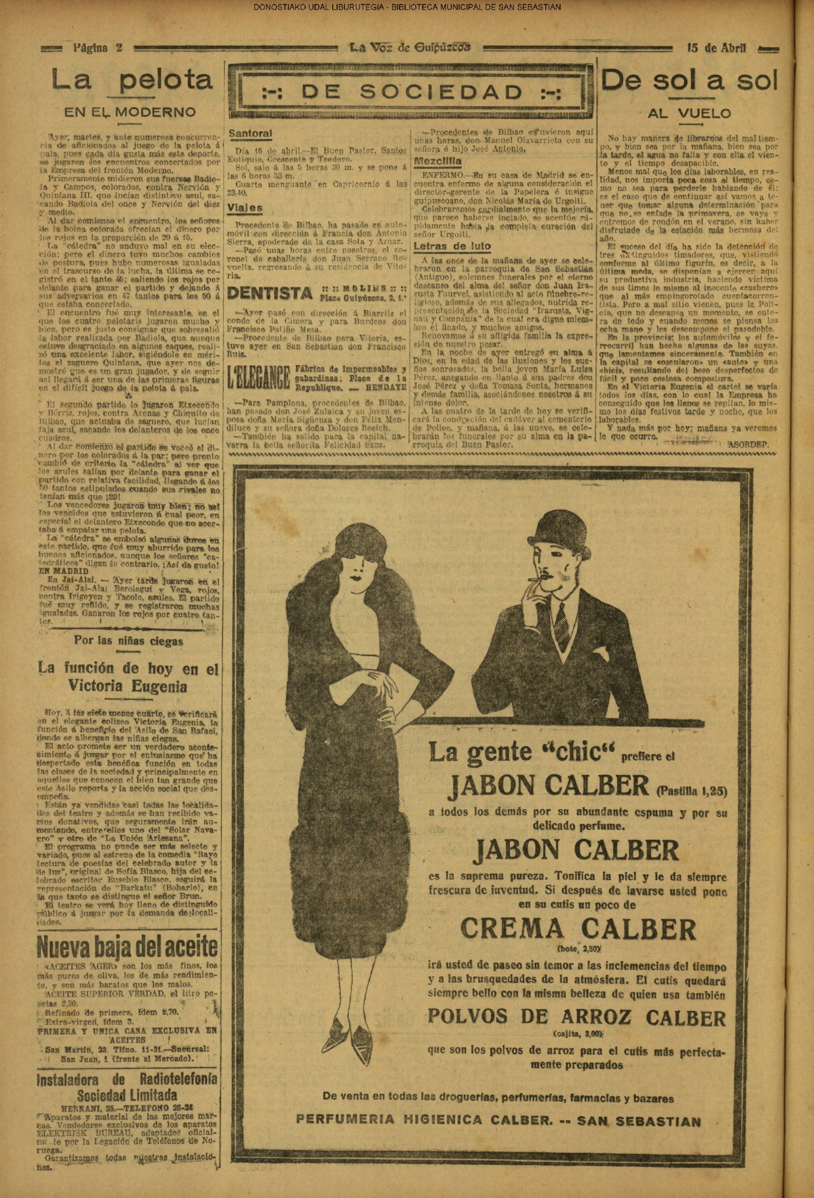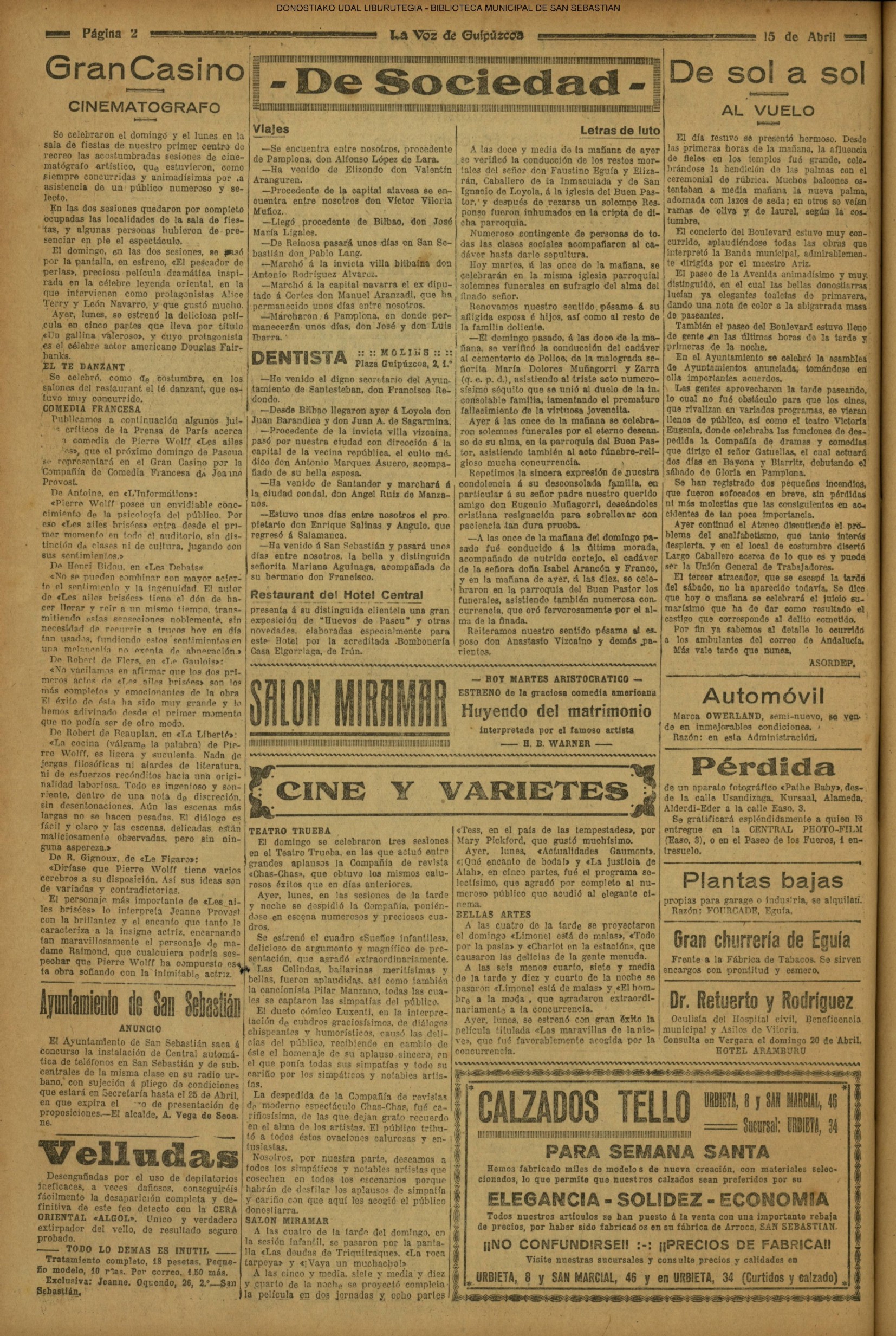 (*).-SESIÓN MUNICIPAL . "A las once de la mañana, celebró sesión ordinaria la Comisión Municipal Permanente, bajo la presidencia del señor Angulo y asistiendo los señores Olazábal, Puente, Conde de Fuerteventura, Sáenz Alonso y Ortiz de Urbina"......(EL DIARIO VASCO. (15/04).-pág.04 .- LA SESIÓN MUNICIPAL . "El Hospital militar es uno de los mejor instalados de España".- "Magnífica circular sobre las Escuelas inspirada en hondo espíritu de españolismo y catolicismo"......)