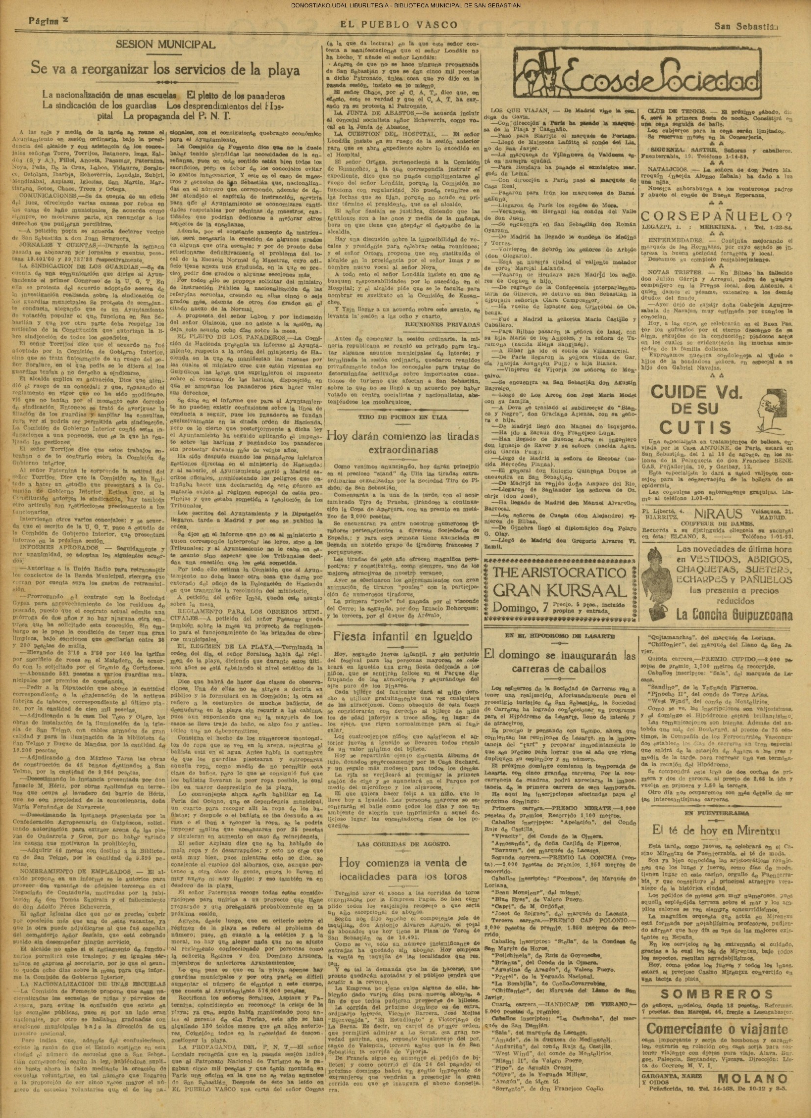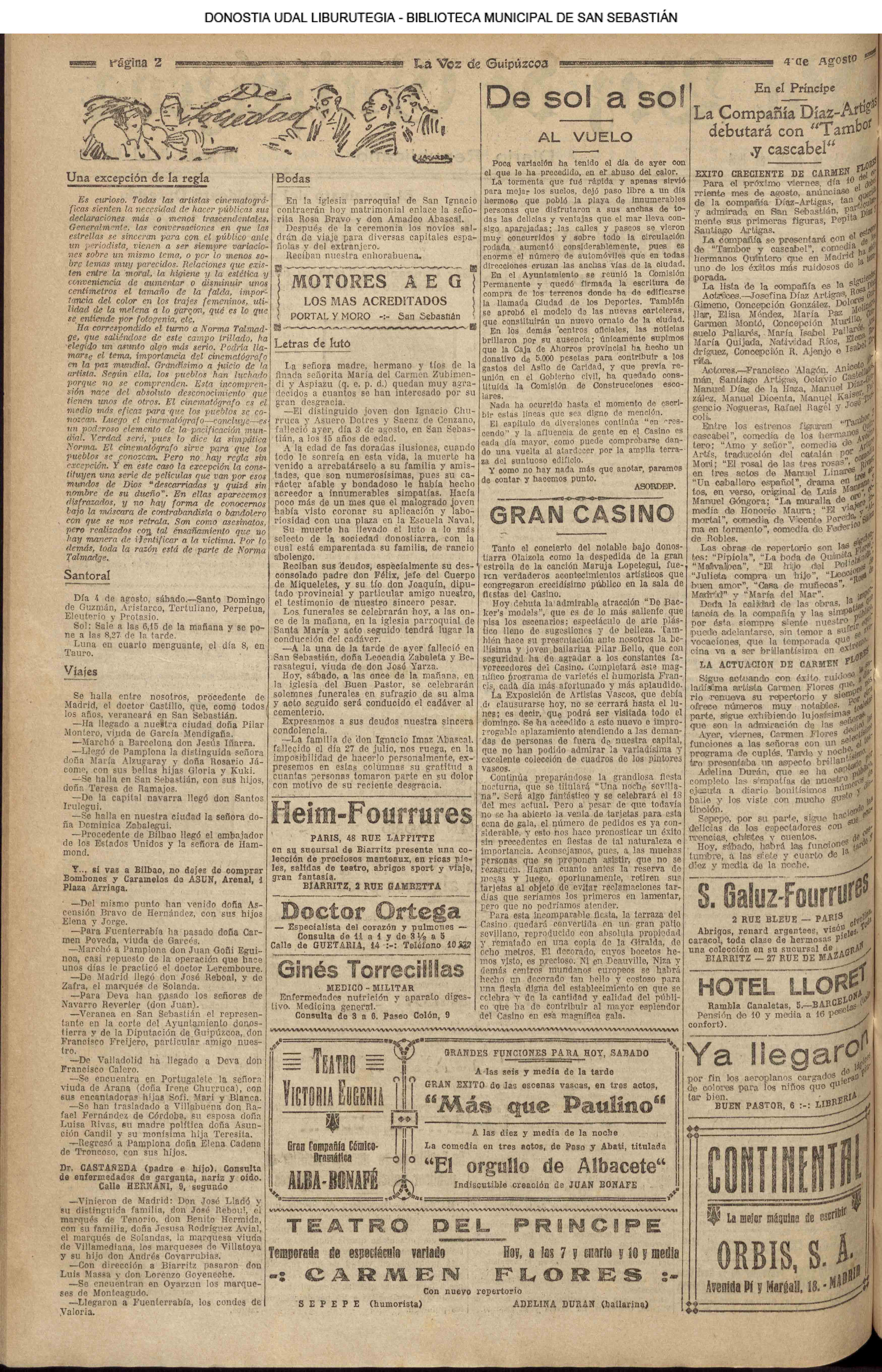 | 1924 - DE SOL A SOL (DOMINGO) - El día festivo fue muy bien aprovechado por las gentes para divertirse, cual corresponde a los días de descanso, en ese alto que todos hacemos cada seis días. Eso de todos, ya comprenderá el lector que es un decir, pues hay quien no trabaja aunque sude de ver trabajar, como el gallego del cuento. Pero, en fin, nos divertimos en la plaza viendo desencajonar los toros de las corridas de agosto, que son excelentes de presentación, carne y madera; se rió el público aplaudiendo a los Charlots en sus ridículas suertes cómicas,y se divirtió todo el mundo en cines y teatros, sobre todo en el Principal, viendo trabajar a Loreto y Chicote, y en Miramar, admirando a la Goya, que es la “estrella” del día pero de primera magnitud, es decir, de la categoría de los soles. Pasó el día de fiesta con una animación extraordinaria que se reflejaba principalmente en la terraza del Kursaal, donde por la tarde pasarían de dos mil las personas que allí se congregaron; lo mismo ocurrió en el “hall” y en el teatro, donde había momentos que no se podía mover el público (ASORDEP) (1924) TAURINAS.- Desencajonamiento de los toros que se habrán de lidiar durante las corridas de agosto.(La Voz de Guipuzcoa) |