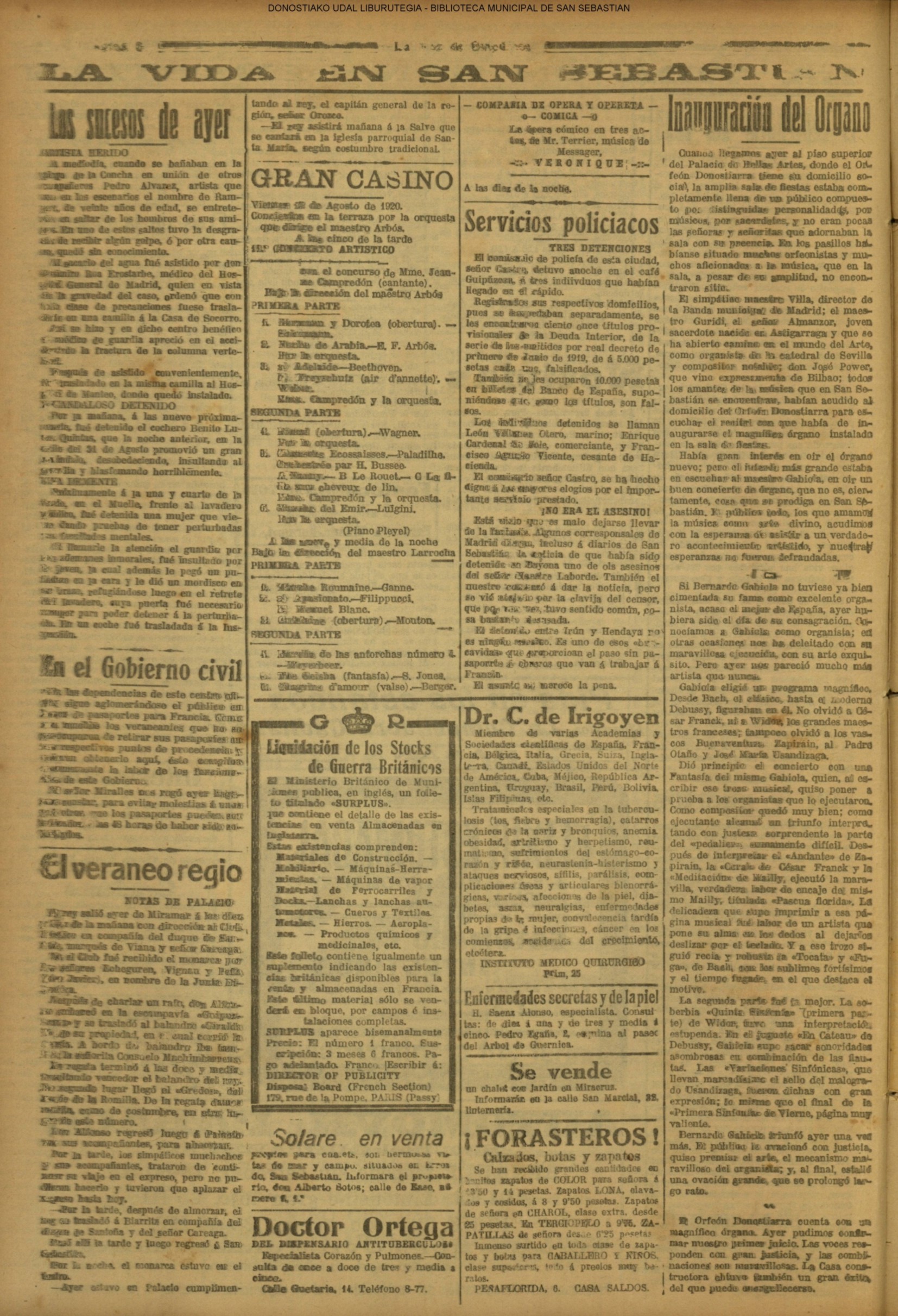 (1920) Concierto inaugural, esta tarde, en el órgano recientemente instalado en el salón —teatro del Orfeón Donostiarra, a cargo de don Bernardo de Gabiola, profesor del Conservatorio de Madrid y ex-director de la Banda Municipal de San Sebastián.