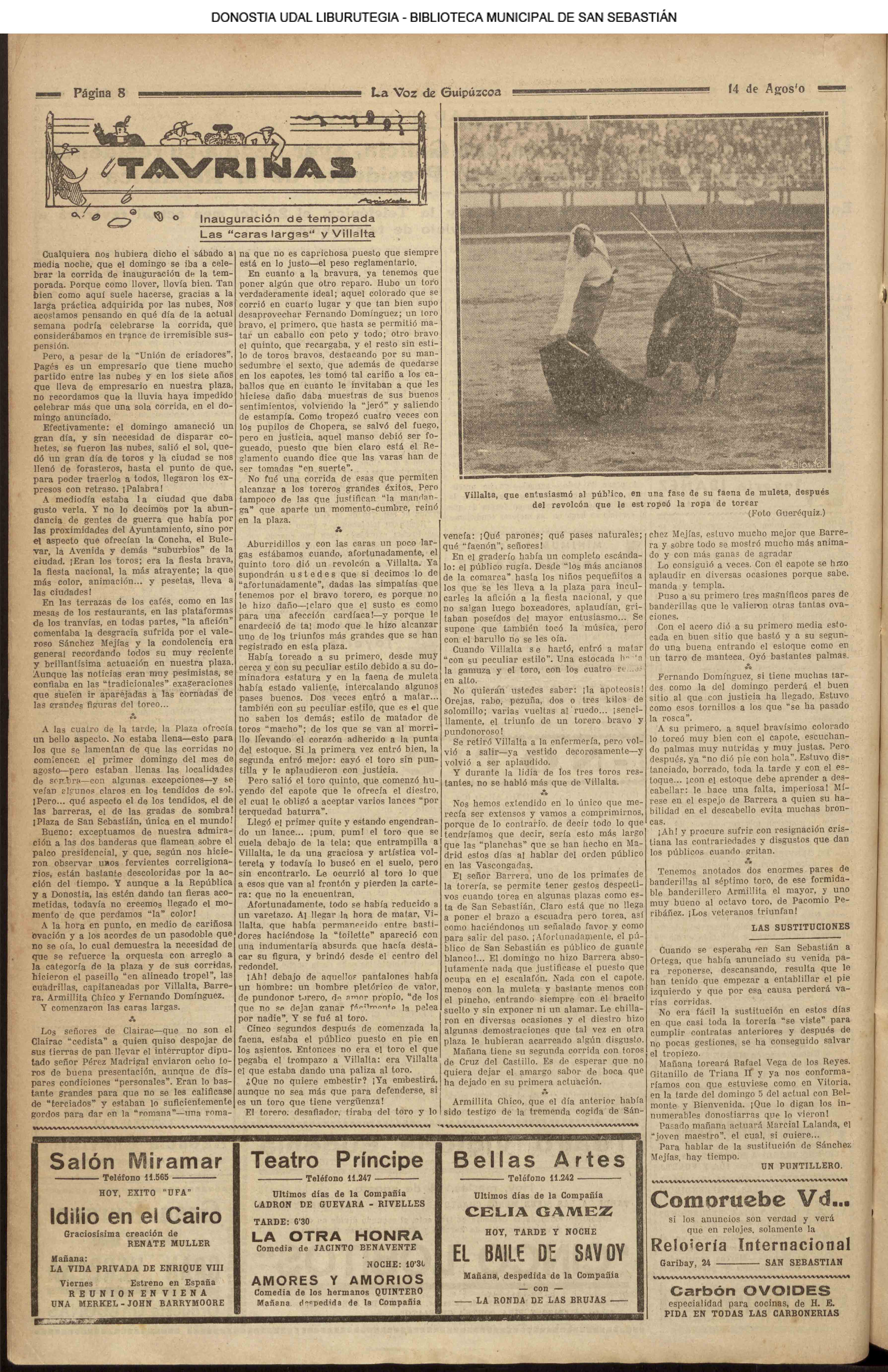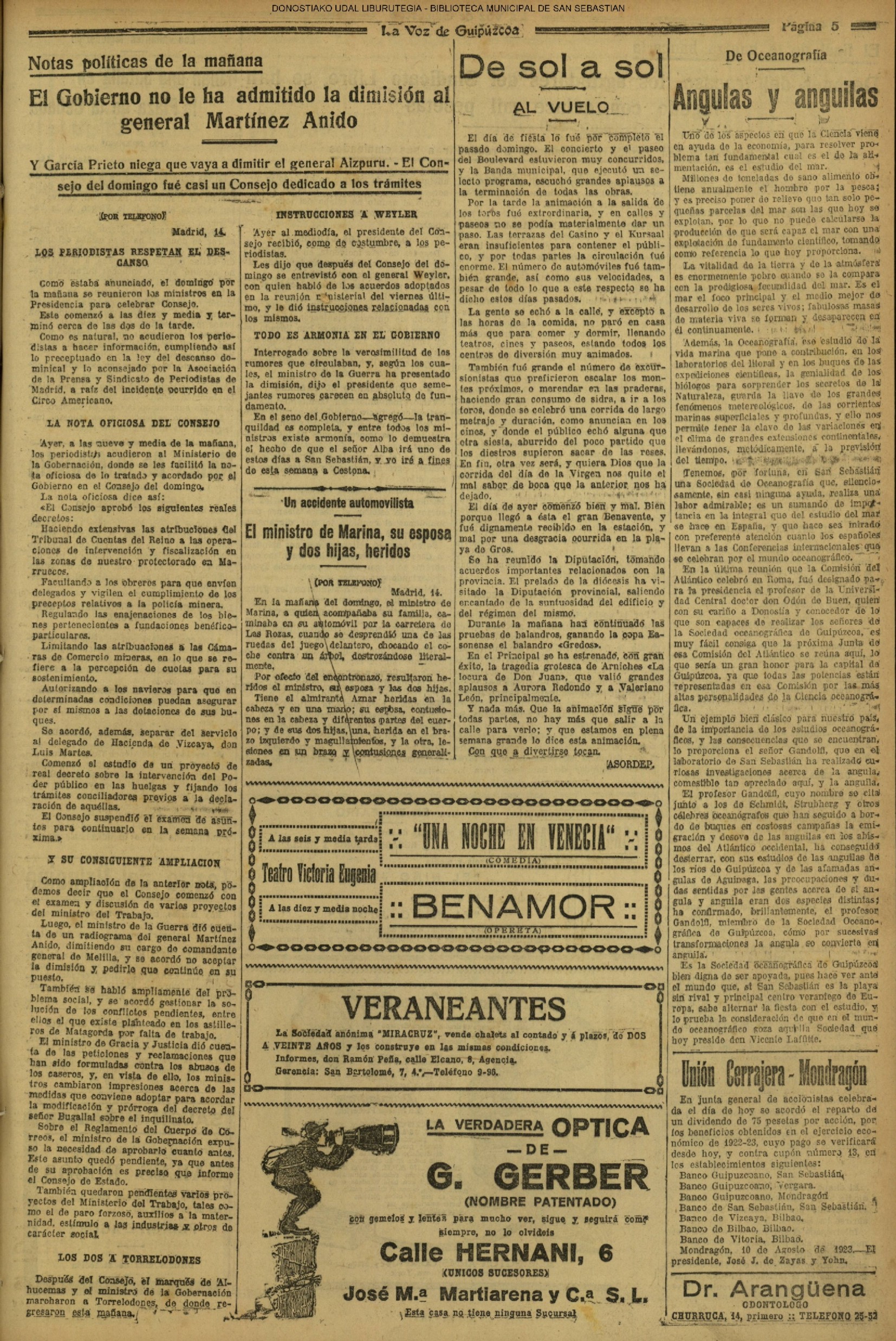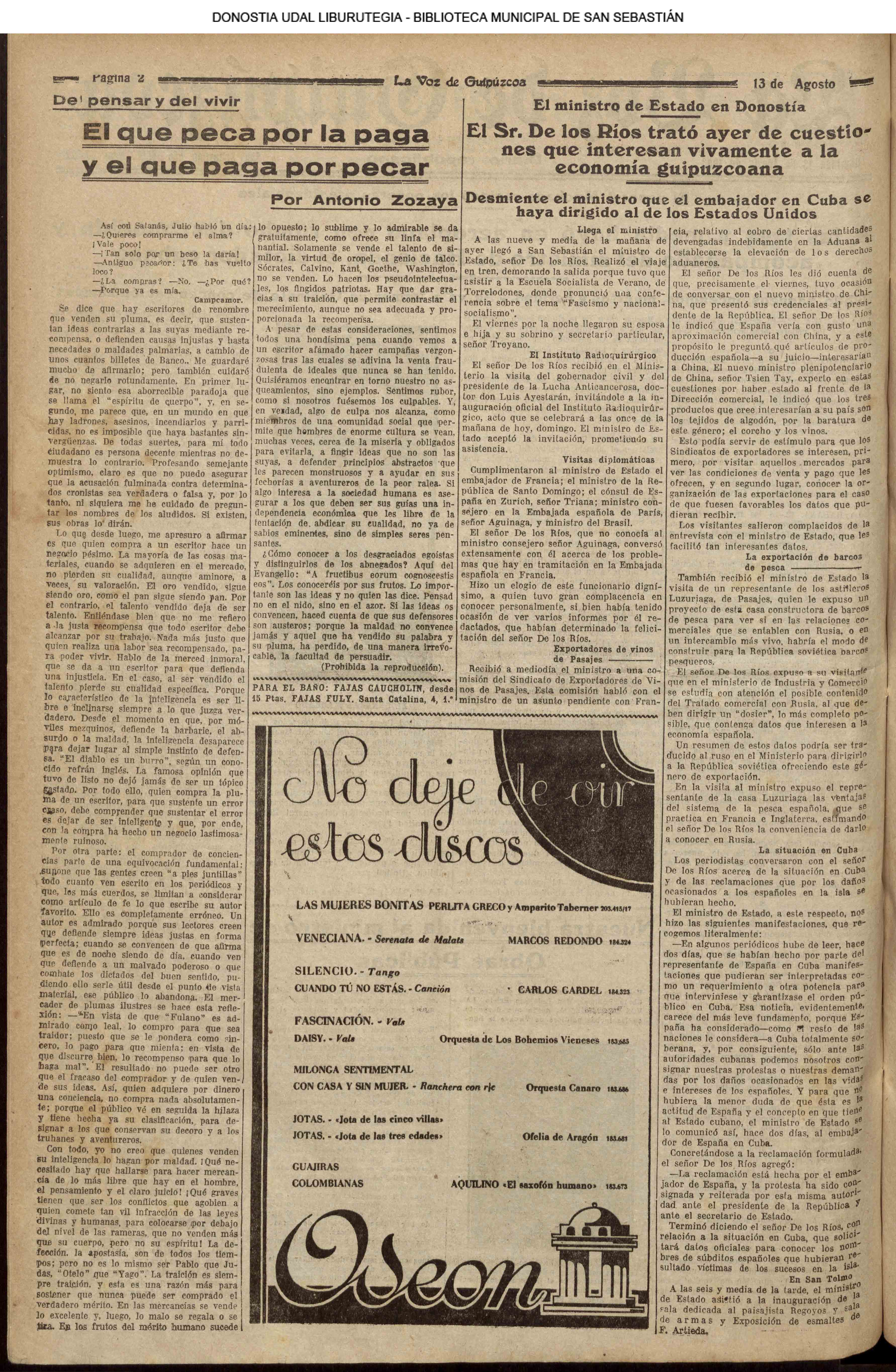 (1933) EL MINISTRO DE ESTADO (señor De los Ríos), LLEGA A SAN SEBASTIÁN (La Voz de Guipúzcoa)(El Pueblo Vasco)(El Día)(La Constancia)