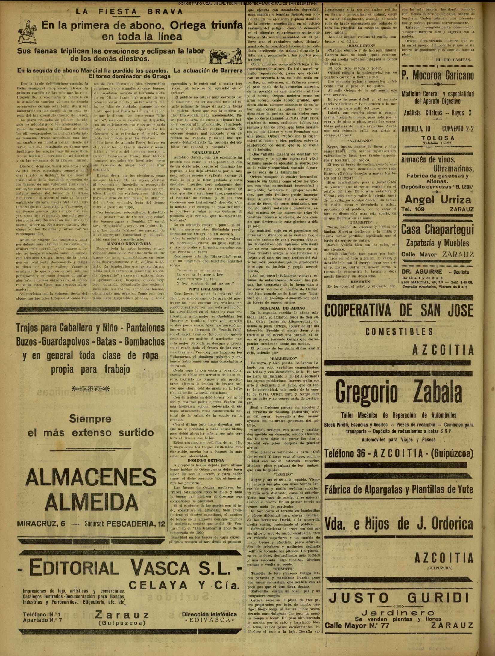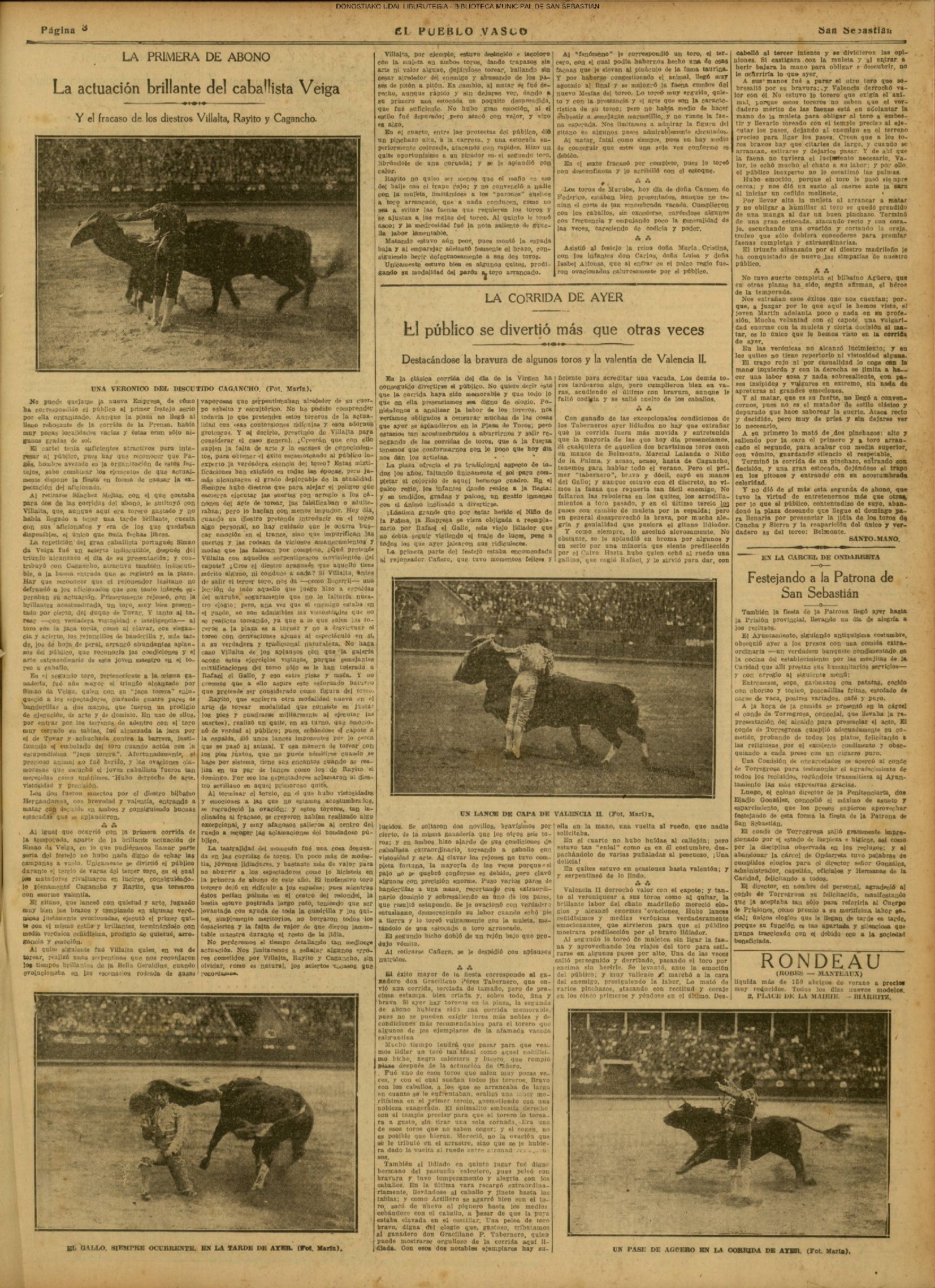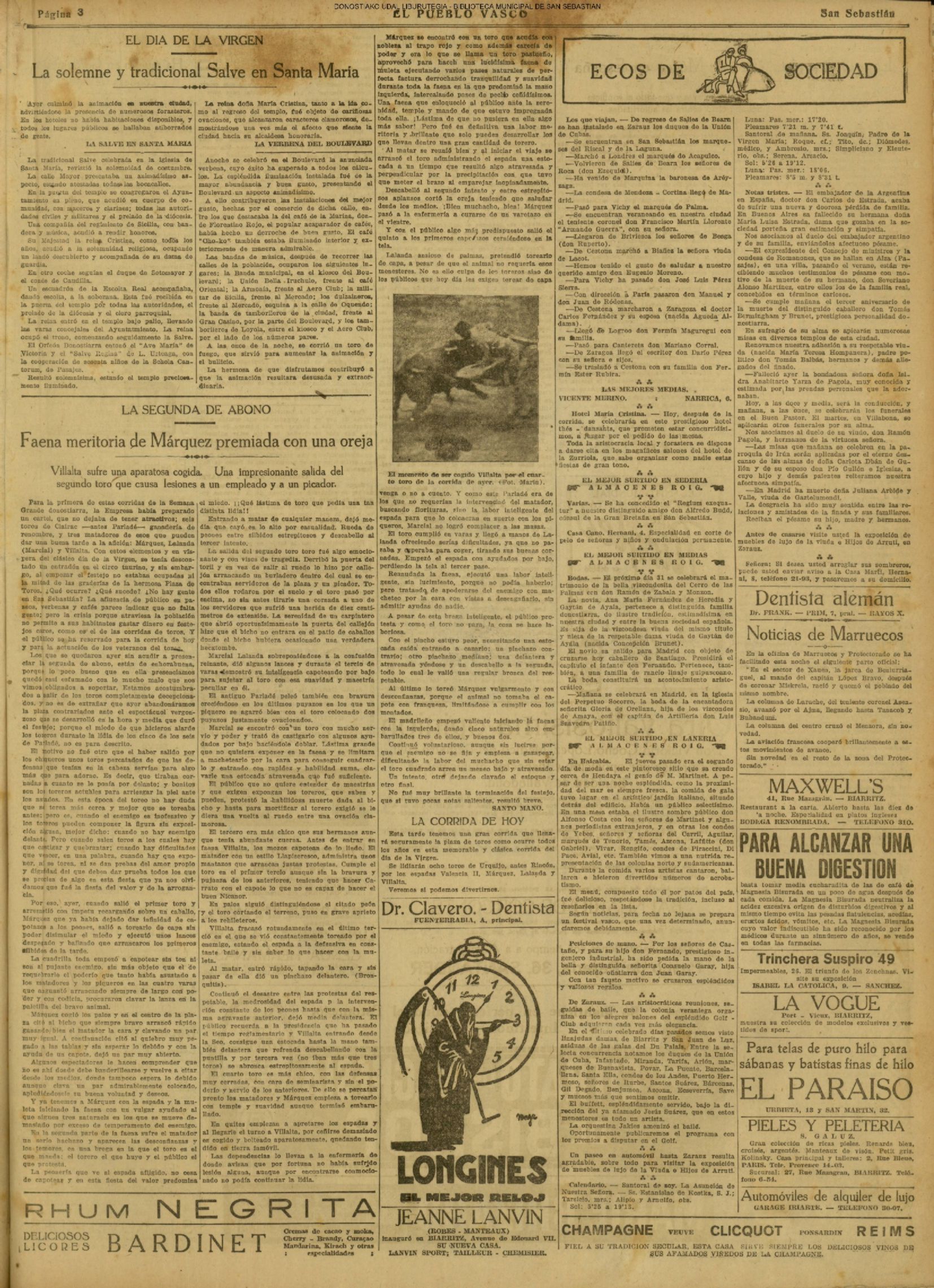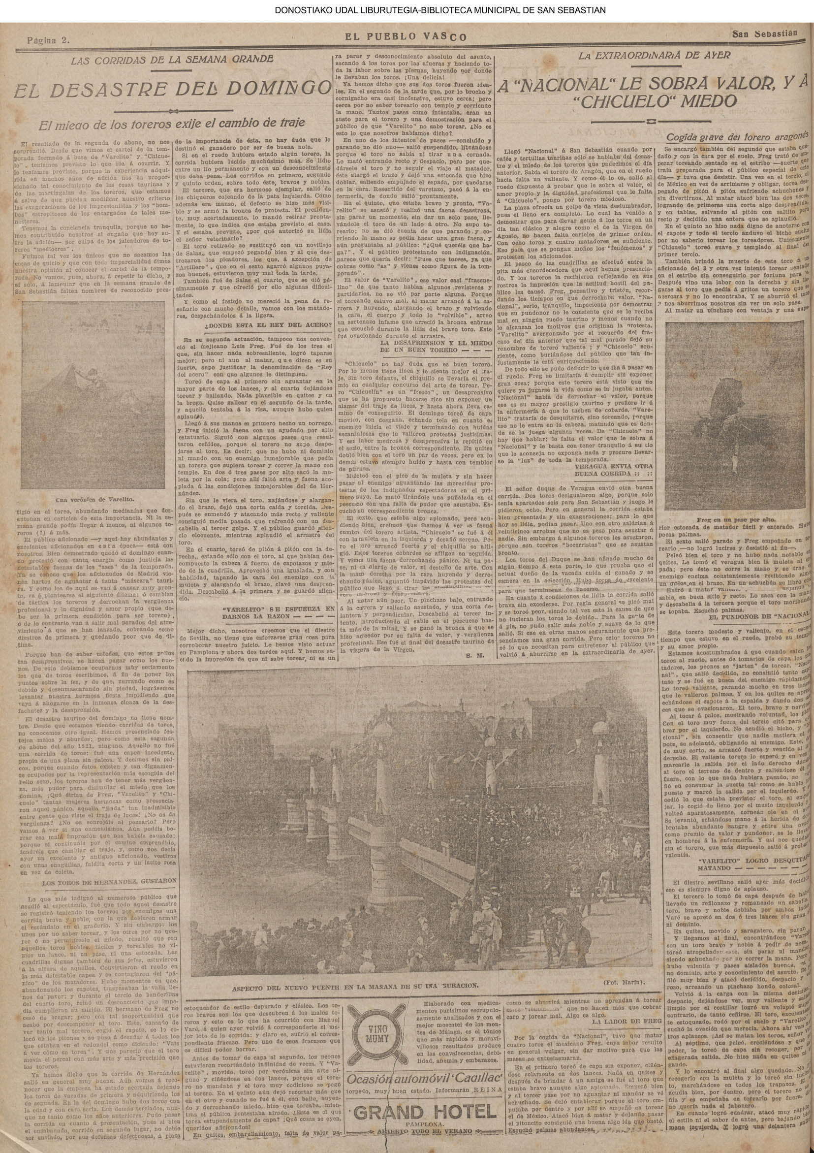 (1920).—Debuta en la Plaza donostiarra,alternando con el "Gallo", Belmonte y Sánchez Mejías, el nuevo torero sevillano Manuel Jiménez (Chicuelo), a quien muchos consideraban sucesor de Joselito. Causó buena impresión, aunque no