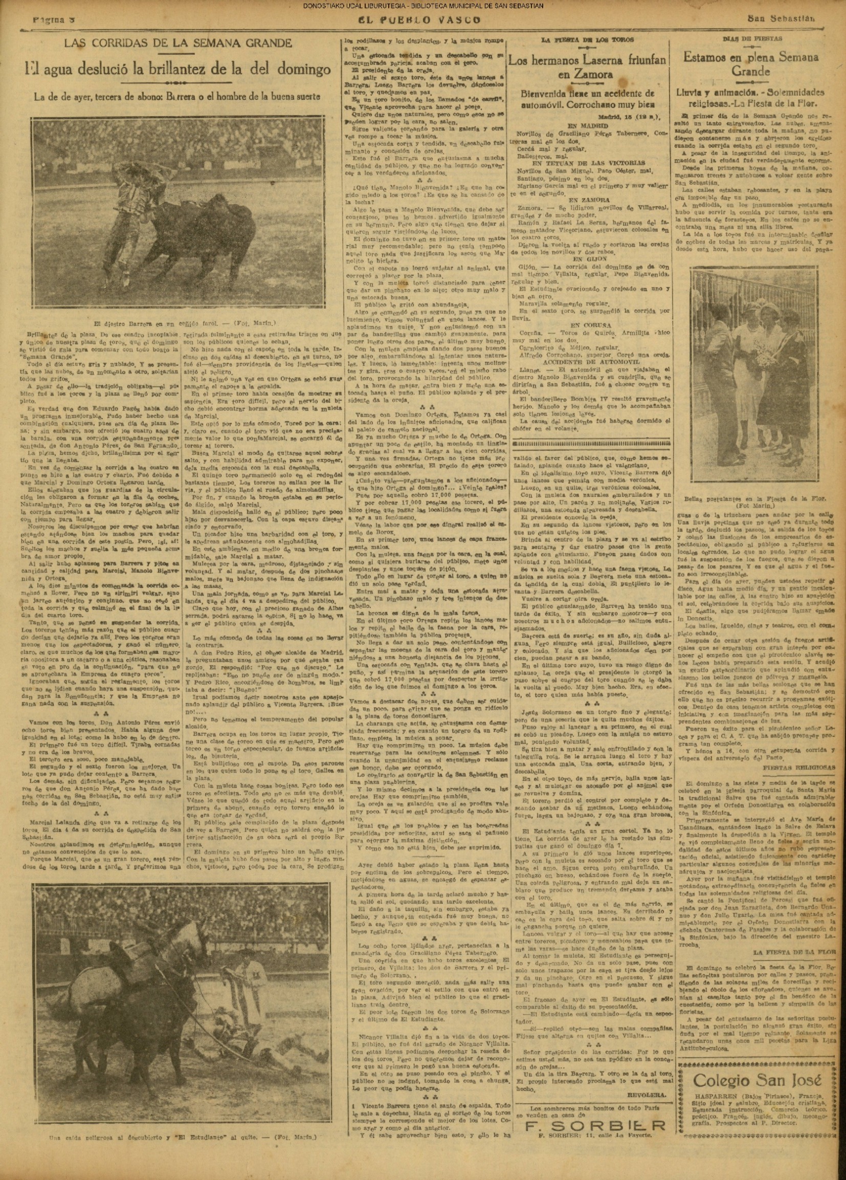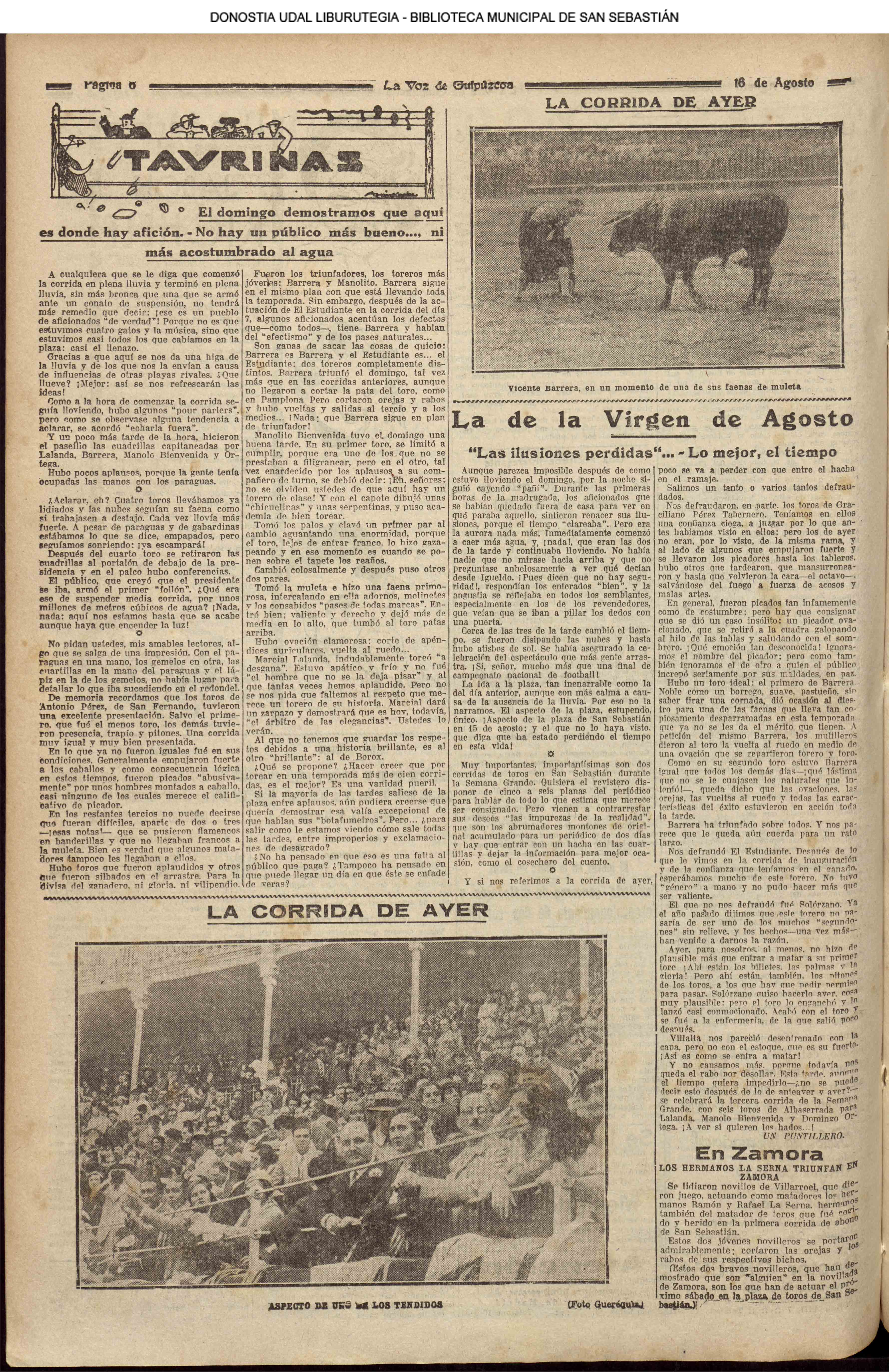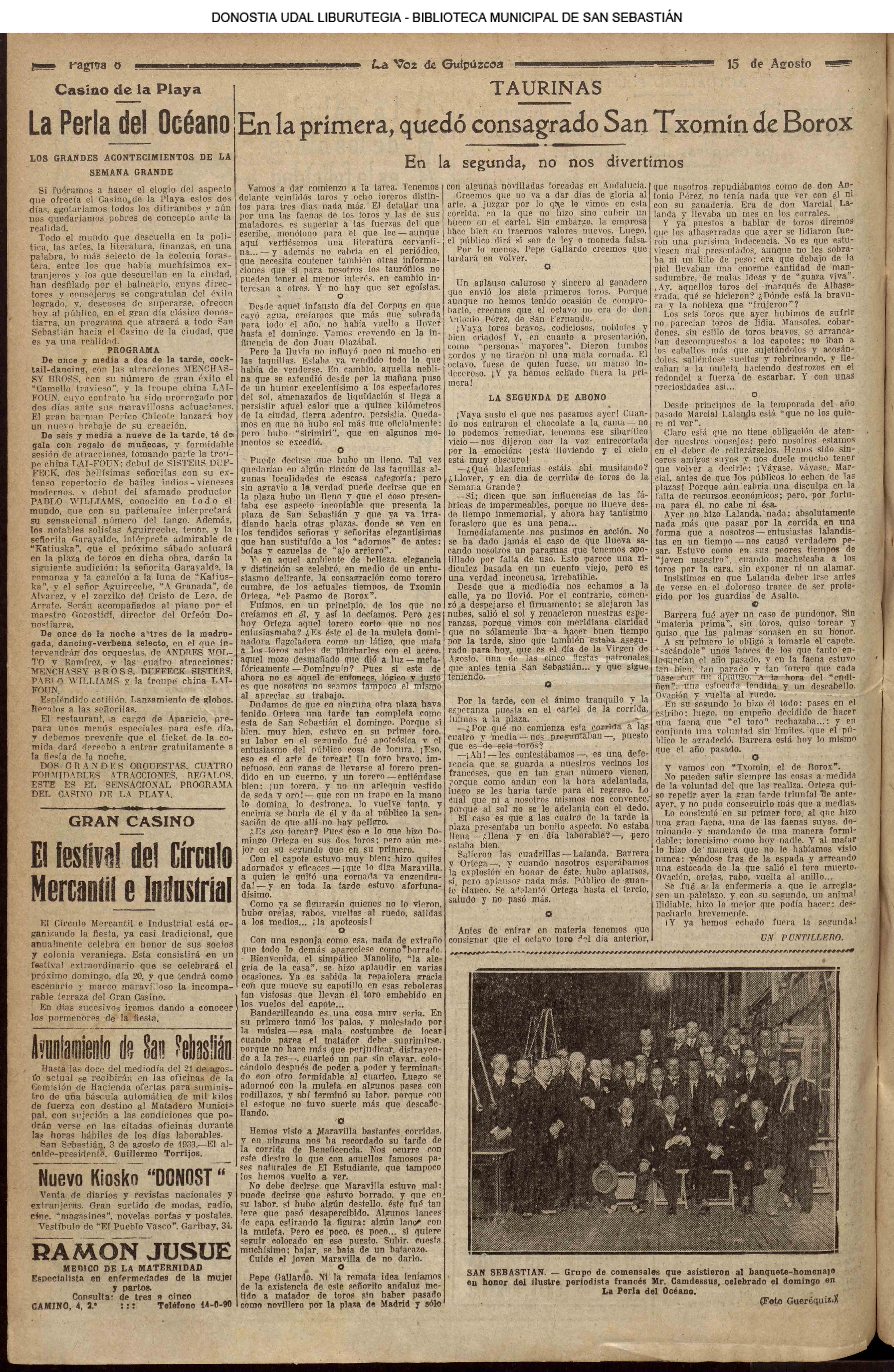 (1920).—Debuta en la Plaza donostiarra,alternando con el "Gallo", Belmonte y Sánchez Mejías, el nuevo torero sevillano Manuel Jiménez (Chicuelo), a quien muchos consideraban sucesor de Joselito. Causó buena impresión, aunque no