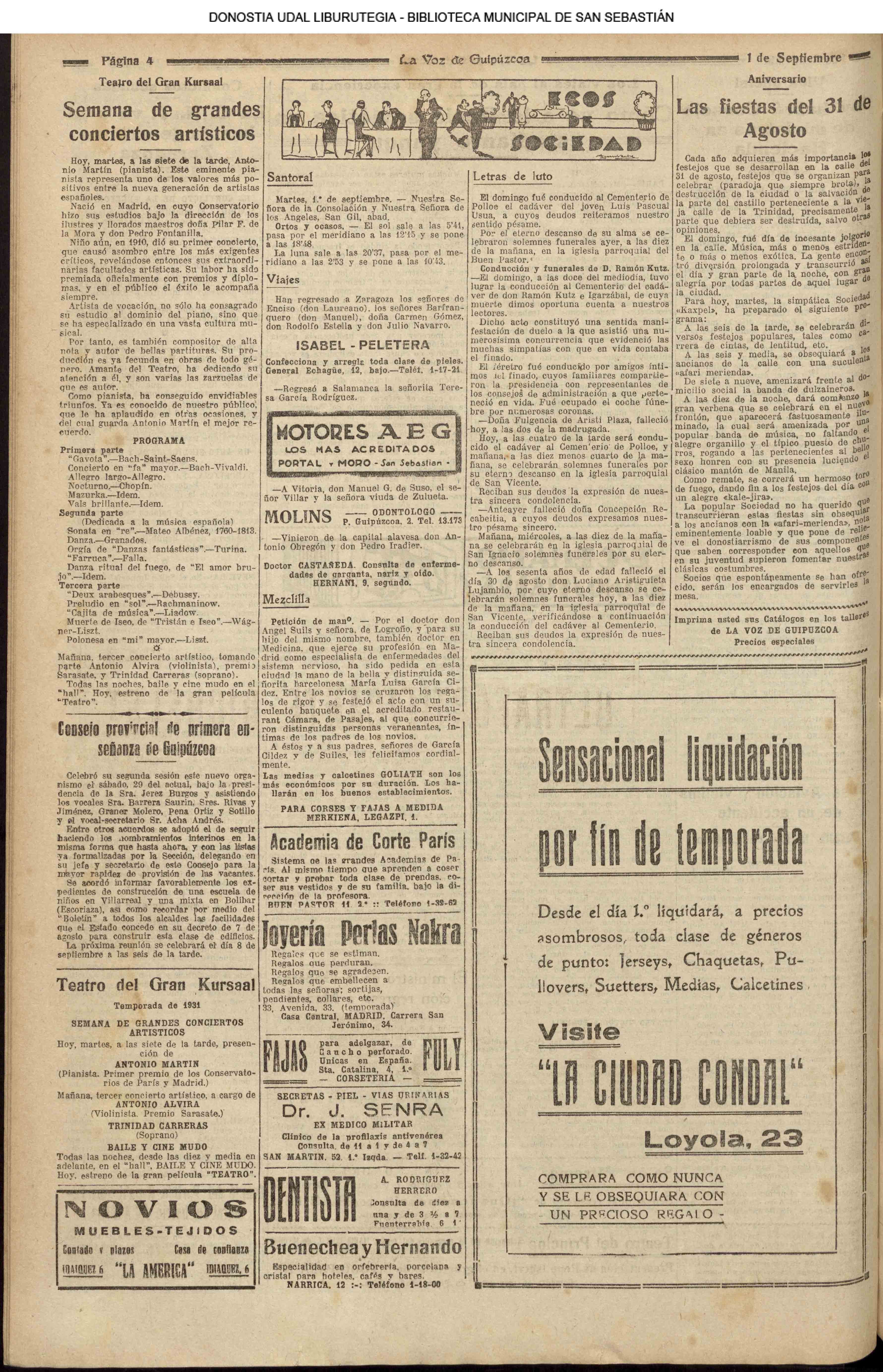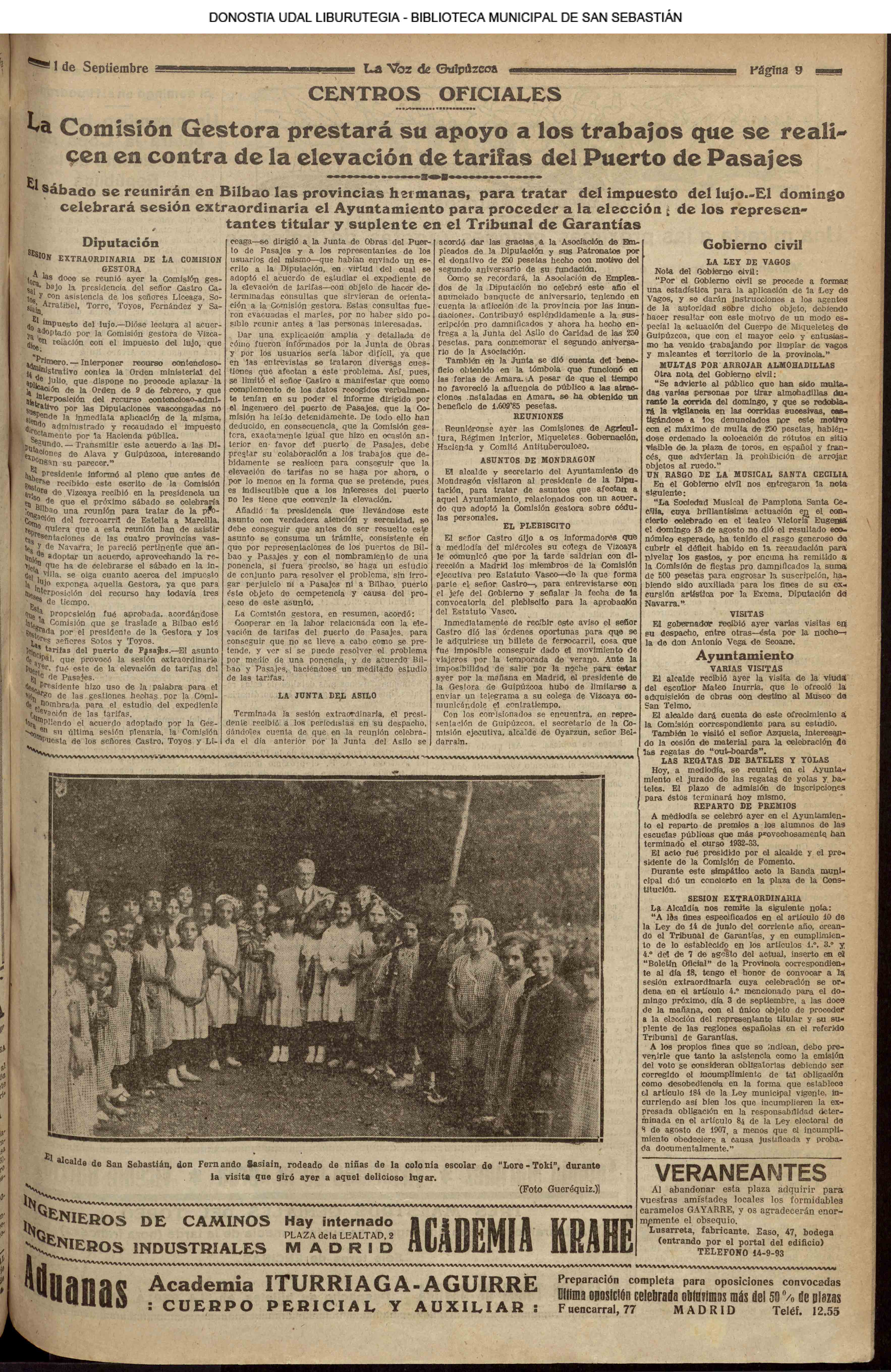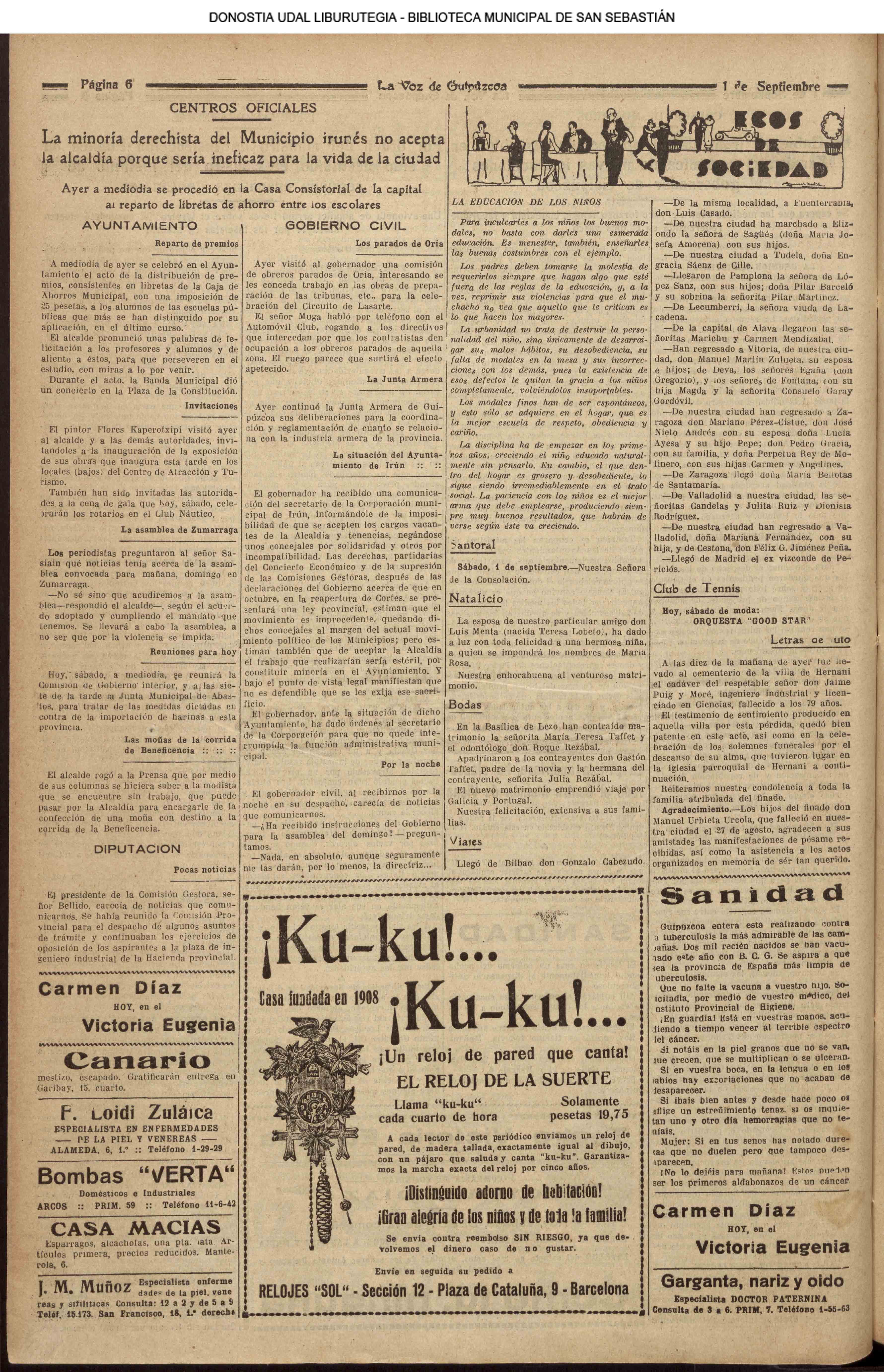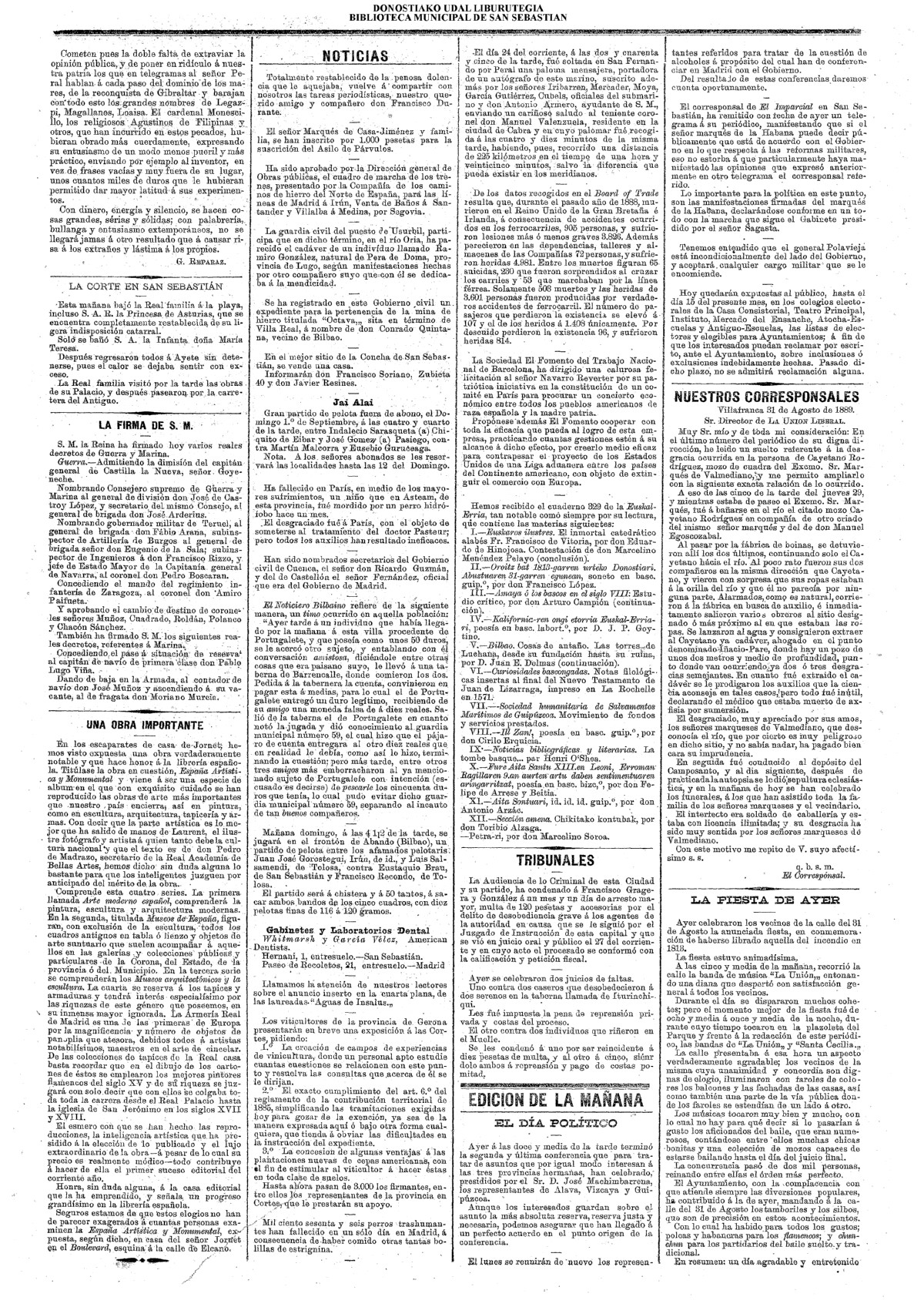 31 - agosto![]() | (1931) LA VOZ DE GUIPUZCOA (CENTROS OFICIALES - Van por buen camino las gestiones para la construcción del Hospital Provincial y Municipal) .- Las fiestas del 31 de Agosto (La Voz de Guipuzcoa)(El Pueblo Vasco)(El Día)(LaConstancia) # HOMENAJE, en el CLUB CANTÁBRICO, a D. Rogelio Gordón (La Voz de Guipuzcoa)(El Pueblo Vasco)(El Día)(LaConstancia) ++++++++++++++++++++++++++++++++++++++ (1932) LA VOZ DE GUIPUZCOA (CENTROS OFICIALES) # PLENO MUNICIPAL.- Se faculta a la Alcaldía para atender a los gastos que origine la estancia de S.E. el presidente de la República.- Se celebrará una Feria del 15 al 39 de septiembre, en los terrenos de Amara.- Adquisición de una ambulancia-automóvil.- La liquidación de las obras del pintor Sert para el Museo de San Telmo.- Las obras del Teatro Principal.- La Urbanización de la calle Carquizano (La Voz de Guipuzcoa)(El Pueblo Vasco)(El Día)(LaConstancia) +++++++++++++++++++++++++++ (1933) LA VOZ DE GUIPUZCOA (CENTROS OFICIALES - La Comisión Gestora prestará su apoyo a los trabajos que se realicen en contra de la elevación de tarifas del Puerto de Pasajes ........) (La Voz de Guipuzcoa)(El Pueblo Vasco)(El Día)(LaConstancia) ++++++++++++++++++++++++++++++++++++++++++++++++++++++++++ # LOS AYUNTAMIENTOS VASCOS Y EL ESTADO.- El Alcalde de San Sebastián publica una nota dirigida a los guipuzcoanos, recomendando que se eviten las estridencias, ante la llegada de los parlamentarios catalanes..... (La Voz de Guipuzcoa)(El Pueblo Vasco)(El Día)(LaConstancia) # IN MEMORIAM (31 de Agosto) (La Voz de Guipuzcoa)(El Pueblo Vasco)(El Día)(LaConstancia) ++++++++++++ # CONMEMORANDO UN ACONTECIMIENTO.- Comenzaron los festejos de la calle del 31 de Agosto. (La Voz de Guipuzcoa)(El Pueblo Vasco)(El Día)(LaConstancia) |