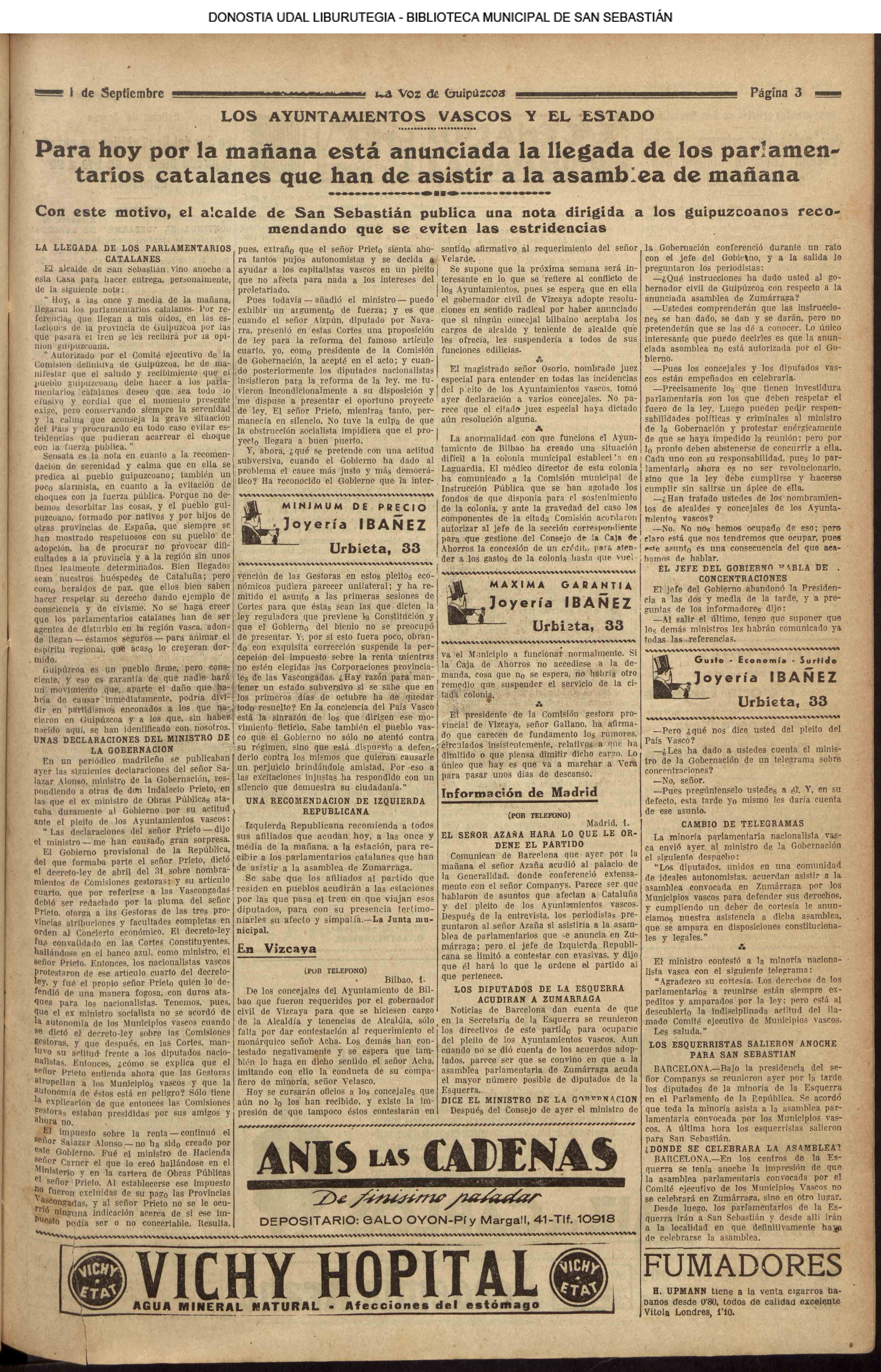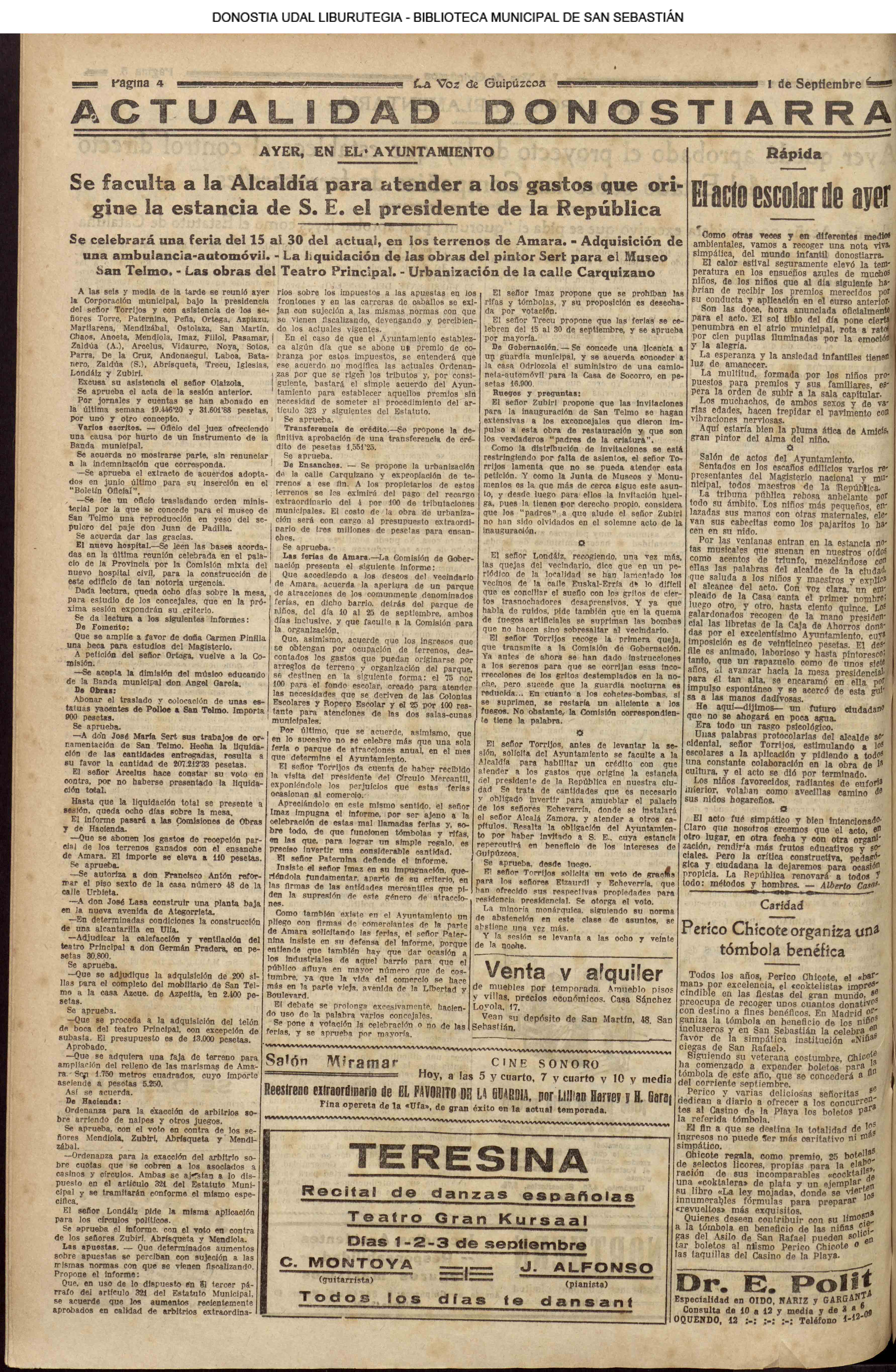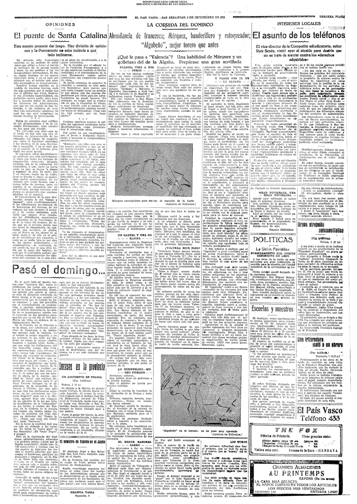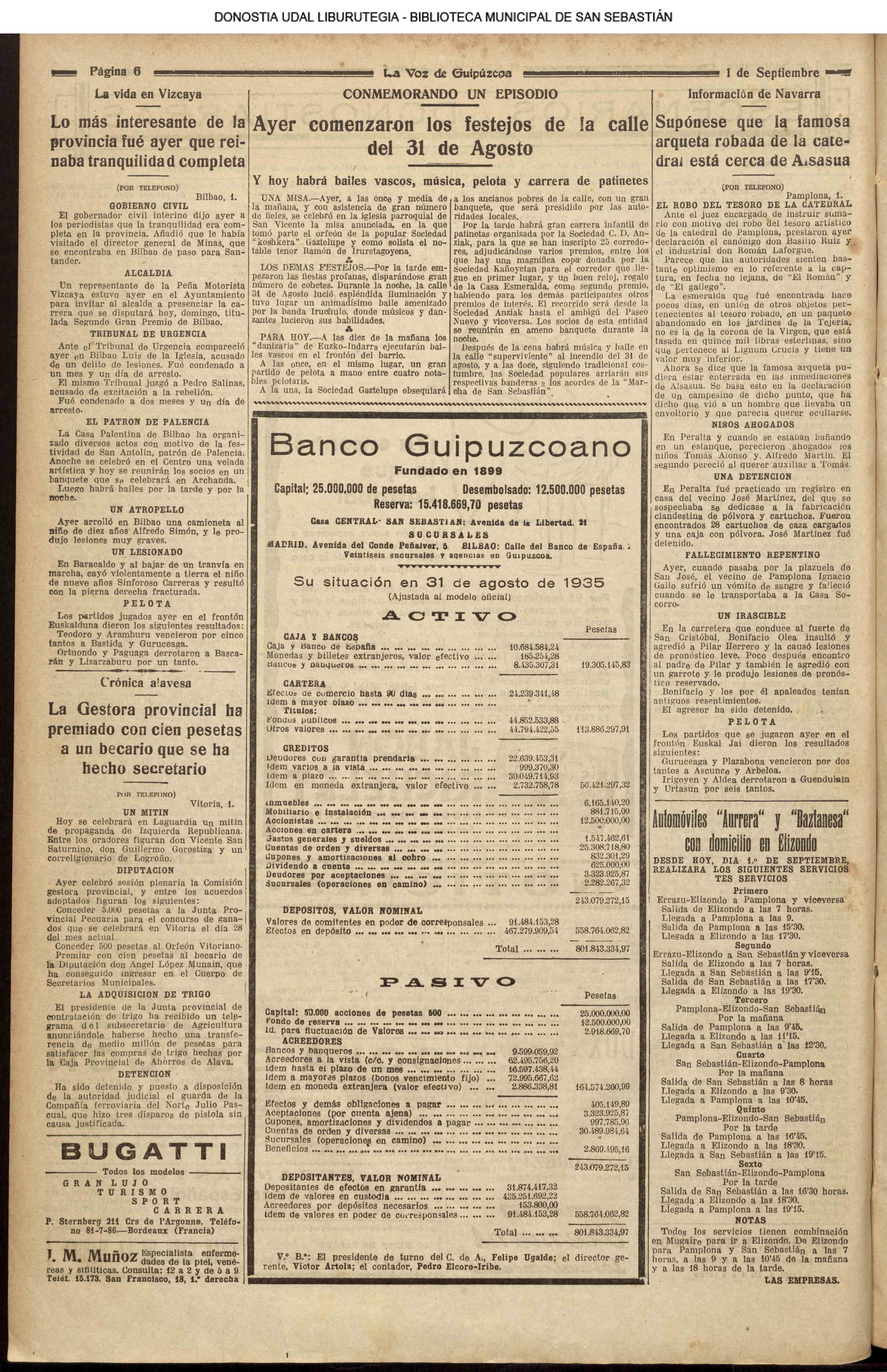 31 - agosto![]() | (1931) LA VOZ DE GUIPUZCOA (CENTROS OFICIALES - Van por buen camino las gestiones para la construcción del Hospital Provincial y Municipal) .- Las fiestas del 31 de Agosto (La Voz de Guipuzcoa)(El Pueblo Vasco)(El Día)(LaConstancia) # HOMENAJE, en el CLUB CANTÁBRICO, a D. Rogelio Gordón (La Voz de Guipuzcoa)(El Pueblo Vasco)(El Día)(LaConstancia) ++++++++++++++++++++++++++++++++++++++ (1932) LA VOZ DE GUIPUZCOA (CENTROS OFICIALES) # PLENO MUNICIPAL.- Se faculta a la Alcaldía para atender a los gastos que origine la estancia de S.E. el presidente de la República.- Se celebrará una Feria del 15 al 39 de septiembre, en los terrenos de Amara.- Adquisición de una ambulancia-automóvil.- La liquidación de las obras del pintor Sert para el Museo de San Telmo.- Las obras del Teatro Principal.- La Urbanización de la calle Carquizano (La Voz de Guipuzcoa)(El Pueblo Vasco)(El Día)(LaConstancia) +++++++++++++++++++++++++++ (1933) LA VOZ DE GUIPUZCOA (CENTROS OFICIALES - La Comisión Gestora prestará su apoyo a los trabajos que se realicen en contra de la elevación de tarifas del Puerto de Pasajes ........) (La Voz de Guipuzcoa)(El Pueblo Vasco)(El Día)(LaConstancia) ++++++++++++++++++++++++++++++++++++++++++++++++++++++++++ # LOS AYUNTAMIENTOS VASCOS Y EL ESTADO.- El Alcalde de San Sebastián publica una nota dirigida a los guipuzcoanos, recomendando que se eviten las estridencias, ante la llegada de los parlamentarios catalanes..... (La Voz de Guipuzcoa)(El Pueblo Vasco)(El Día)(LaConstancia) # IN MEMORIAM (31 de Agosto) (La Voz de Guipuzcoa)(El Pueblo Vasco)(El Día)(LaConstancia) ++++++++++++ # CONMEMORANDO UN ACONTECIMIENTO.- Comenzaron los festejos de la calle del 31 de Agosto. (La Voz de Guipuzcoa)(El Pueblo Vasco)(El Día)(LaConstancia) |