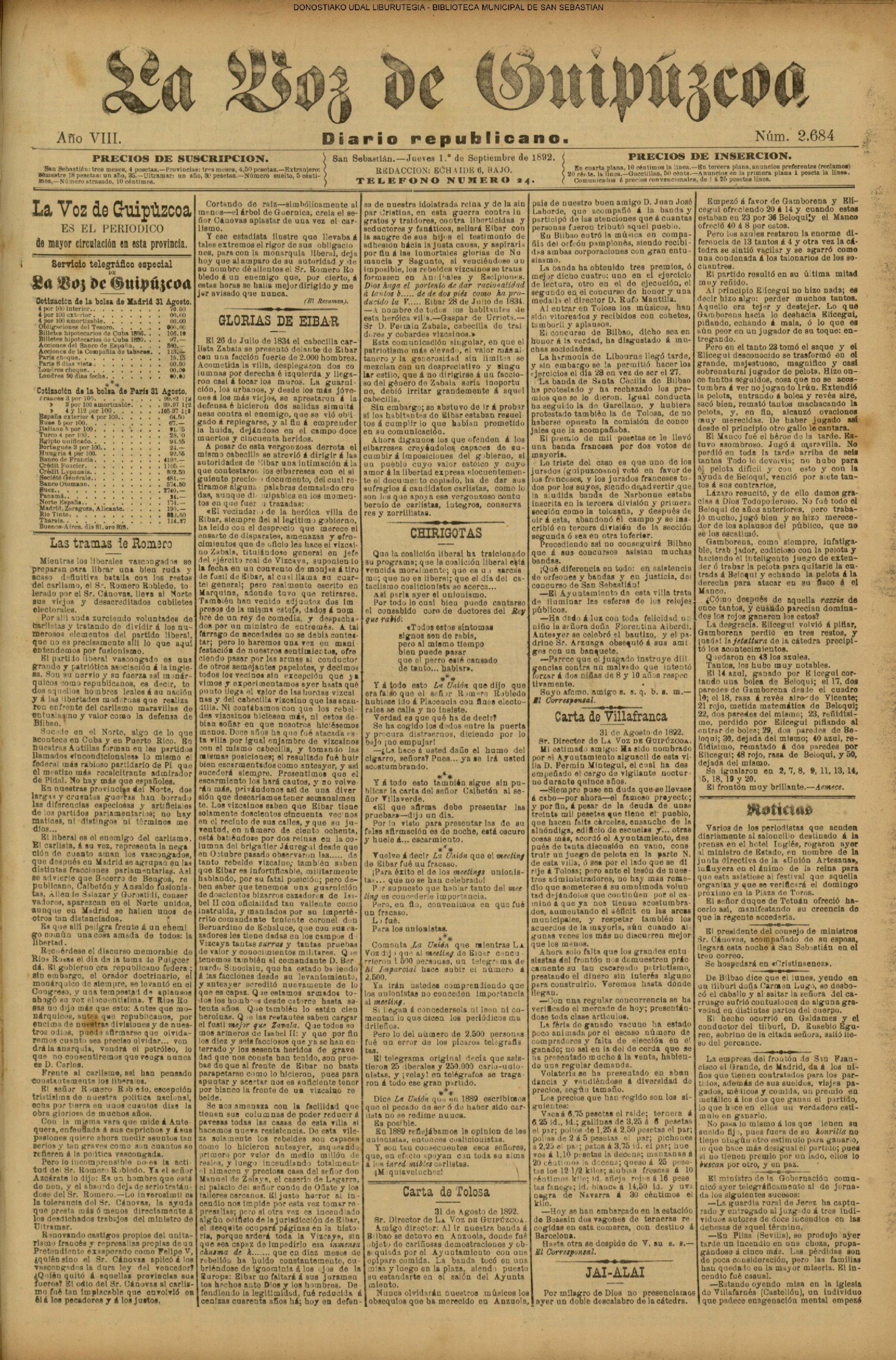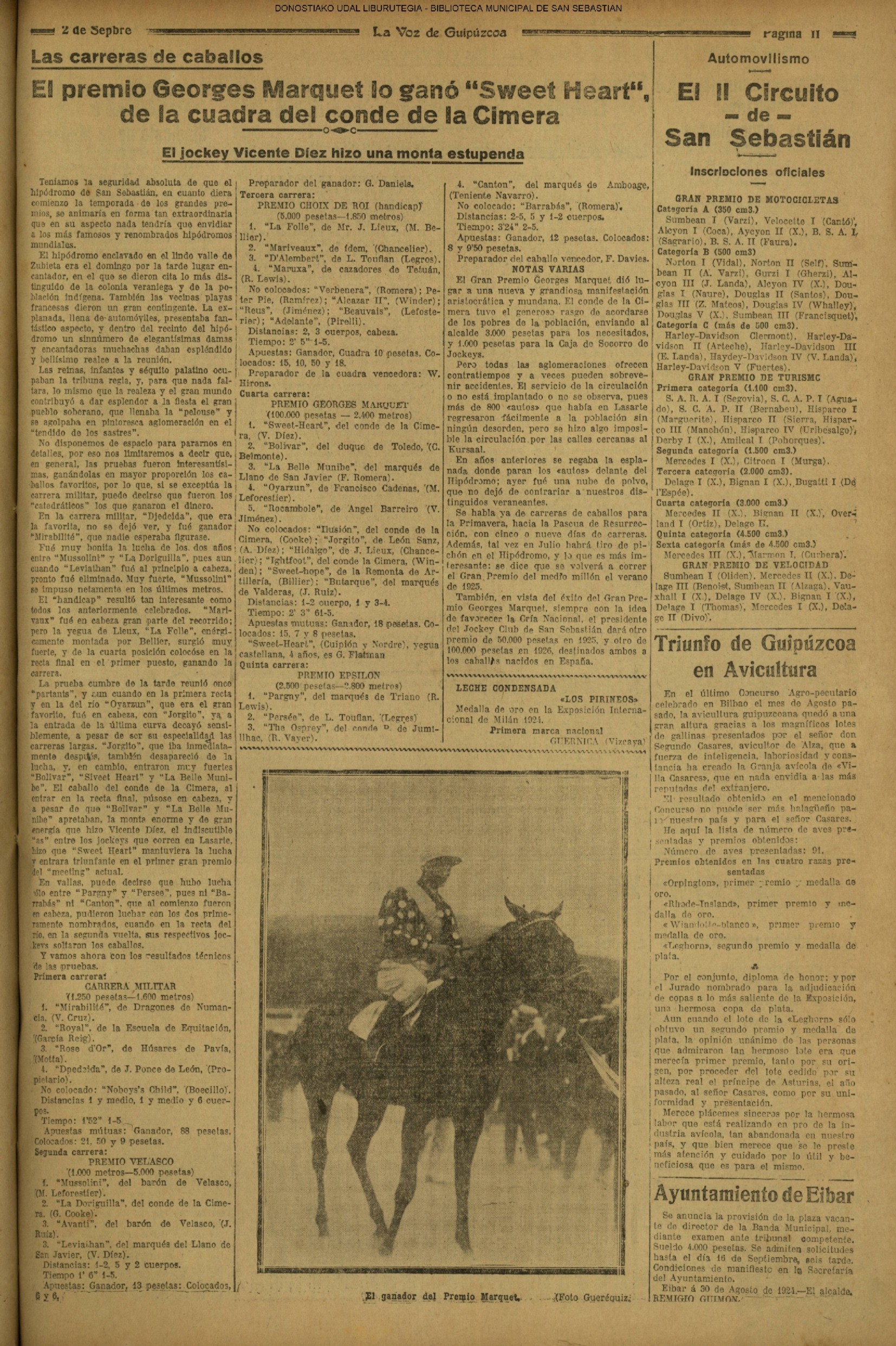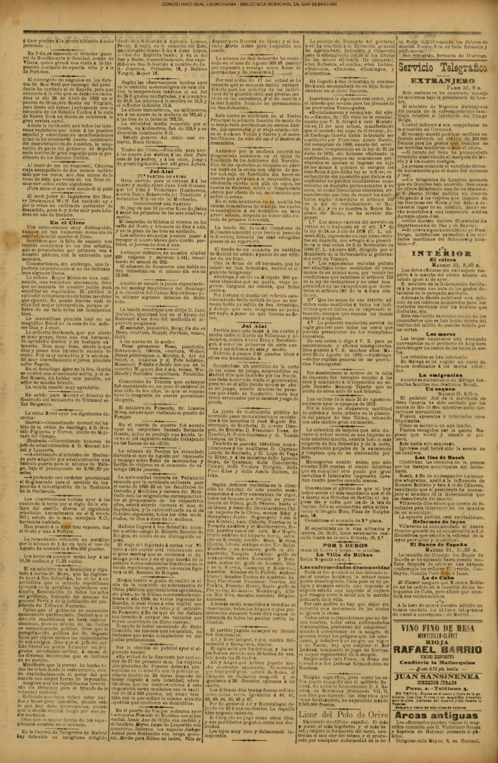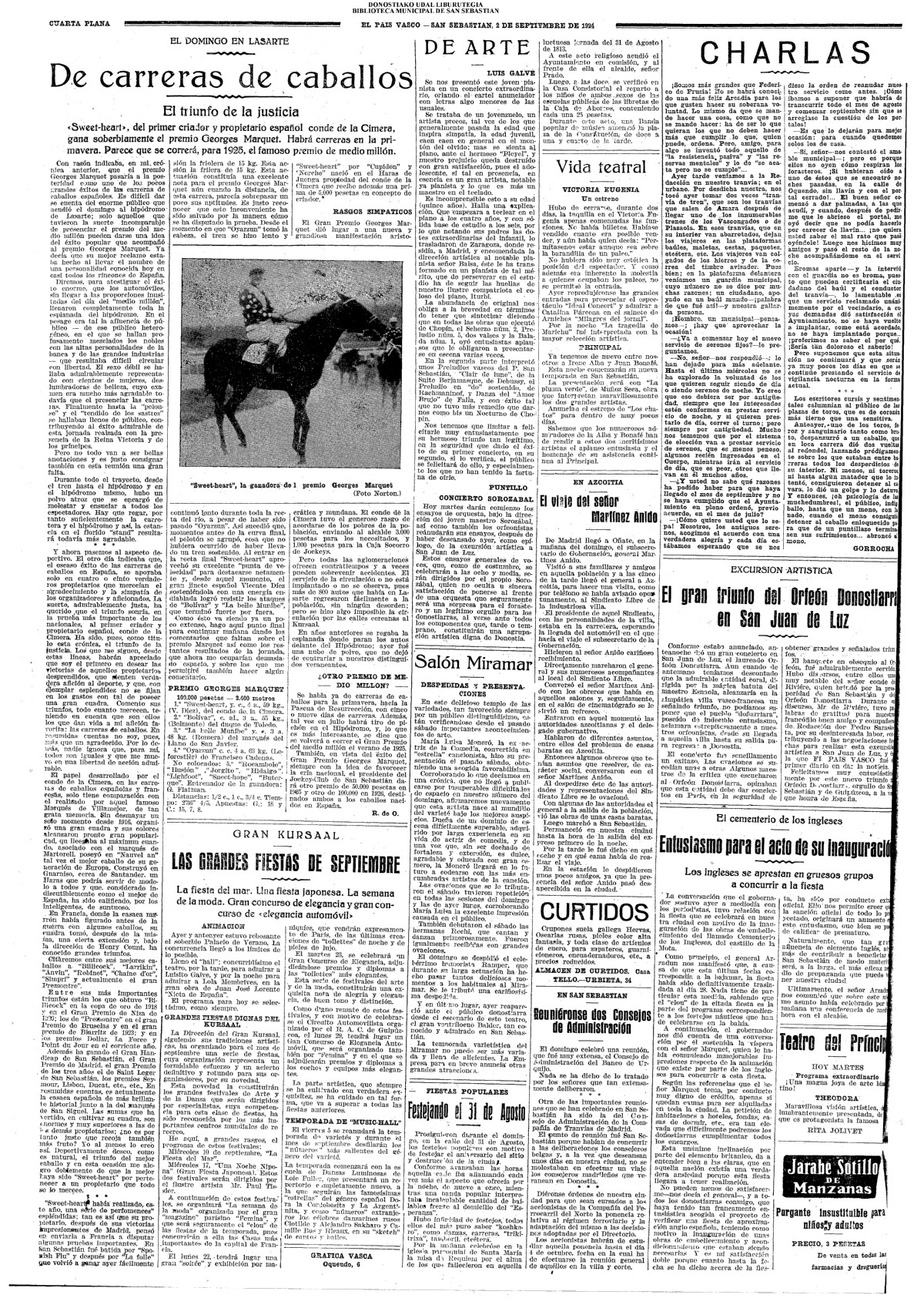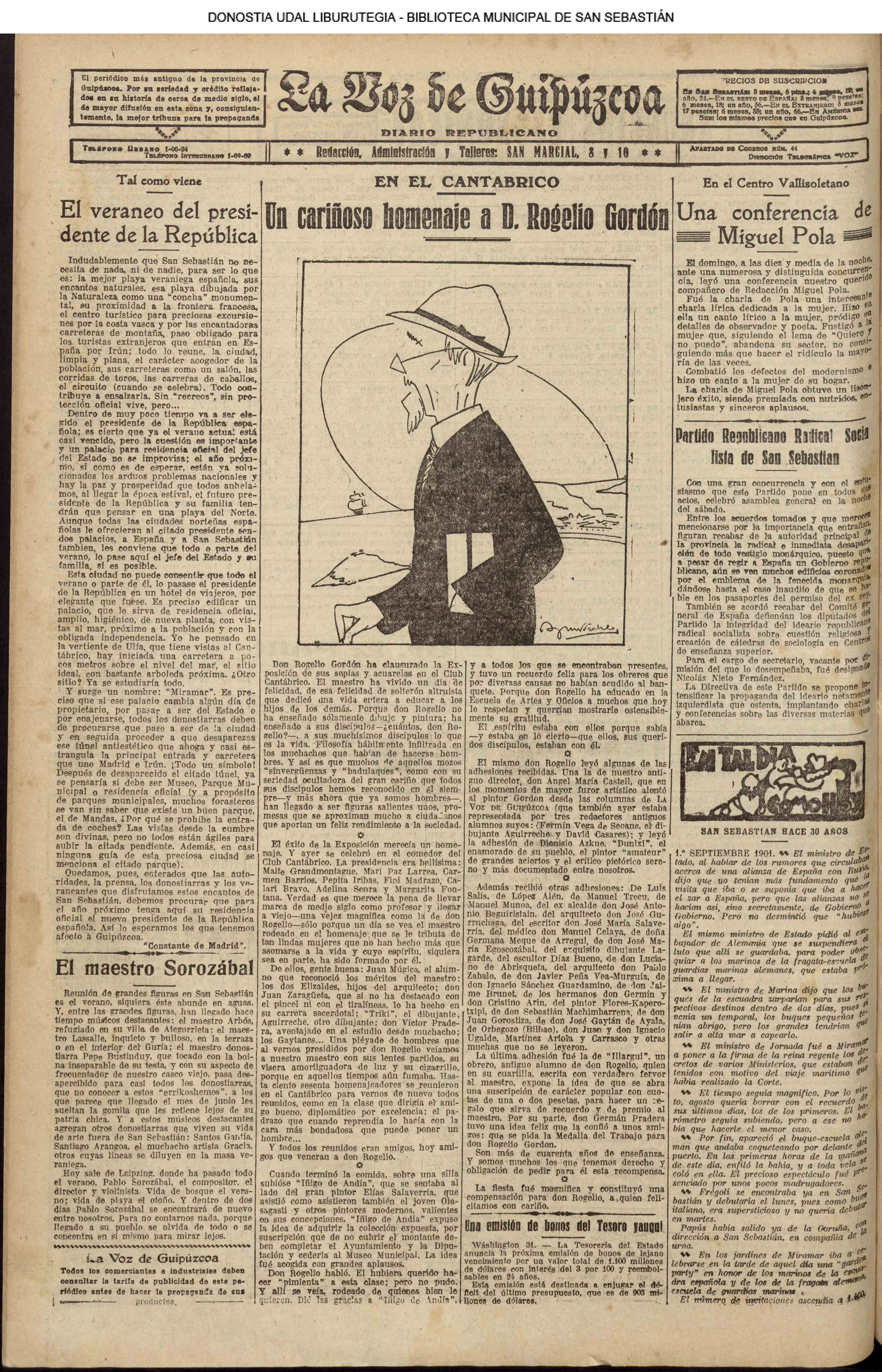 31 - agosto![]() | (1931) LA VOZ DE GUIPUZCOA (CENTROS OFICIALES - Van por buen camino las gestiones para la construcción del Hospital Provincial y Municipal) .- Las fiestas del 31 de Agosto (La Voz de Guipuzcoa)(El Pueblo Vasco)(El Día)(LaConstancia) # HOMENAJE, en el CLUB CANTÁBRICO, a D. Rogelio Gordón (La Voz de Guipuzcoa)(El Pueblo Vasco)(El Día)(LaConstancia) ++++++++++++++++++++++++++++++++++++++ (1932) LA VOZ DE GUIPUZCOA (CENTROS OFICIALES) # PLENO MUNICIPAL.- Se faculta a la Alcaldía para atender a los gastos que origine la estancia de S.E. el presidente de la República.- Se celebrará una Feria del 15 al 39 de septiembre, en los terrenos de Amara.- Adquisición de una ambulancia-automóvil.- La liquidación de las obras del pintor Sert para el Museo de San Telmo.- Las obras del Teatro Principal.- La Urbanización de la calle Carquizano (La Voz de Guipuzcoa)(El Pueblo Vasco)(El Día)(LaConstancia) +++++++++++++++++++++++++++ (1933) LA VOZ DE GUIPUZCOA (CENTROS OFICIALES - La Comisión Gestora prestará su apoyo a los trabajos que se realicen en contra de la elevación de tarifas del Puerto de Pasajes ........) (La Voz de Guipuzcoa)(El Pueblo Vasco)(El Día)(LaConstancia) ++++++++++++++++++++++++++++++++++++++++++++++++++++++++++ # LOS AYUNTAMIENTOS VASCOS Y EL ESTADO.- El Alcalde de San Sebastián publica una nota dirigida a los guipuzcoanos, recomendando que se eviten las estridencias, ante la llegada de los parlamentarios catalanes..... (La Voz de Guipuzcoa)(El Pueblo Vasco)(El Día)(LaConstancia) # IN MEMORIAM (31 de Agosto) (La Voz de Guipuzcoa)(El Pueblo Vasco)(El Día)(LaConstancia) ++++++++++++ # CONMEMORANDO UN ACONTECIMIENTO.- Comenzaron los festejos de la calle del 31 de Agosto. (La Voz de Guipuzcoa)(El Pueblo Vasco)(El Día)(LaConstancia) |