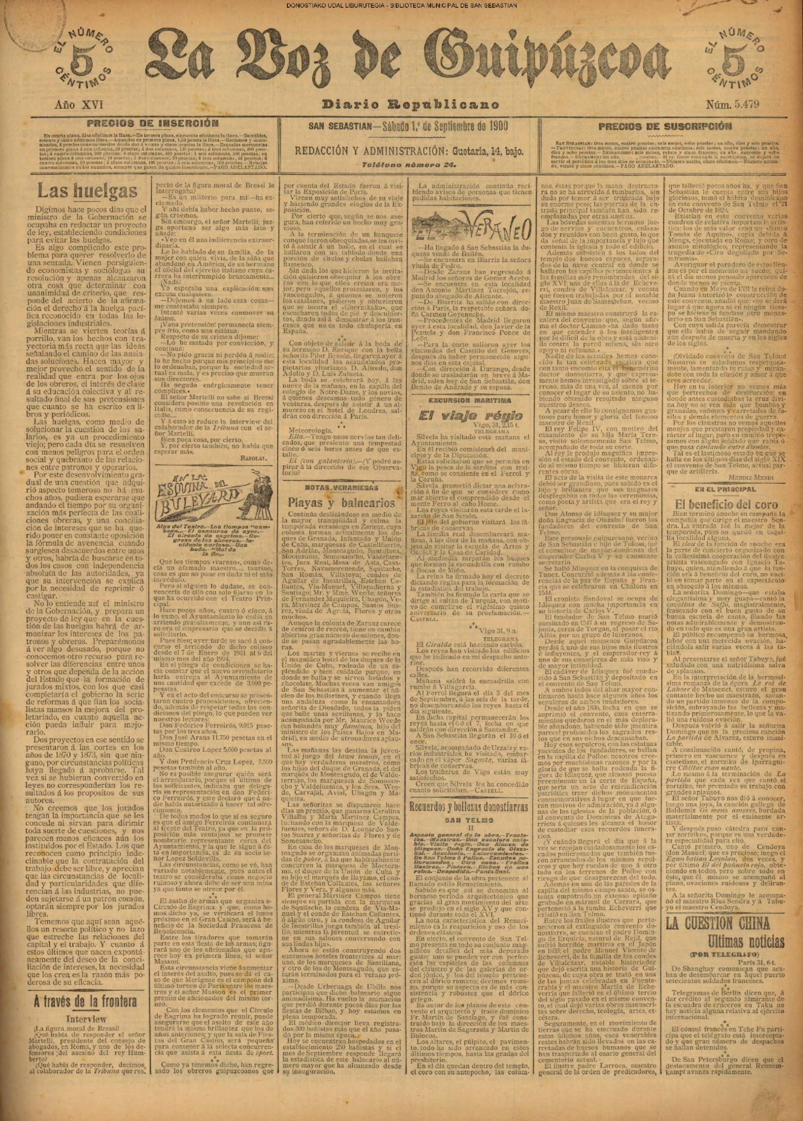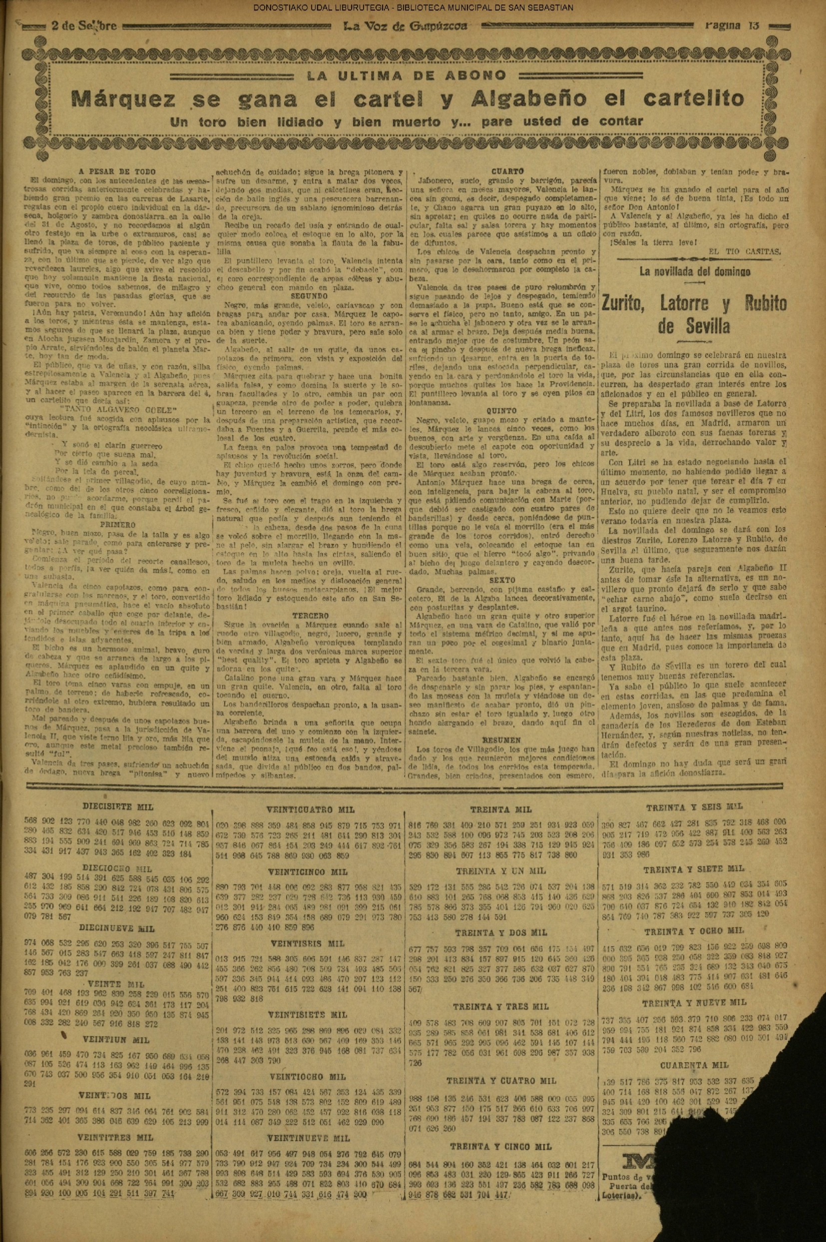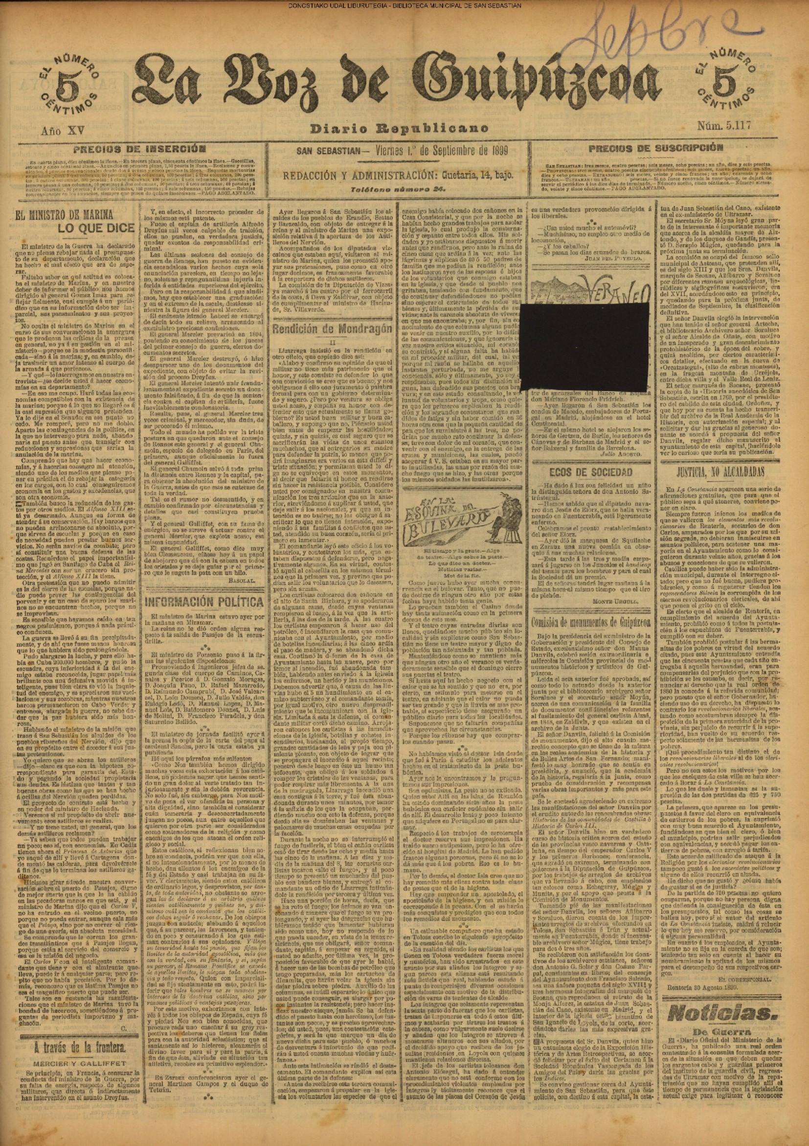 | 1913/08/31 | (DOMINGO) (*).- LAS FIESTAS DEL CENTENARIO EN SAN SEBASTIÁN. (*).- LAS FIESTAS DEL CENTENARIO DE LA BATALLA DE SAN MARCIAL EN IRÚN. (LA VOZ DE GUIPÚZCOA. 01/09. p.02) |