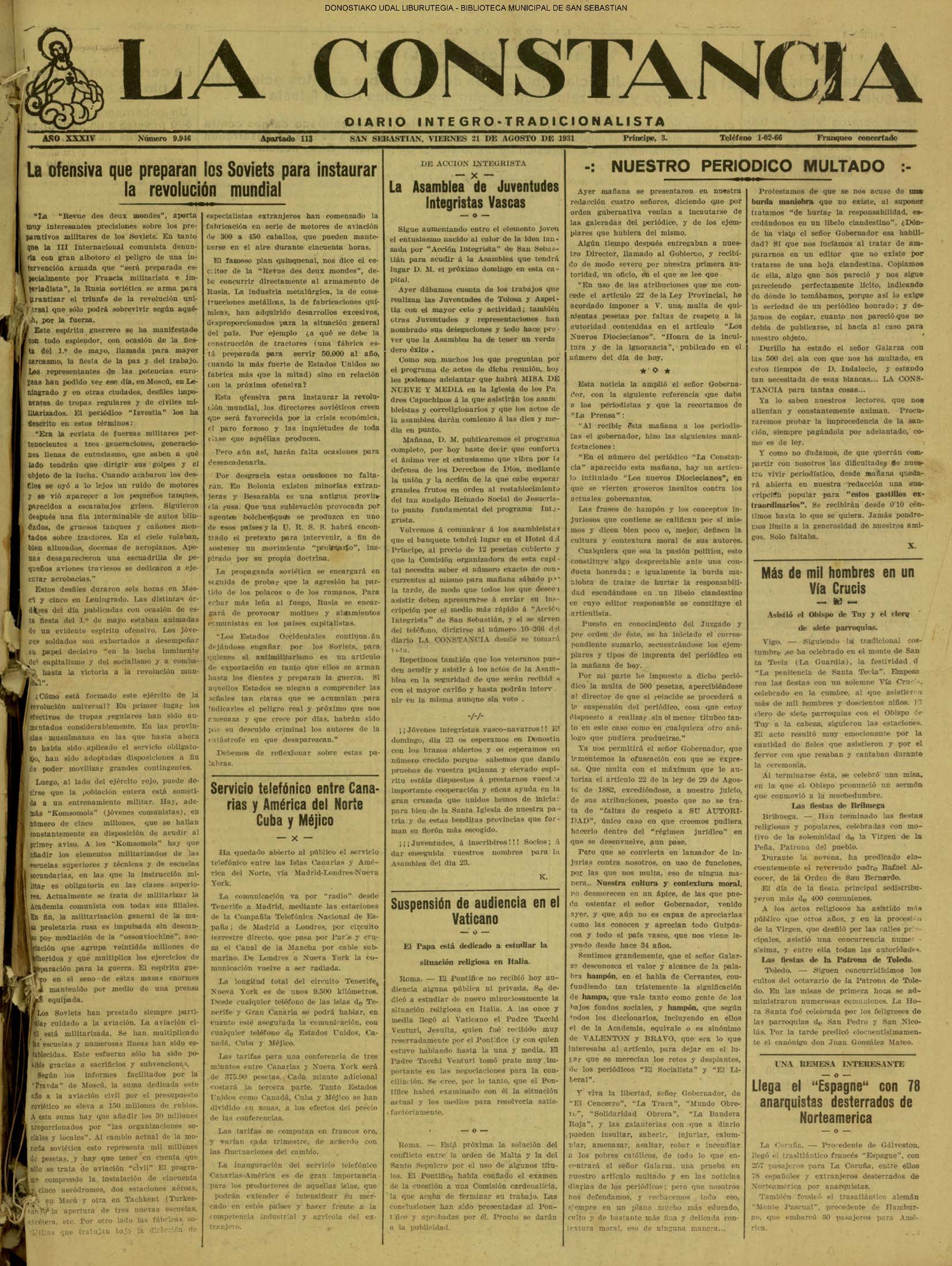 (1931) MULTA GUBERNATIVA al periódico "La Constancia". Secuestro de ejemplares del diario integrista y advertencia de suspensión en caso de reincidencia.