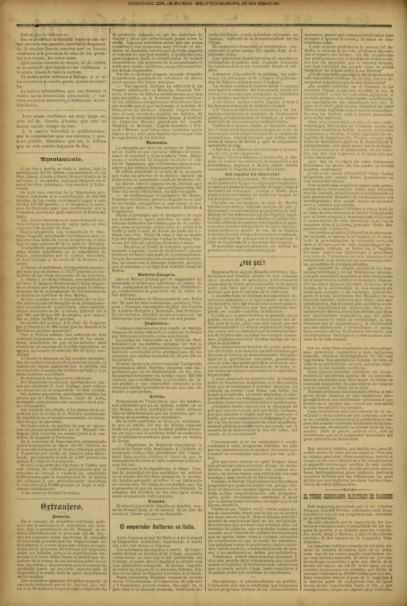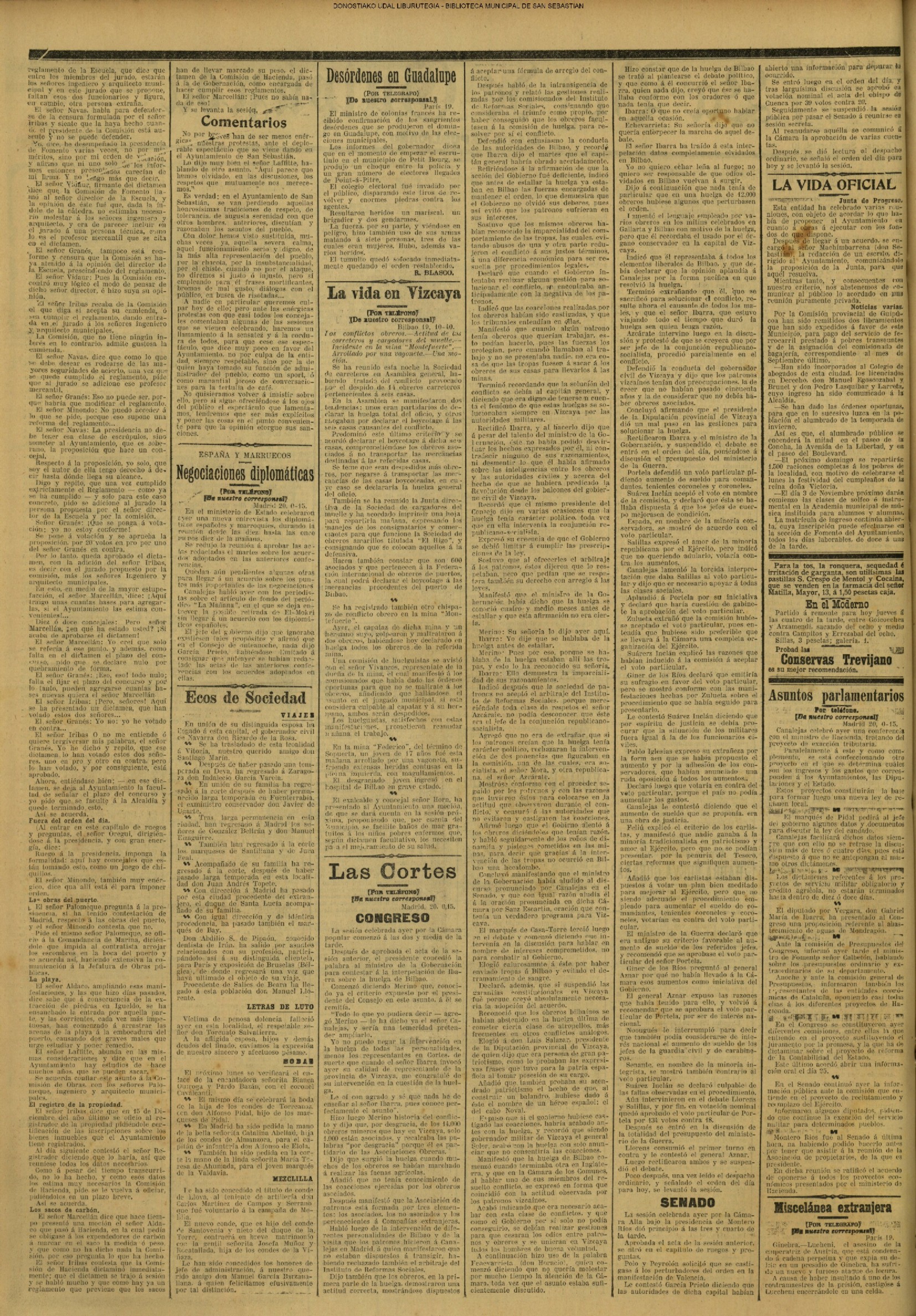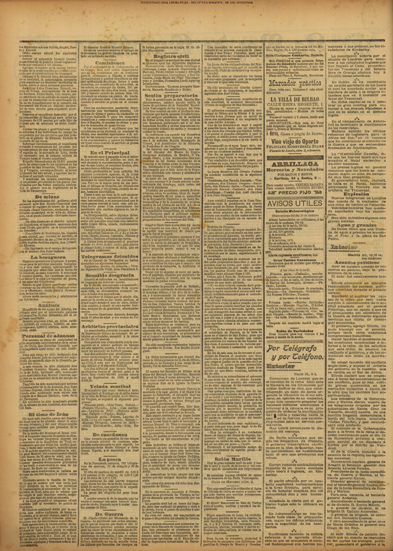 | (*).- Ignacio Mª Echaniz expone que se ha levantado el secuestro de su casa nº.13, calle de Esterlines, y necesitando el almacén para depositar el cargamento de un Buque que espera, pide al Ayuntamiento gestione para que se le entregue enseguida también los pisos de la Casa, todo ocupado por las tropas aliadas británicas. El Ayuntamiento acuerda se pase oficio al Jefe que corresponda. ----------------------------- (*).- Habiéndose desocupado el 3º. y 4º. pisos del Parador Real ----------------------------- (*).- El Sr. Arambarri, comisionado por este distrito ----------------------------- (*).- Observando el Ayuntamiento que los celadores de la Puerta de Tierra, Joaquín Dublé y José Zubiaurre no cuidan con el celo debido la prohibición de permitir la entrada al pueblo de los carros del país de llanta estrecha : acuerda se les exija la multa de diez reales por mitad y que hagan en adelante cumplir con más esmero lo resuelto. (FUENTE: "Anales de la Primera Guerra Carlista en San Sebastián. FERMIN MUÑOZ ECHABEGUREN) |