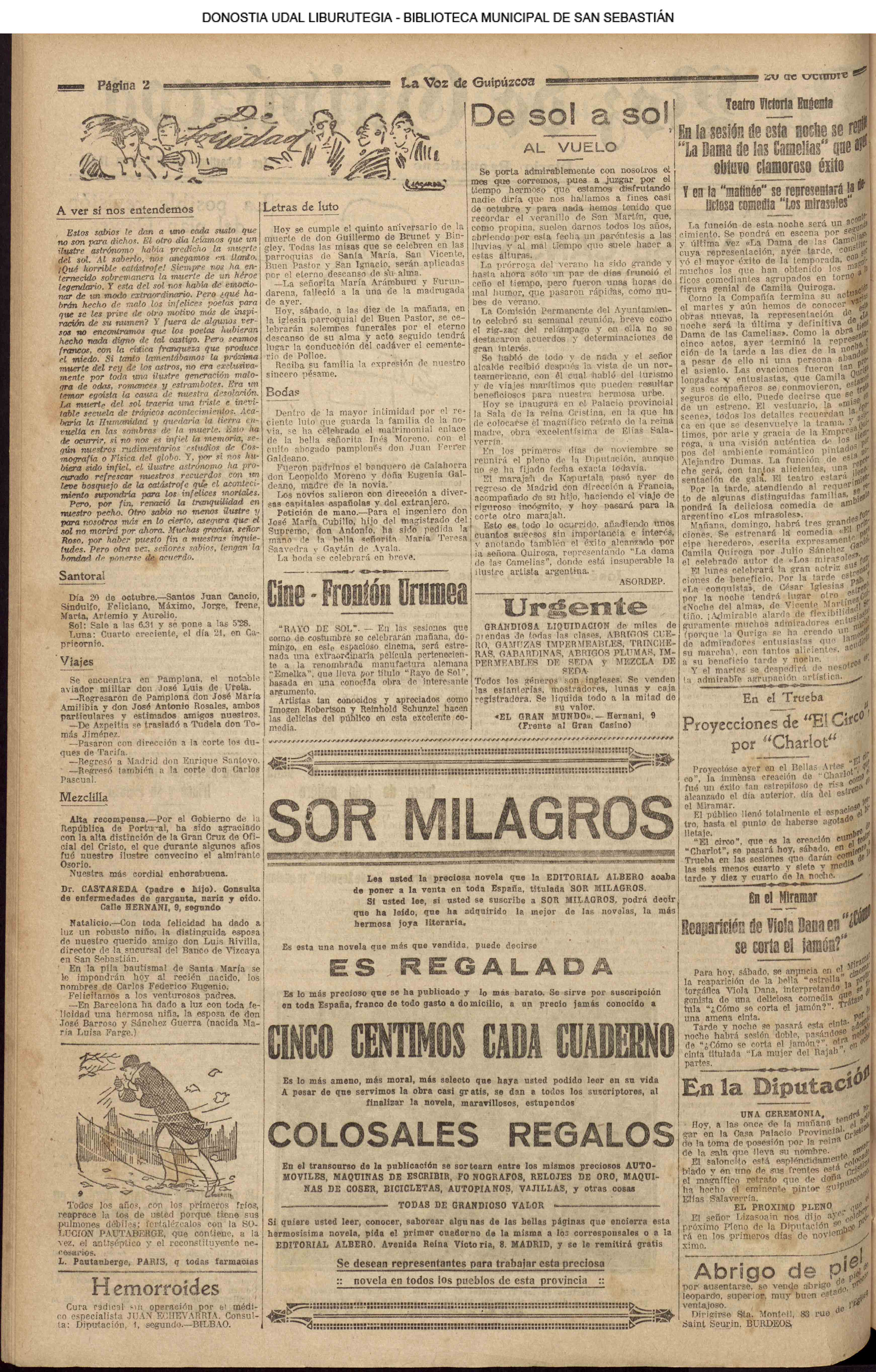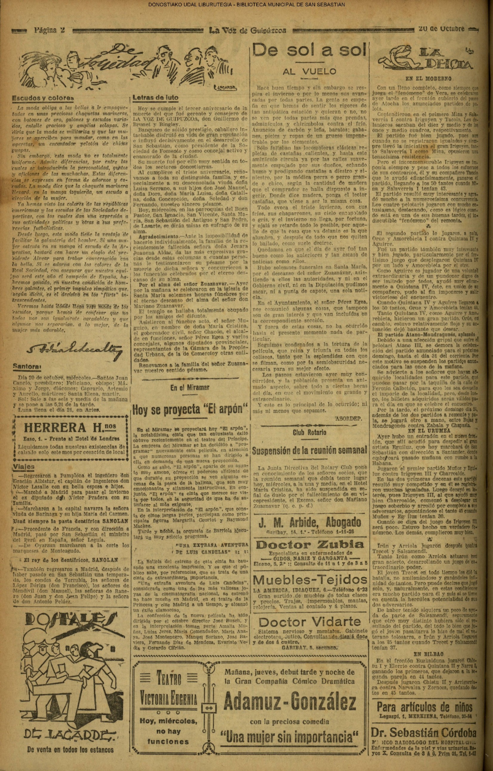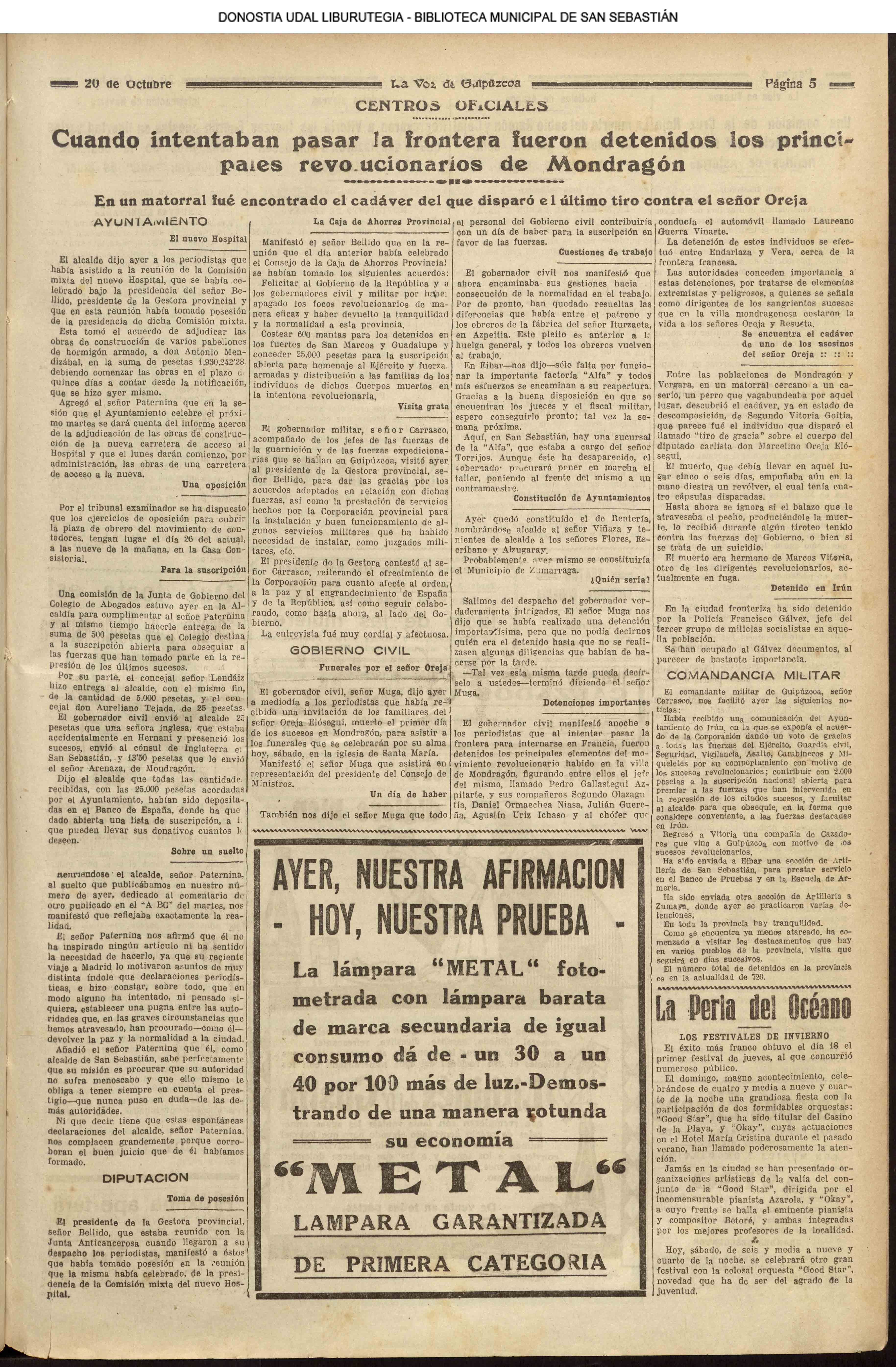 19- octubre![]() | # DIPUTACIÓN - Quedó constituída la nueva Gestora provincial Patriótico discurso del Gobernador Civil «que no quede en los organismos provinciales ningún germen de marxismo ni de nacionalismo; y que no vuelva a oirse la repugnante palabra de "askatuta" # DECRETOS. Sobre los pisos y locales abandonados ++++++++++++++++++++++++++++++++++++++++++ (1937)GUERRA CIVIL# EN LA IGLESIA DE SANTA MARIА - Honras fúnebres por el capitán