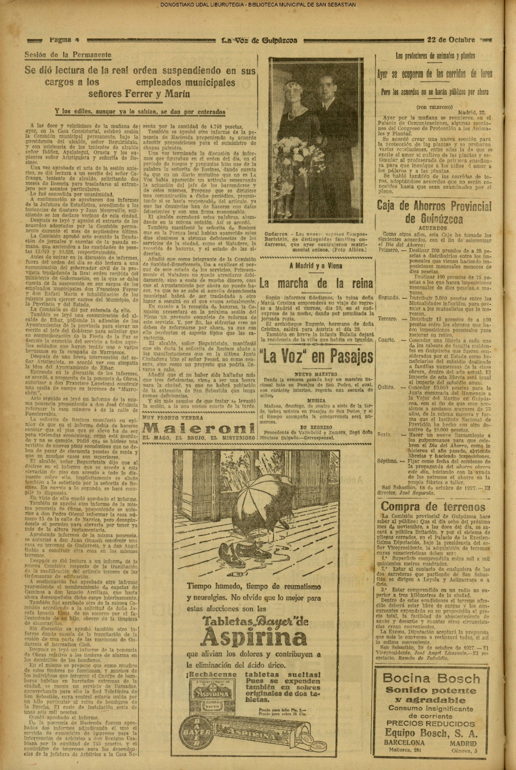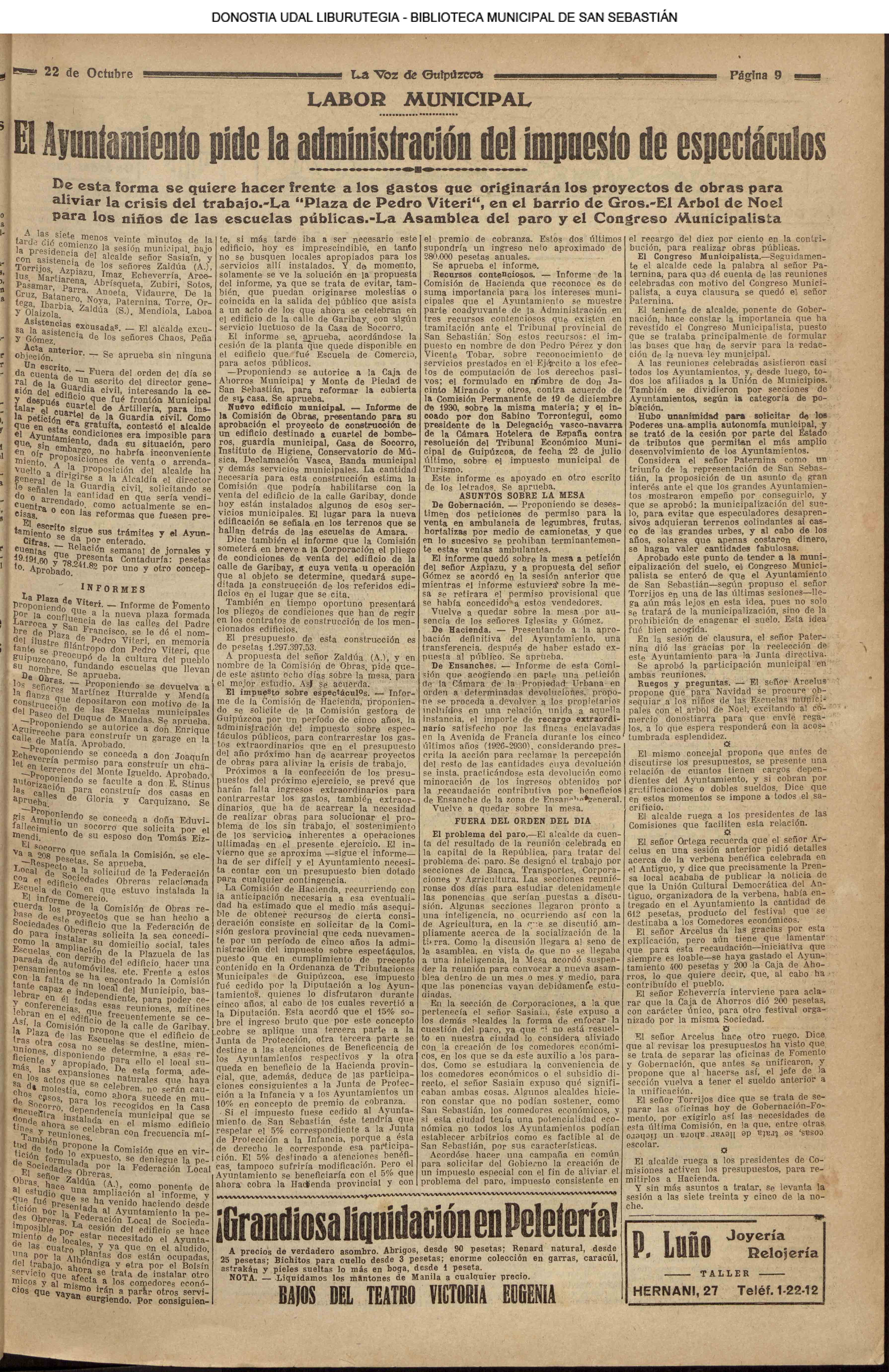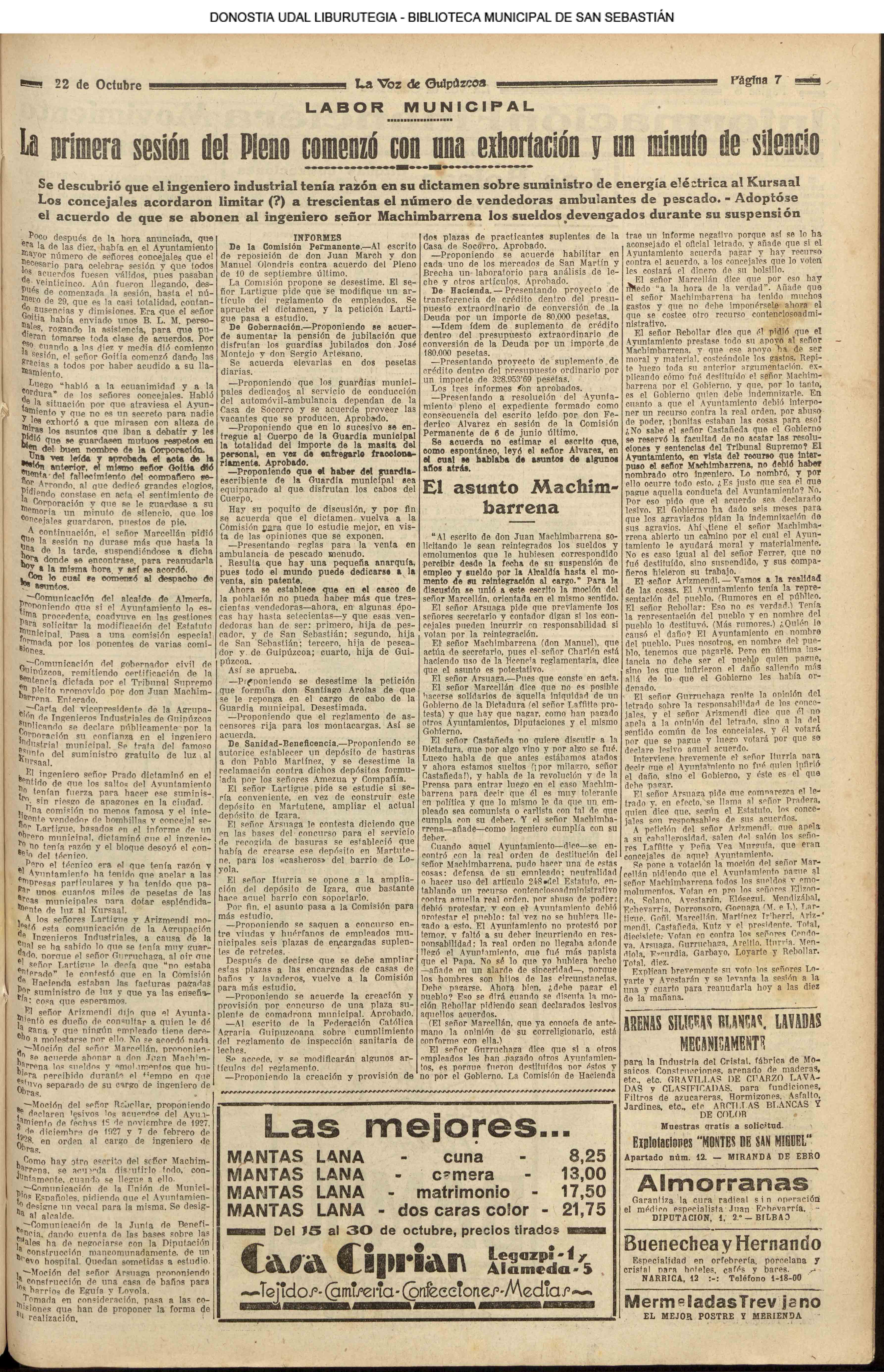 - La primera sesión del Pleno comenzó con una exhortación y un minuto de silencio - Se descubrió que el ingeniero industrial tenía razón en su dictamen sobre suministro de energía eléctrica al Kursaal Los concejales acordaron limitar (?) a trescientas el número de vendedoras ambulantes de pescado. - Adoptóse el acuerdo de que se abonen al ingeniero señor Machimbarrena los sueldos devengados durante su suspensión