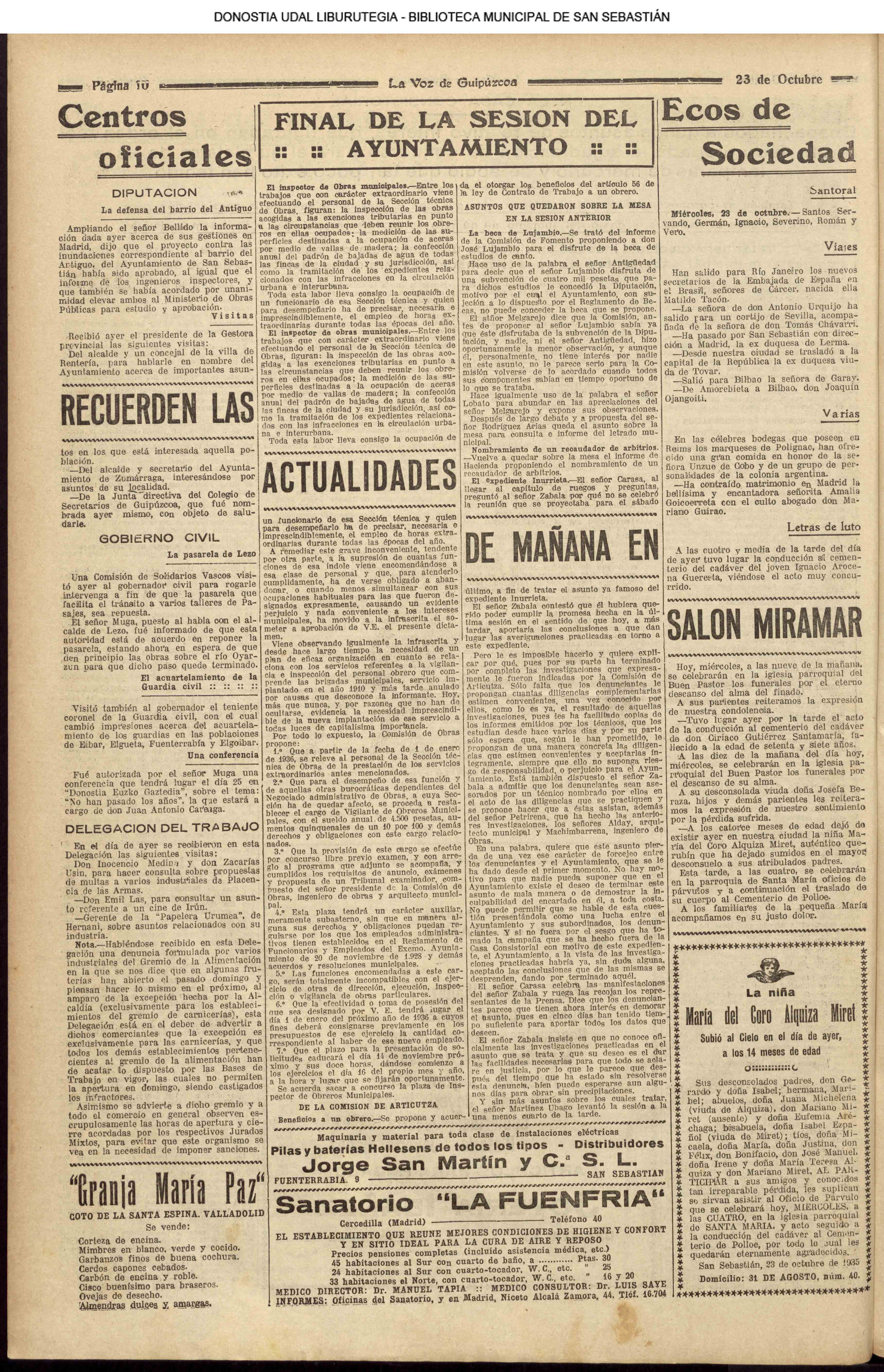22 - octubre![]() . | (1936) GUERRA CIVIL (Se ha ordenado el ataque definitivo a Madrid, que no será interrumpido hasta la rendición de la capital marxista) # En los Centros Oficiales - Obreros que trabajan una hora diaria a favor de la suscripción .- Un maestro nacionalista suspendido de empleo y sueldo.- Un donativo de 25.000 francos.-Una bandera de la columna Sagardía pasa al Museo de San Telmo.--Donativos para la ciudad de Irún, destruída por los rojos al abandonarla