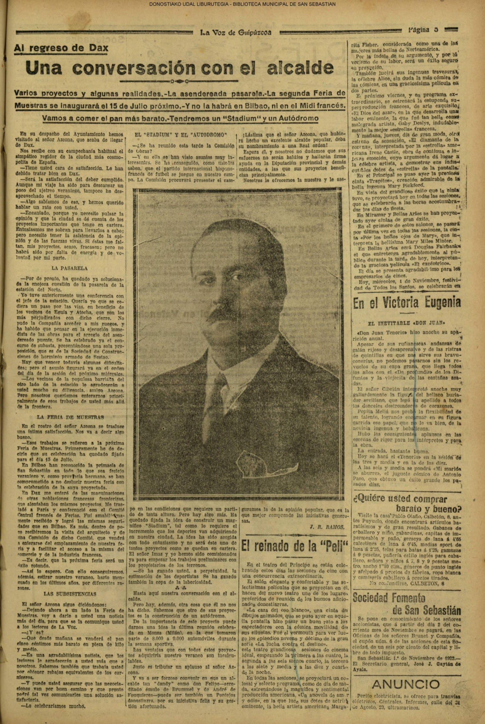 # UNA CONVERSACIÓN CON EL ALCALDE, a su regreso de Dax - Varios proyectos y algunas realidades.-La asendereada pasarela.-La segunda Feria de Muestras se inaugurará el 15 de Julio próximo.-Y no la habrá en Bilbao, ni en el Midi francés..- Vamos a comer el pan más barato.-Tendremos un "Stadium" y un Autódromo