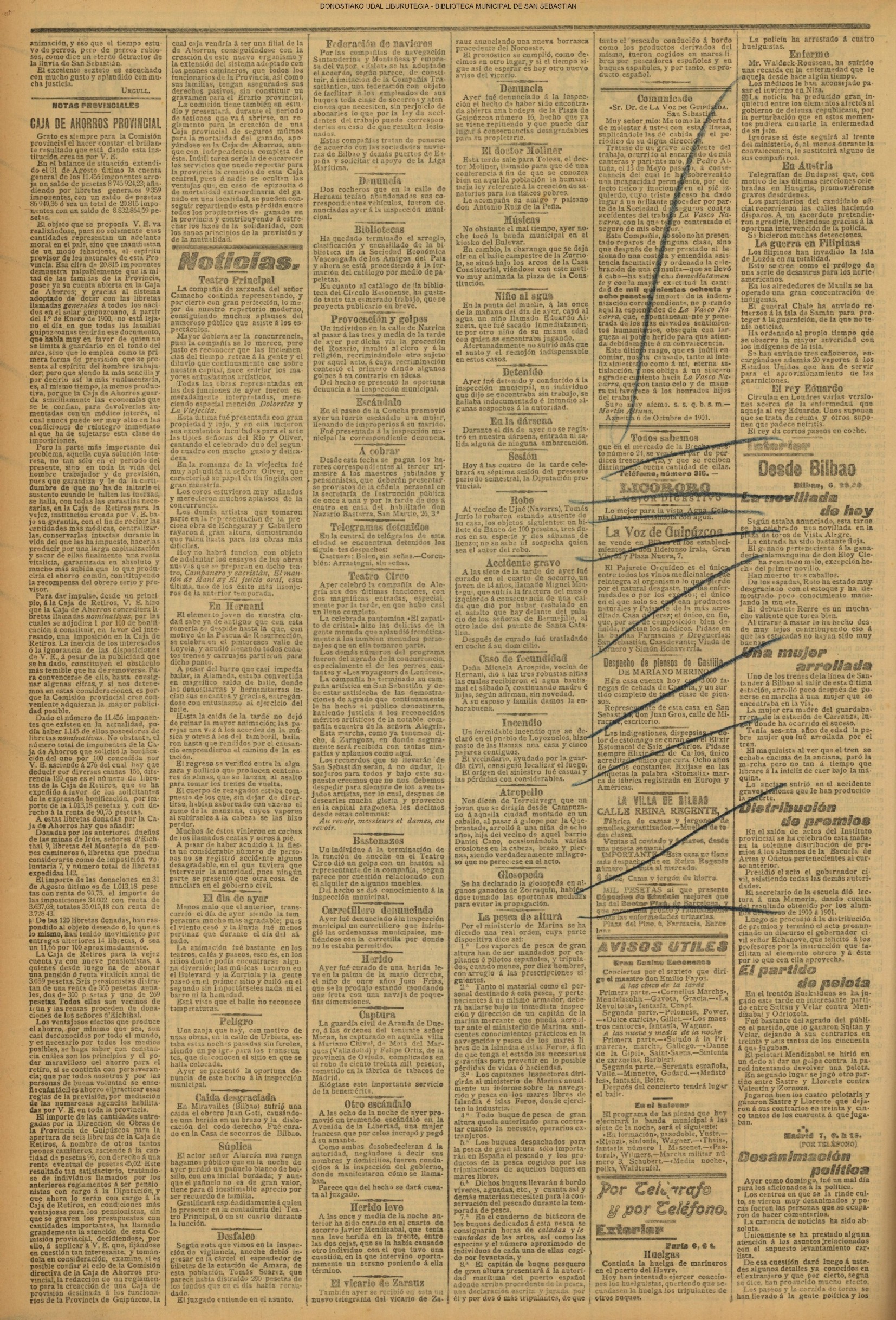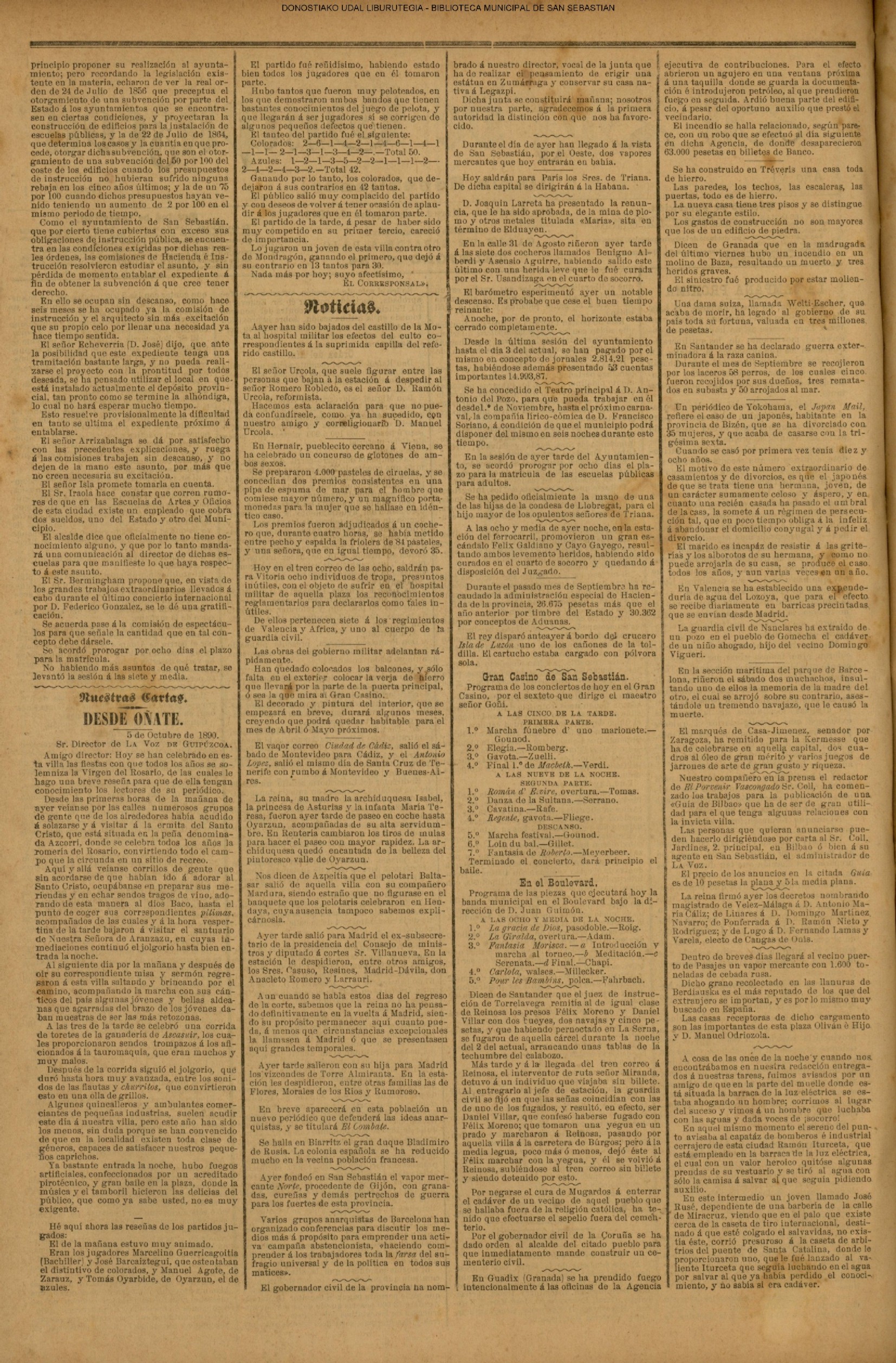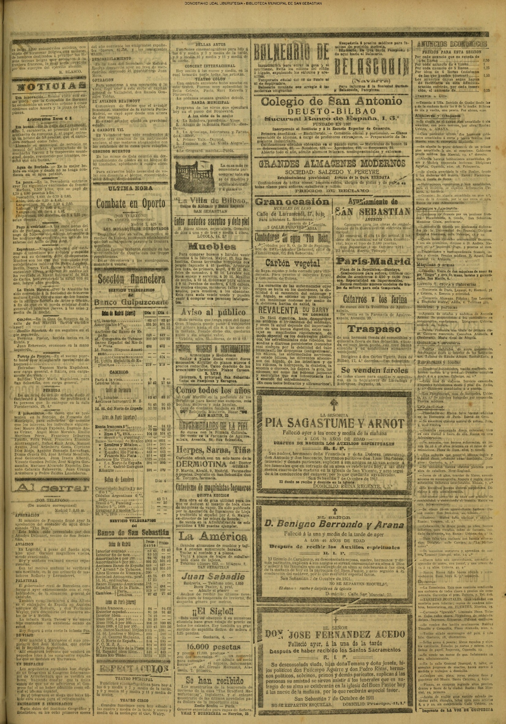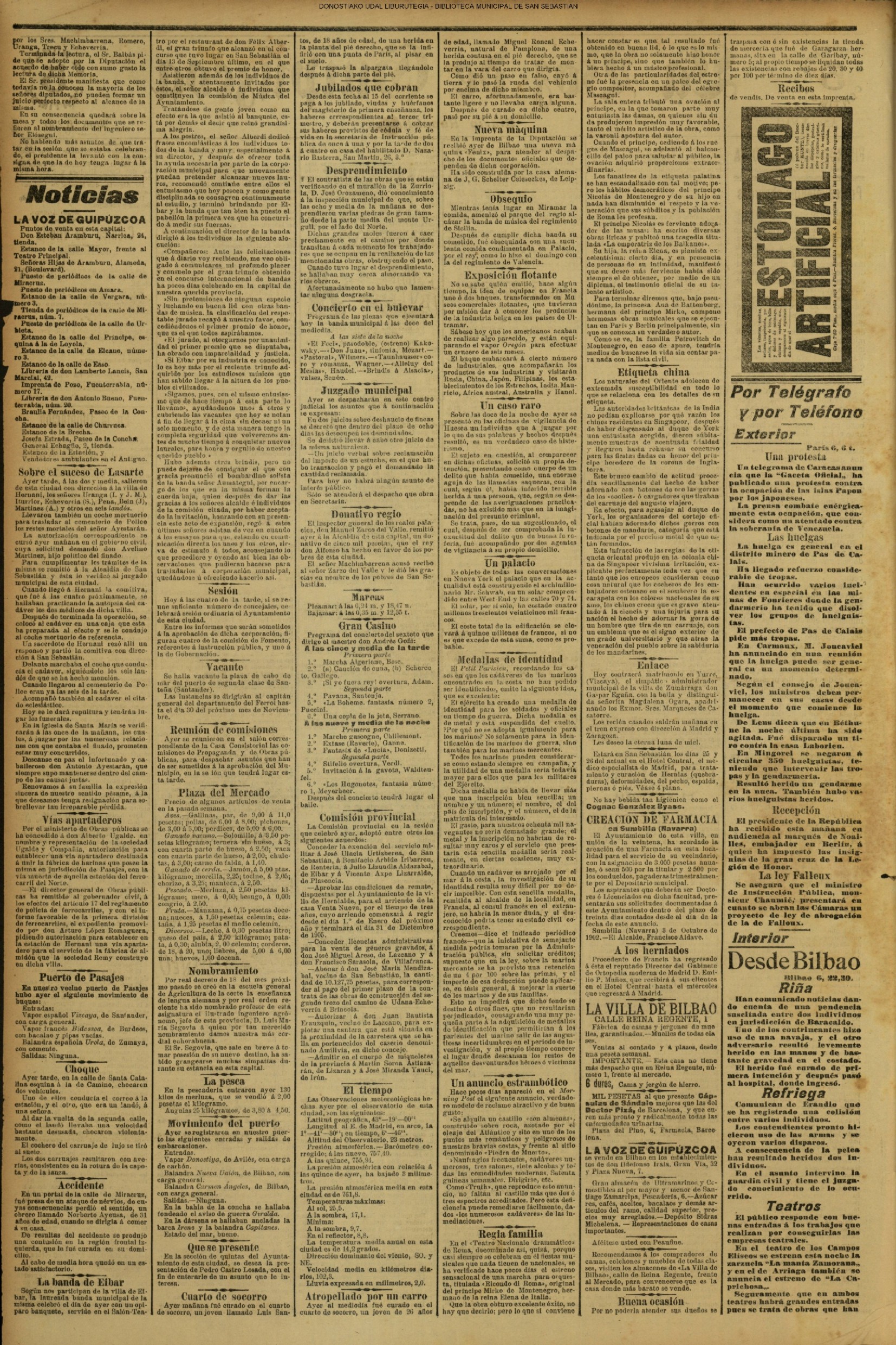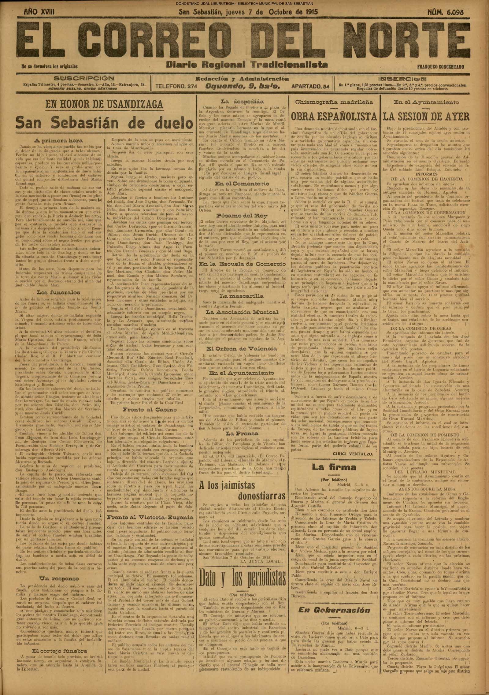 (1890) Esta noche, el capataz de bomberos e industrial cerrajero de esta Ciudad, D. Ramón Iturzaeta, trata de salvar, con exposición de la suya, la vida de un hombre que flotaba sobre la corriente, cerca del puente de Santa Catalina; Ignacio Usandizaga, de 32 años, natural de Asteasu. Era algo corto de vista y se caería seguramente. (La Voz de Guipúzcoa / cont.))