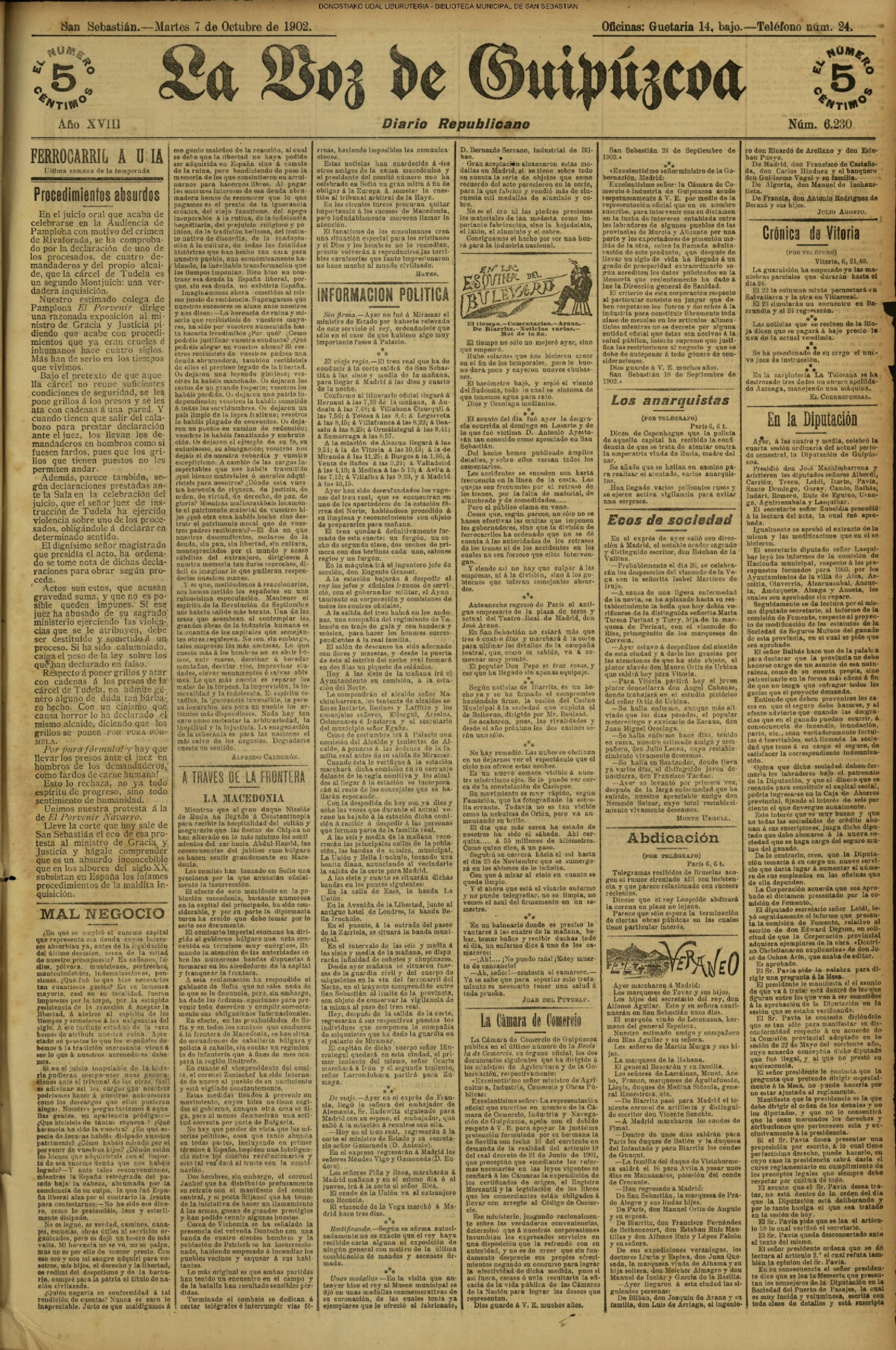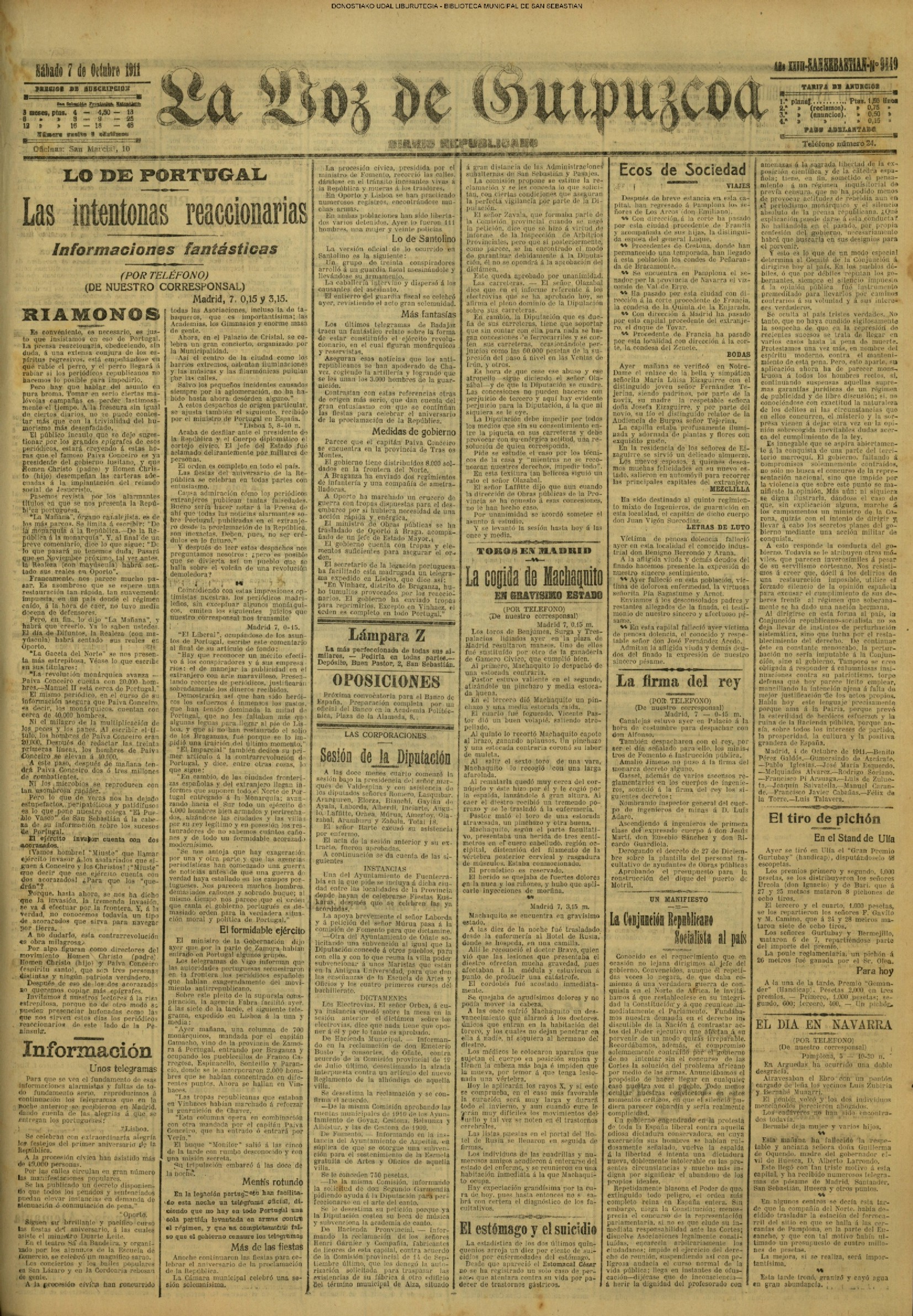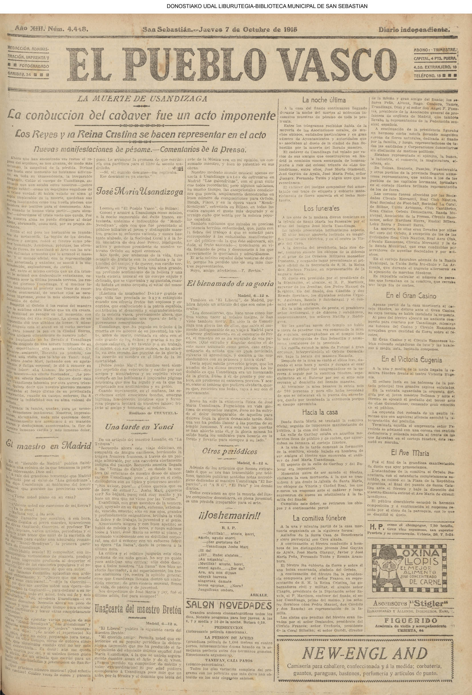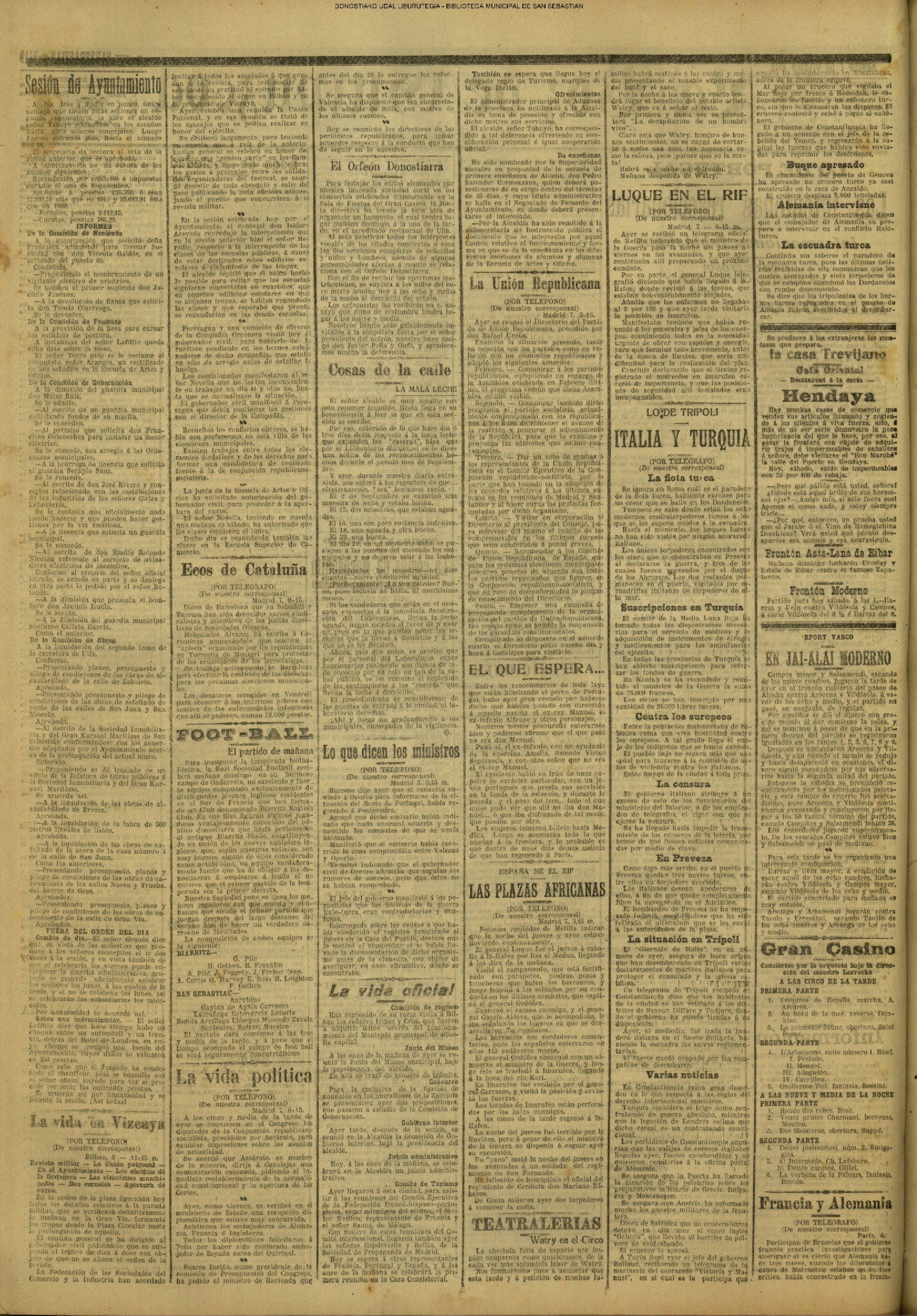 (1890) Esta noche, el capataz de bomberos e industrial cerrajero de esta Ciudad, D. Ramón Iturzaeta, trata de salvar, con exposición de la suya, la vida de un hombre que flotaba sobre la corriente, cerca del puente de Santa Catalina; Ignacio Usandizaga, de 32 años, natural de Asteasu. Era algo corto de vista y se caería seguramente. (La Voz de Guipúzcoa / cont.))