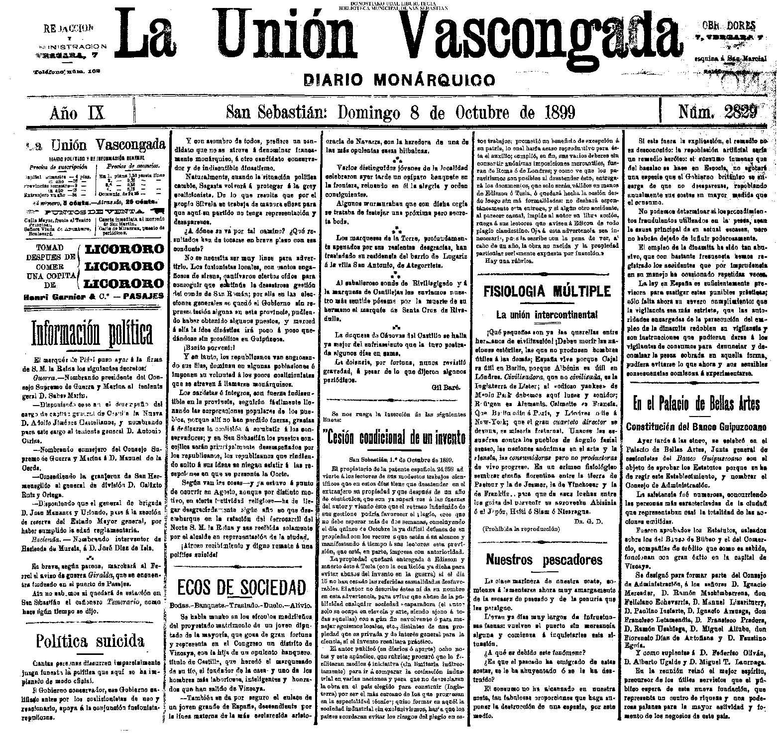 (1899) En Junta general de accionistas, celebrada en el palacio Bellas Artes, se aprueban los estatutos fundacionales del Banco Guipuzcoano y el primer Consejo de Administración de éste, compuesto de 12 miembros efectivos —encabezados por D. Ignacio Mercader— y 3 suplentes.(La Voz de Guipúzcoa)(La Unión Vascongada)(El Correo de Guipúzcoa)