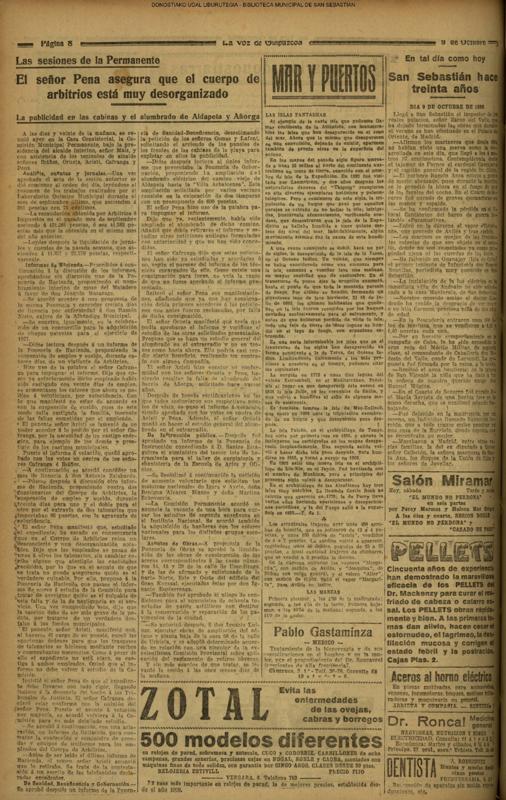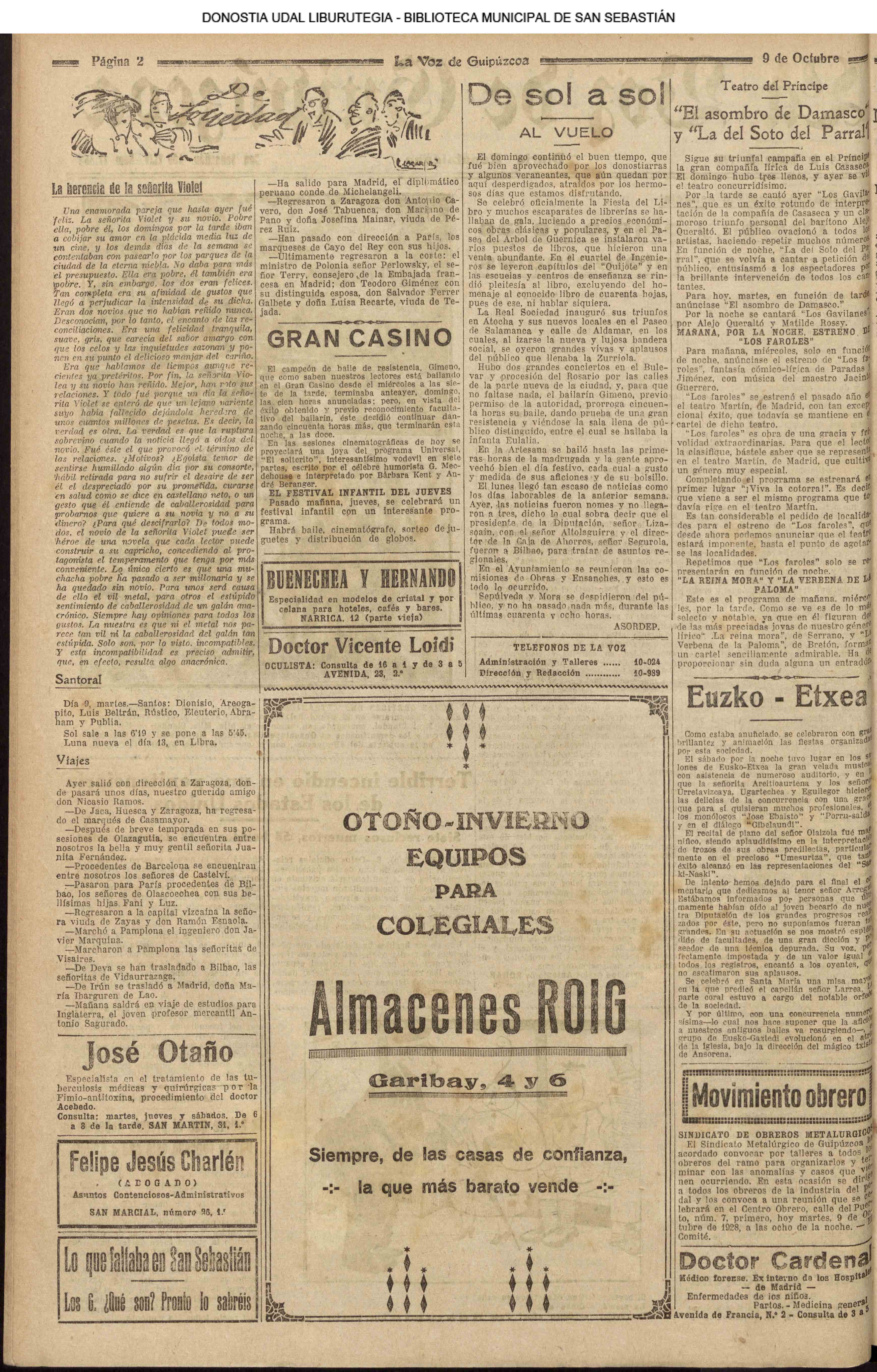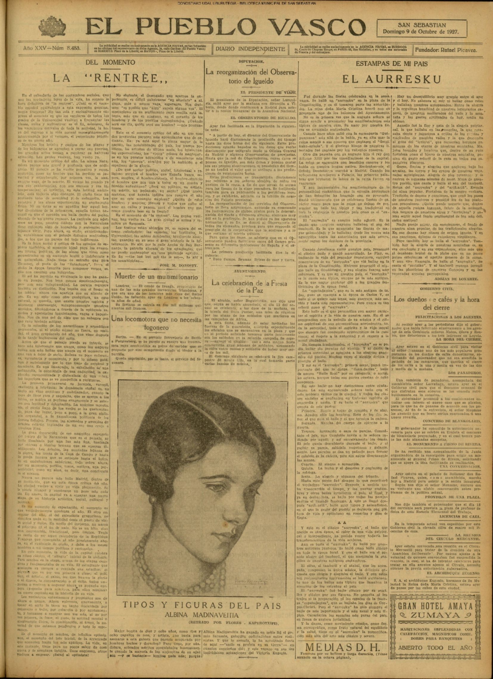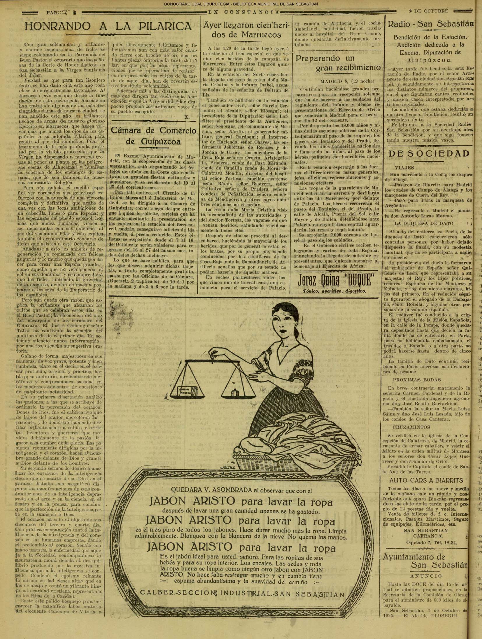 08 - octubre![]() | (1944). REAL SOCIEDAD (5-1) BARACALDO - (Histórico) @ - (HOJA DEL LUNES)(EL DIARIO VASCO)(LA VOZ DE ESPAÑA)# Un autobús de Lasarte atropella mortalmente al joven Javier Elósegui. (1950) ALCOYANO (1-4) REAL SOCIEDAD @ - (HOJA DEL LUNES)(EL DIARIO VASCO)(LA VOZ DE ESPAÑA)# Fallece don Eduardo Lagarde Aramburu, coronel retirado de Infantería, arquitecto- jefe de Regiones Devastadas de Toledo y celebradísimo dibujante. (1953) Boda, en Ayete, de D. José Luis Barrenechea y Margarita Hernández. (1955) - El gobernador civil oficia al alcalde recordando la disposición del 8 de mayo pasado por la que se prohibe la utilización de papel usado o impreso, en especial periódicos, para la envoltura de artículos alimenticios en mercados y pescaderías. (1957) Inauguración del curso académico en el Instituto de Enseñanza Media «Peñaflorida». Por primera vez se efectúa este acto en el nuevo edificio del Ensanche de Amara. |