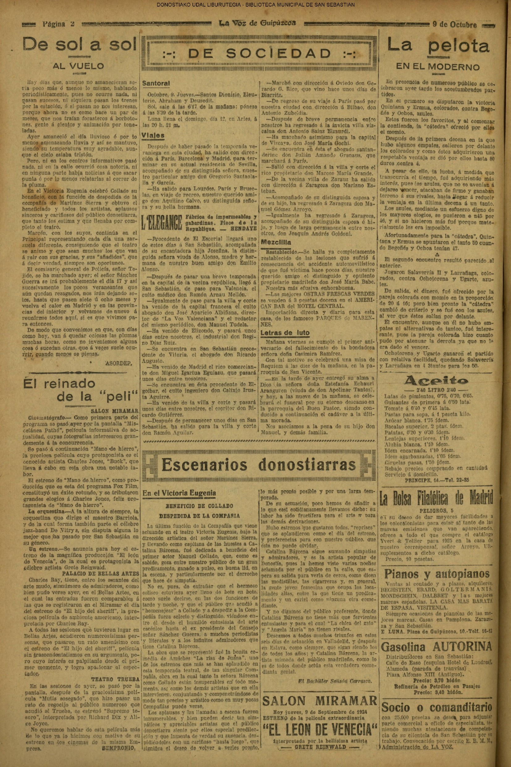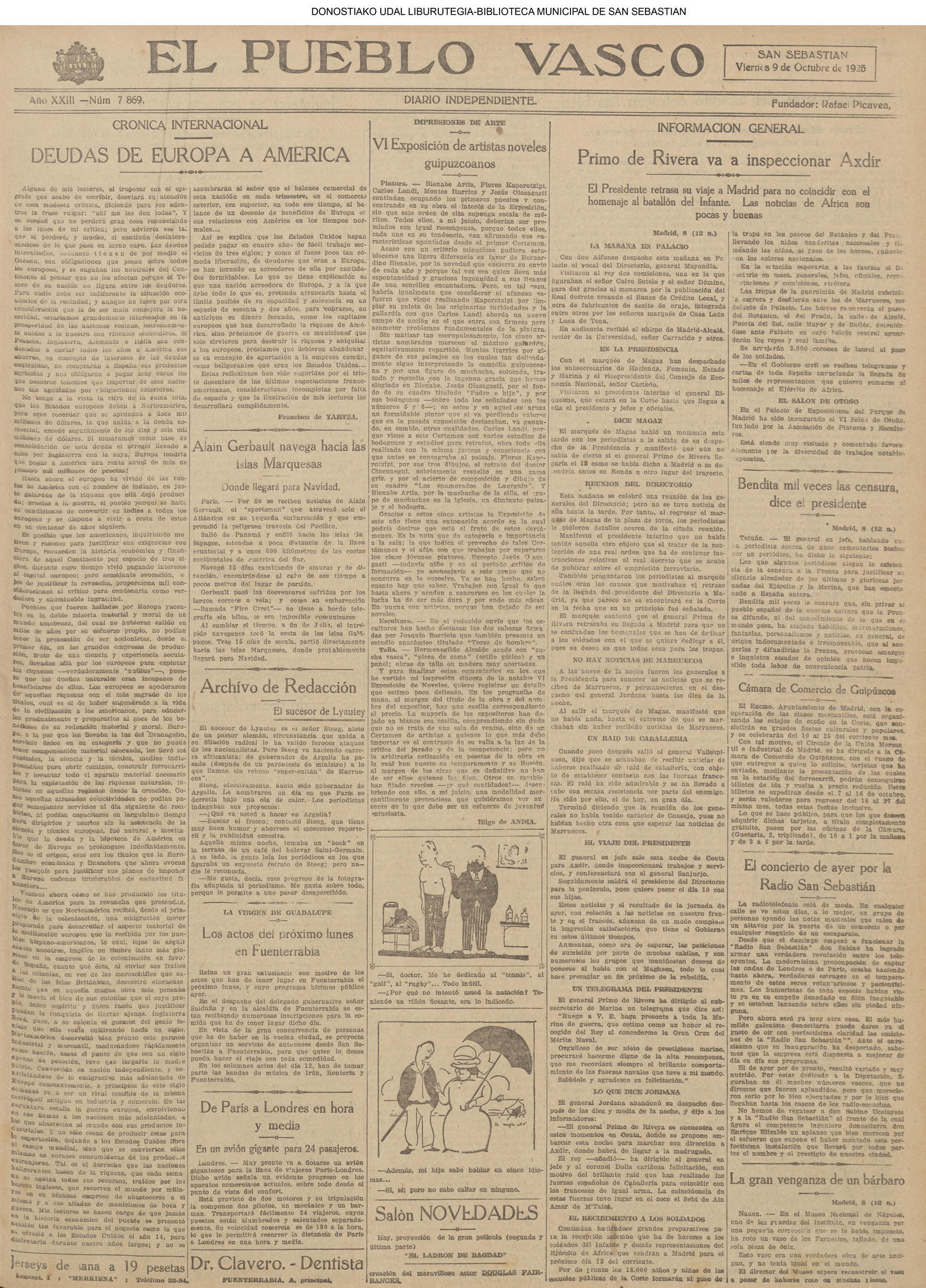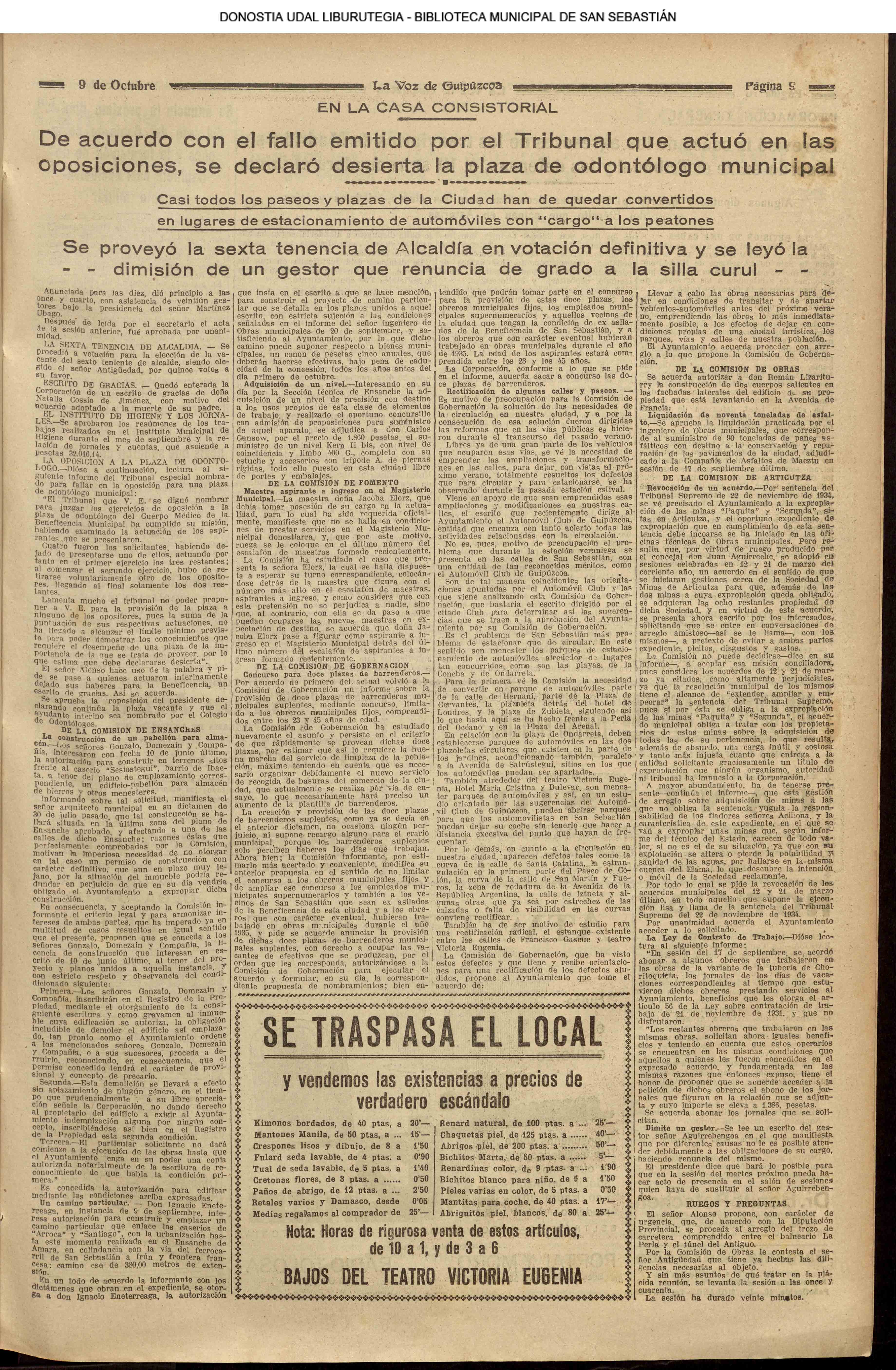 08 - octubre![]() | (1944). REAL SOCIEDAD (5-1) BARACALDO - (Histórico) @ - (HOJA DEL LUNES)(EL DIARIO VASCO)(LA VOZ DE ESPAÑA)# Un autobús de Lasarte atropella mortalmente al joven Javier Elósegui. (1950) ALCOYANO (1-4) REAL SOCIEDAD @ - (HOJA DEL LUNES)(EL DIARIO VASCO)(LA VOZ DE ESPAÑA)# Fallece don Eduardo Lagarde Aramburu, coronel retirado de Infantería, arquitecto- jefe de Regiones Devastadas de Toledo y celebradísimo dibujante. (1953) Boda, en Ayete, de D. José Luis Barrenechea y Margarita Hernández. (1955) - El gobernador civil oficia al alcalde recordando la disposición del 8 de mayo pasado por la que se prohibe la utilización de papel usado o impreso, en especial periódicos, para la envoltura de artículos alimenticios en mercados y pescaderías. (1957) Inauguración del curso académico en el Instituto de Enseñanza Media «Peñaflorida». Por primera vez se efectúa este acto en el nuevo edificio del Ensanche de Amara. |