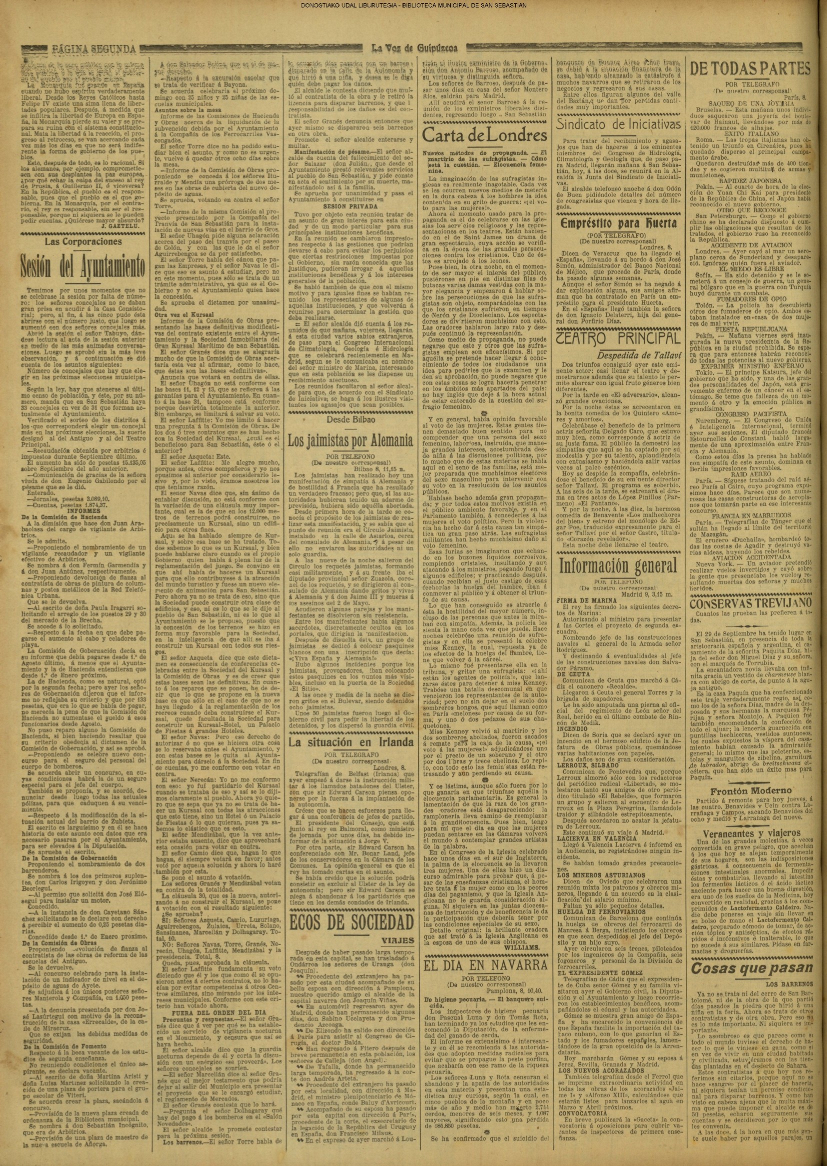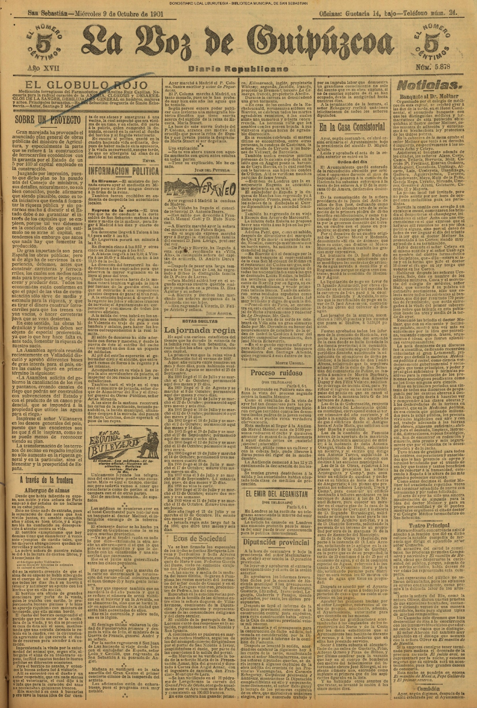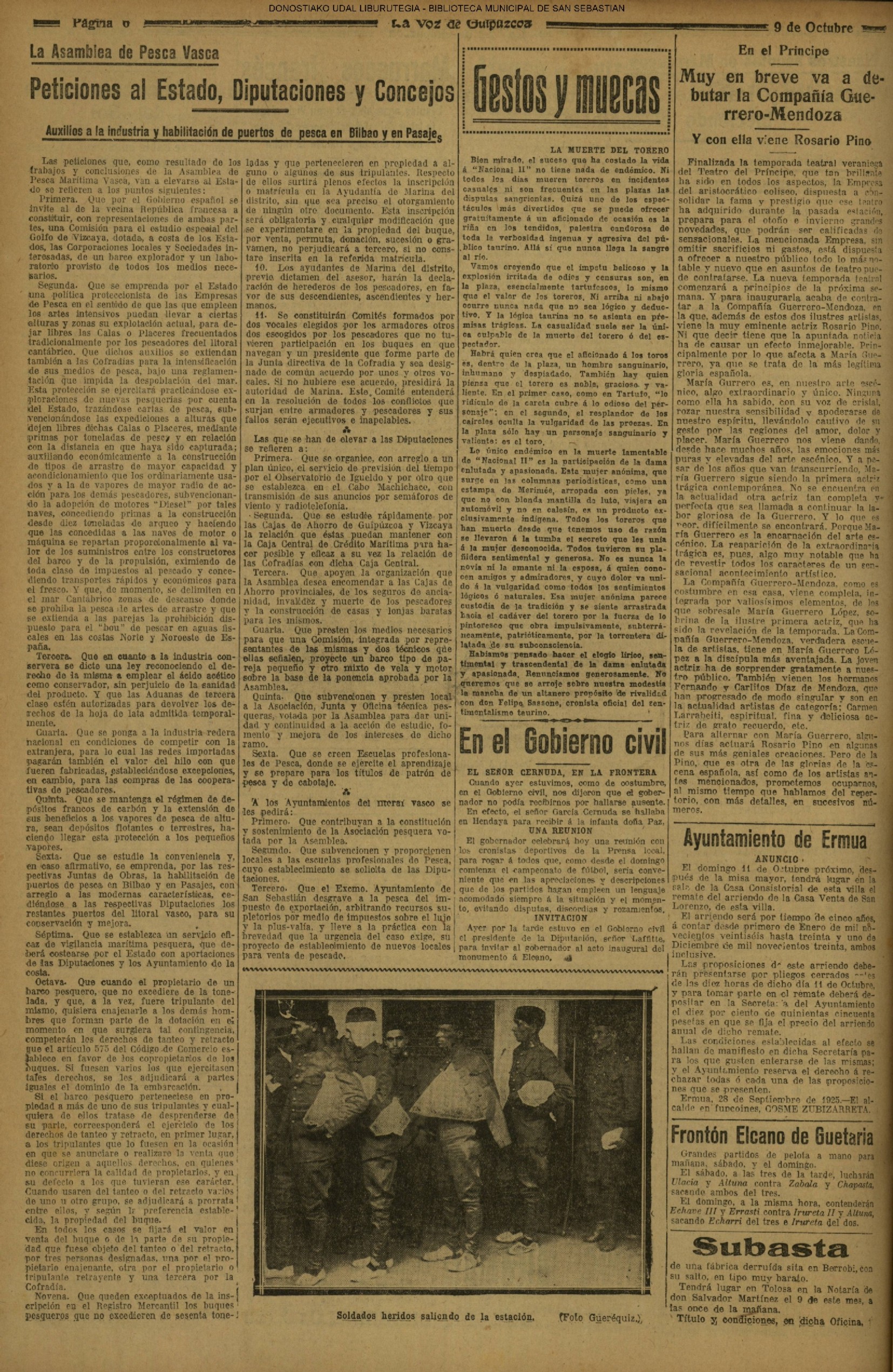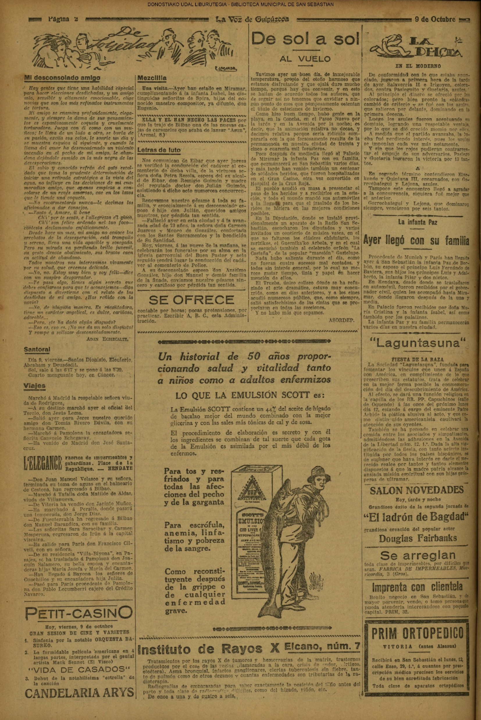08 - octubre![]() | (1944). REAL SOCIEDAD (5-1) BARACALDO - (Histórico) @ - (HOJA DEL LUNES)(EL DIARIO VASCO)(LA VOZ DE ESPAÑA)# Un autobús de Lasarte atropella mortalmente al joven Javier Elósegui. (1950) ALCOYANO (1-4) REAL SOCIEDAD @ - (HOJA DEL LUNES)(EL DIARIO VASCO)(LA VOZ DE ESPAÑA)# Fallece don Eduardo Lagarde Aramburu, coronel retirado de Infantería, arquitecto- jefe de Regiones Devastadas de Toledo y celebradísimo dibujante. (1953) Boda, en Ayete, de D. José Luis Barrenechea y Margarita Hernández. (1955) - El gobernador civil oficia al alcalde recordando la disposición del 8 de mayo pasado por la que se prohibe la utilización de papel usado o impreso, en especial periódicos, para la envoltura de artículos alimenticios en mercados y pescaderías. (1957) Inauguración del curso académico en el Instituto de Enseñanza Media «Peñaflorida». Por primera vez se efectúa este acto en el nuevo edificio del Ensanche de Amara. |
