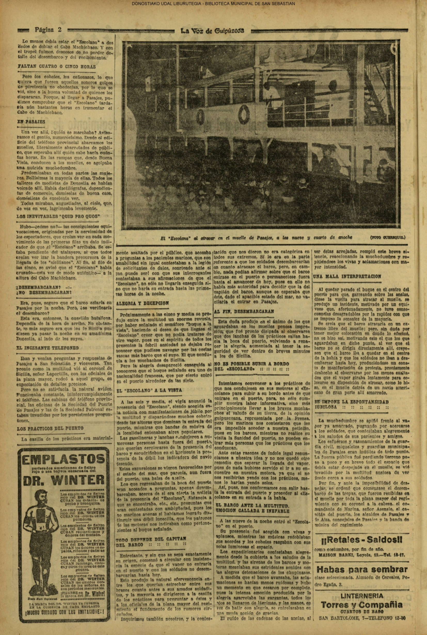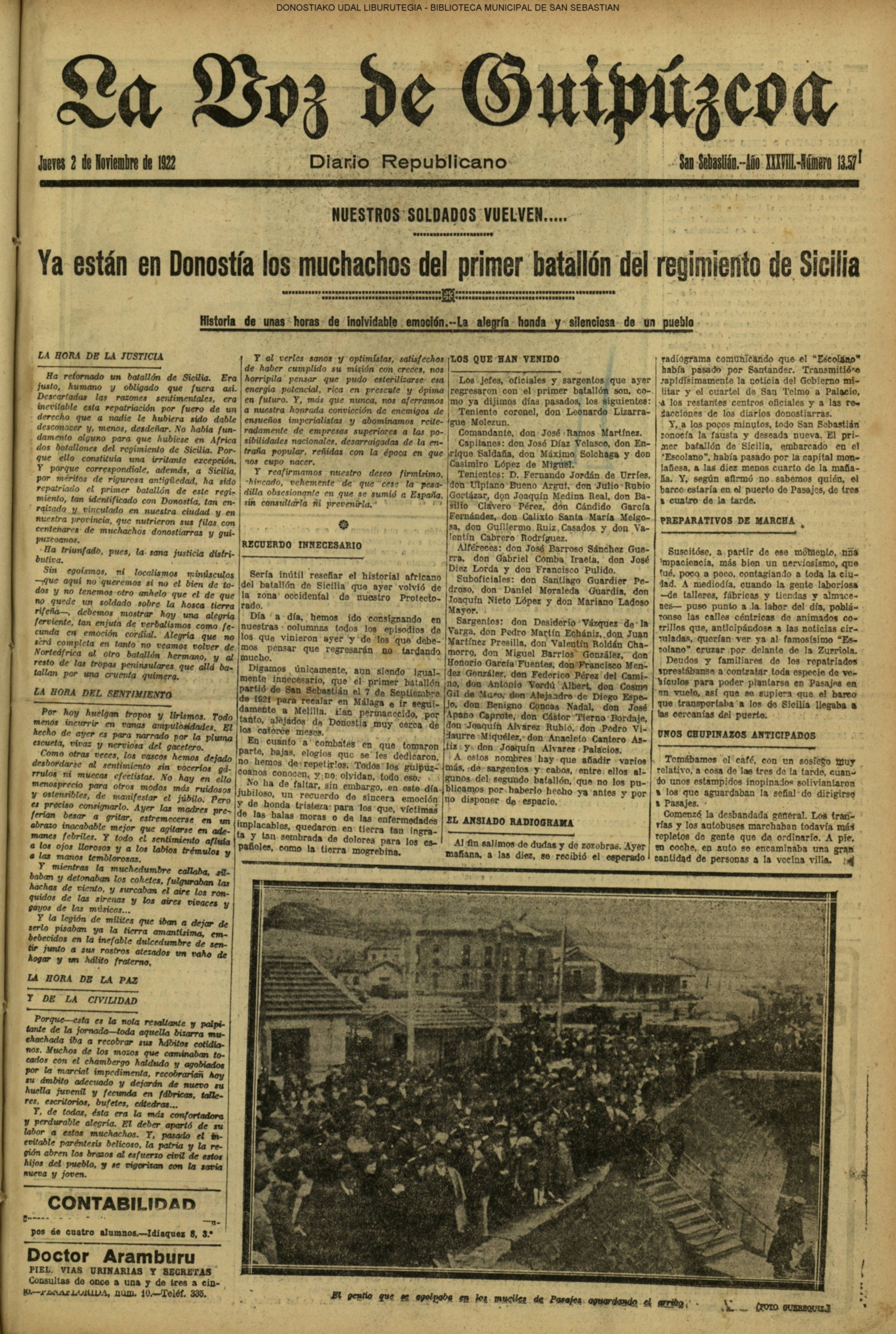 # A las nueve de la noche atraca en Pasajes el vapor "Escolano'', que traía a los muchachos del primer batallón de "Sicilia", que partió para la campaña marroquí el 7 de septiembre del año anterior. Al frente de estos queridos y heroicos repatriados vienen el teniente coronel don Leonardo Liza y el comandante don José Ramos Martínez. Una vez en San Sebastián, a donde llegaron en tren, a las 11 y 5, fueron directamente a Santa María donde el Orfeón entonó una Salve y el prelado, Monseñor Irastorza, dio la bienvenida a las tropas y las bendijo.