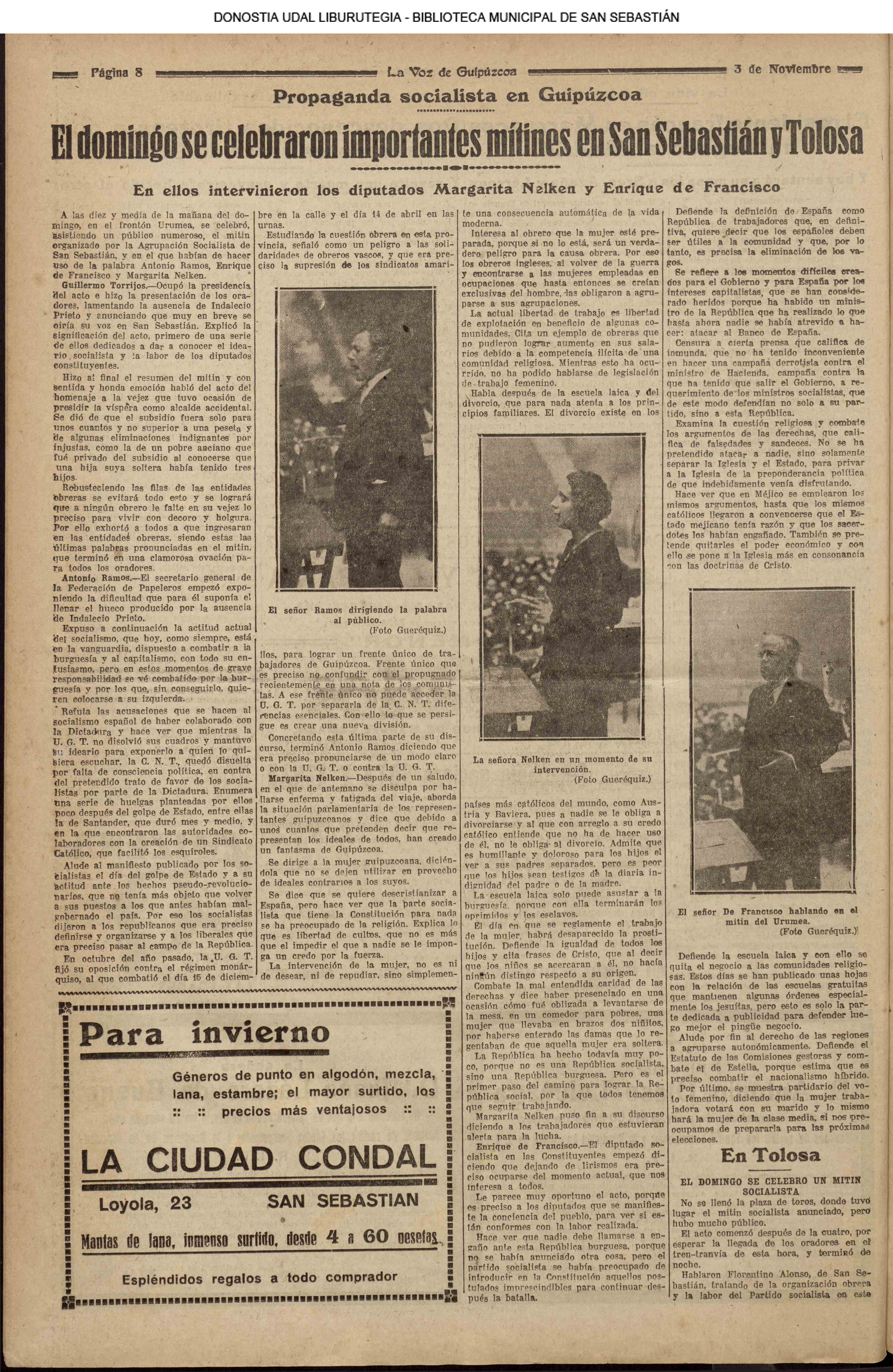 (1931) Propaganda socialista en Guipúzcoa - El domingo se celebraron importantes mítines en San Sebastián y Tolosa - En ellos intervinieron los diputados Margarita Nelken y Enrique de Francisco .(La Voz de Guipúzcoa / cont)