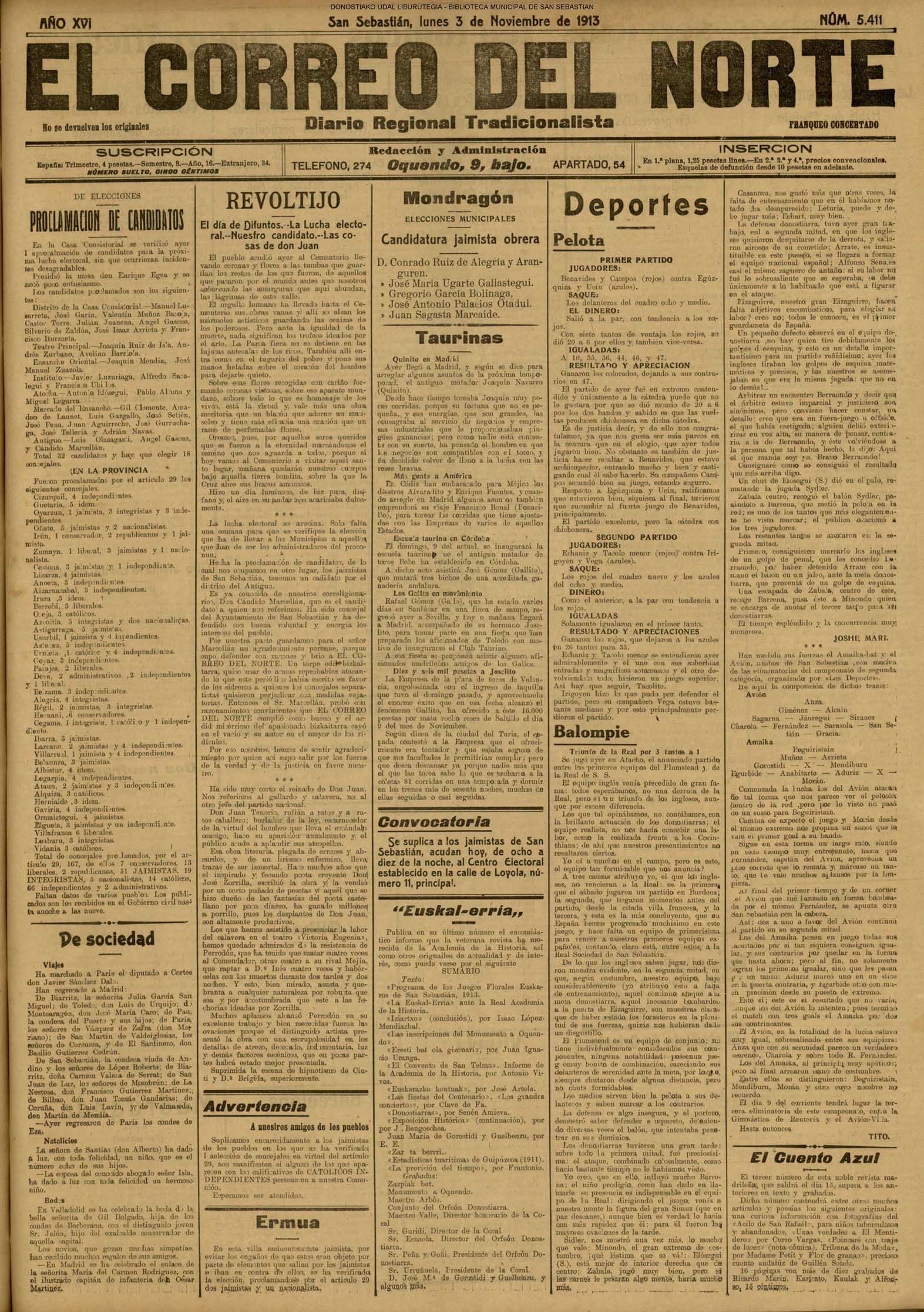 (SÁBADO) (*)XXIII CERTAMEN DE MASAS CORALES DE TOLOSA (EL DIARIO VASCO. 03/11. ps. 86 y 87) PRENSA DEL DÍA: .-DV (SAN SEBASTIÁN)(02/11) : .- Una tradición que nunca muere. Las visitas a los cementerios y los habituales postres (buñuelos y huesos de santo)marcaron un soleado día de Todos los Santos. (pág.12) .- El Antiguo, un barrio en transición ante el crecimiento del nuevo ensanche de Ibaeta. En dos décadas ha perdido su carácter de barrio obrero e industrial , dando paso al prestigio de una zona acomodada. - En los próximos años tendrá que adaptarse al asentamiento de miles de personas. - La población del barrio es joven y en su mayoría nacida en el municipio.(pág.13)
