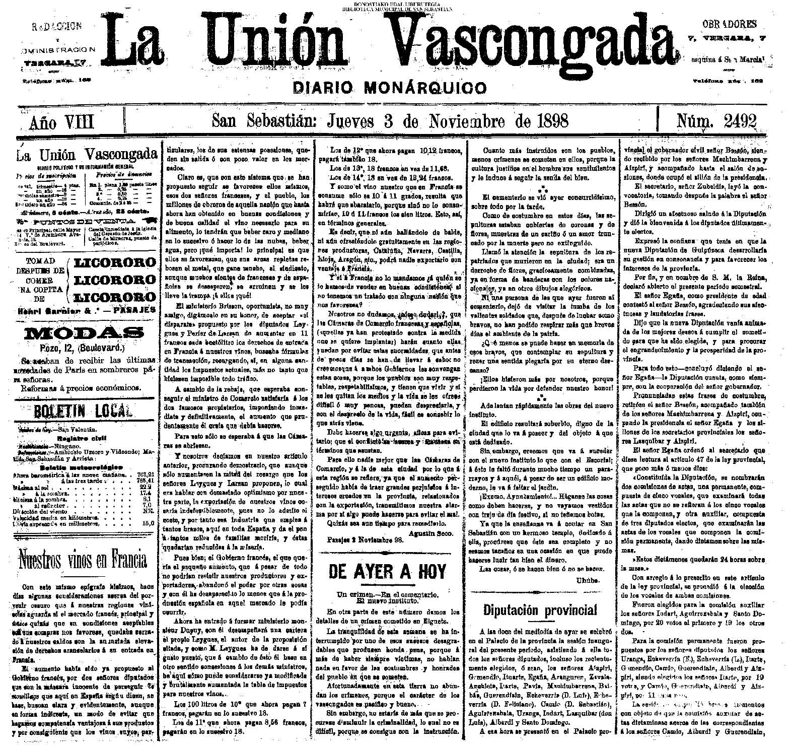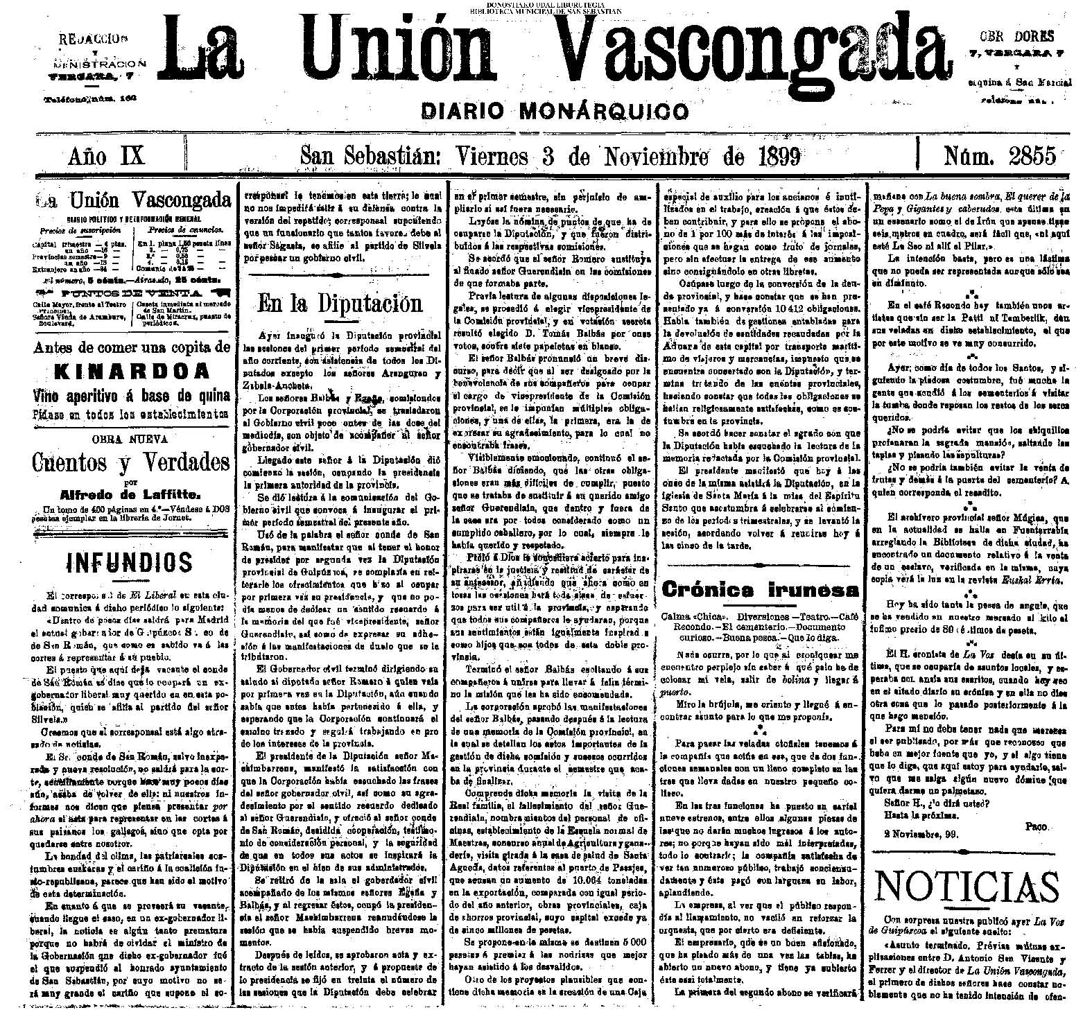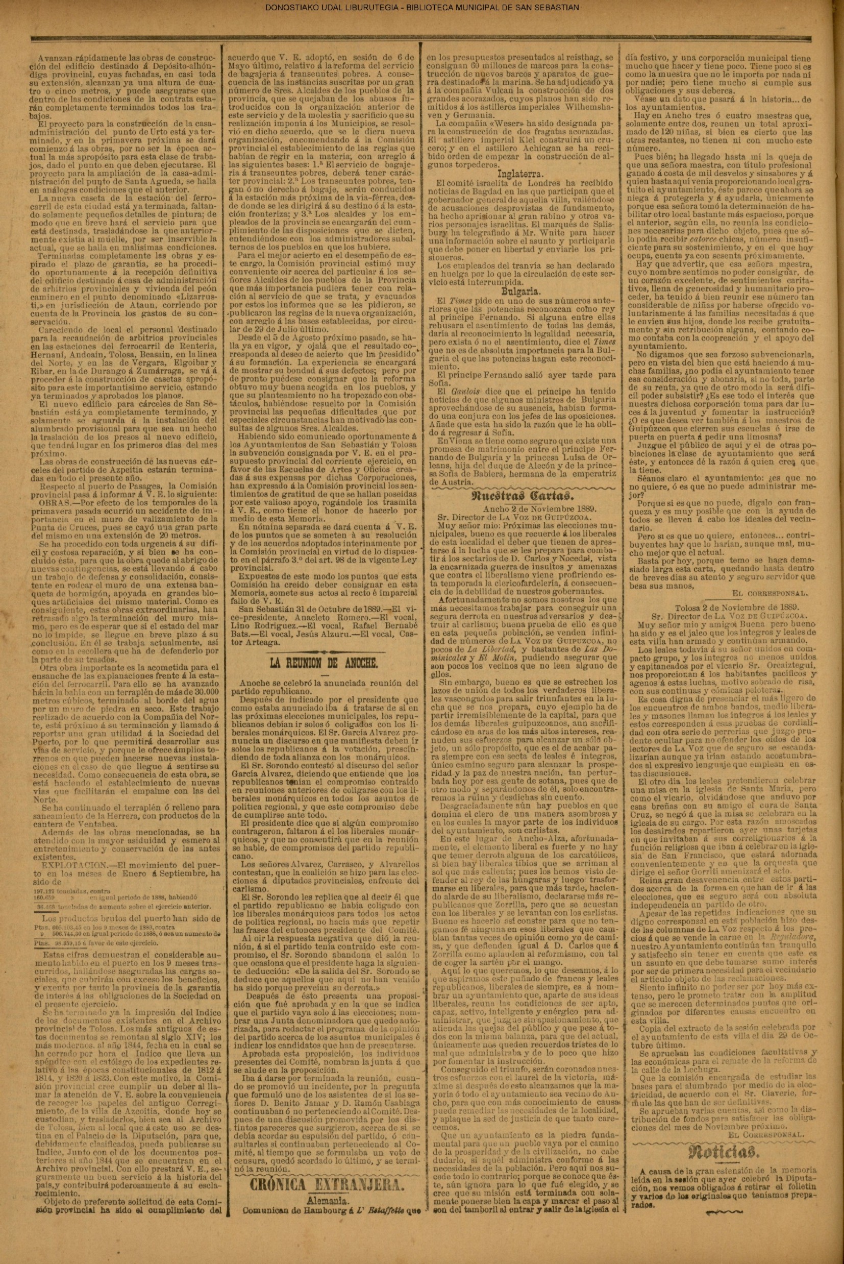 | 1875 | (MARTES) (*).- El voluntario Manuel Olaondo da parte verbal de que ayer, en el camino de Hernani, han sido presas y llevadas por los carlistas, su hermana Ursula Olaondo, su acompañante y su tío (FUENTE: "Anales de la Segunda Guerra Carlista en San Sebastián". FERMIN MUÑOZ ECHABEGUREN). (*).- A las cuatro de la tarde tuvo lugar la Conducción al Cementerio de esta Ciudad de los restos mortales de D. Francisco Mendía, Comandante del tercer batallón de Voluntarios, muerto repentinamente de madrugada. El acto fue presidido por el Brigadier Gobernador militar Sr. Calvet y el 2º Comandante del tercer batallón Sr. Lasquibar, asistiendo a él un numeroso concurso. Las cintas del túmulo eran llevadas por los Comandantes del primer batallón de Voluntarios, Sres. Arcelus y Albarellos, el del segundo batallón Sr. Ibarzabal, y el coronel graduado teniente coronel, jefe del batallón de Miqueletes, Sr. Logendio, prestando los honores la charanga de Voluntarios y dos compañías del tercer batallón, cuyo mando tenía el finado Mendía. (DIARIO DE SAN SEBASTIÁN. 03/11. p.01) (*).- HERNANI, 2 de Noviembre: Las baterías enemigas de Basaun y Santiago-mendi han continuado hoy molestando a esta villa con sus disparos. La primera, sobre todo, ha estado muy molesta y tenaz, especialmente entre diez y doce de la mañana, metiendo varios proyectiles en la casa-palacio del general Barrenechea, donde uno de los cascos ha herido en un brazo a una mujer; en la del Sr. Sanchez Salvador y su inmediata, en la confitería del Sr. Fernandez, en casa de Mochados, en la del carnicero José y en otras que no recuerdo en este momento. Una de las granadas enemigas ha reventado en medio de 17 músicos de Puerto Rico, envolviéndolos en humo y escombros y rompiendo los cascos algunos instrumentos, y sin embargo, parece providencial, ni uno solo de aquellos ha recibido no solo herida alguna sino ni aun la menor contusión. Santiago-mendi por su parte ha disparado sobre la plaza del Mercado y resto de la población. Los edificios han padecido bastante, ascendiendo el total de proyectiles lanzados a 29 (Basaun 16 y 13 Santiago-mendi). Los cañones Krupp han hecho callar por mucho rato al enemigo. No hemos tenido más bajas que la mujer herida de que dejo hecha mención, gracias a los vigias de la Torre que prestan admirablemente su penoso servicio. El vecindario y la guarnición con excelente espíritu. (DIARIO DE SAN SEBASTIÁN. 03/11. p.02) |