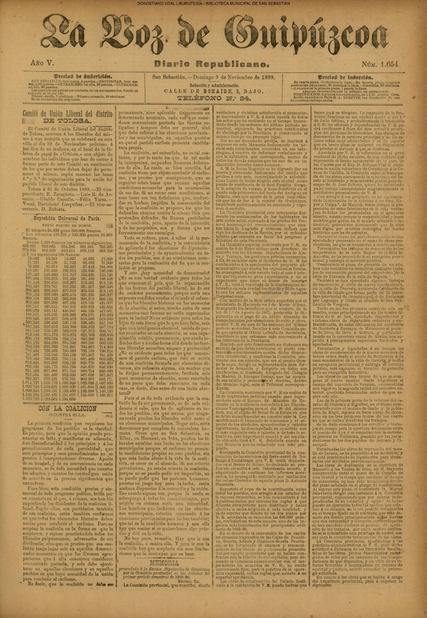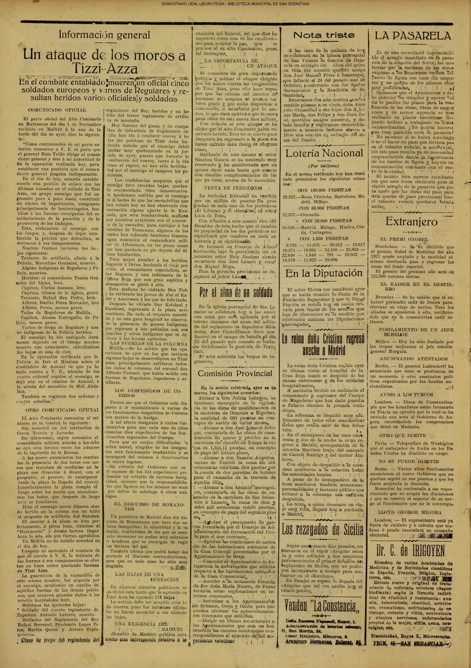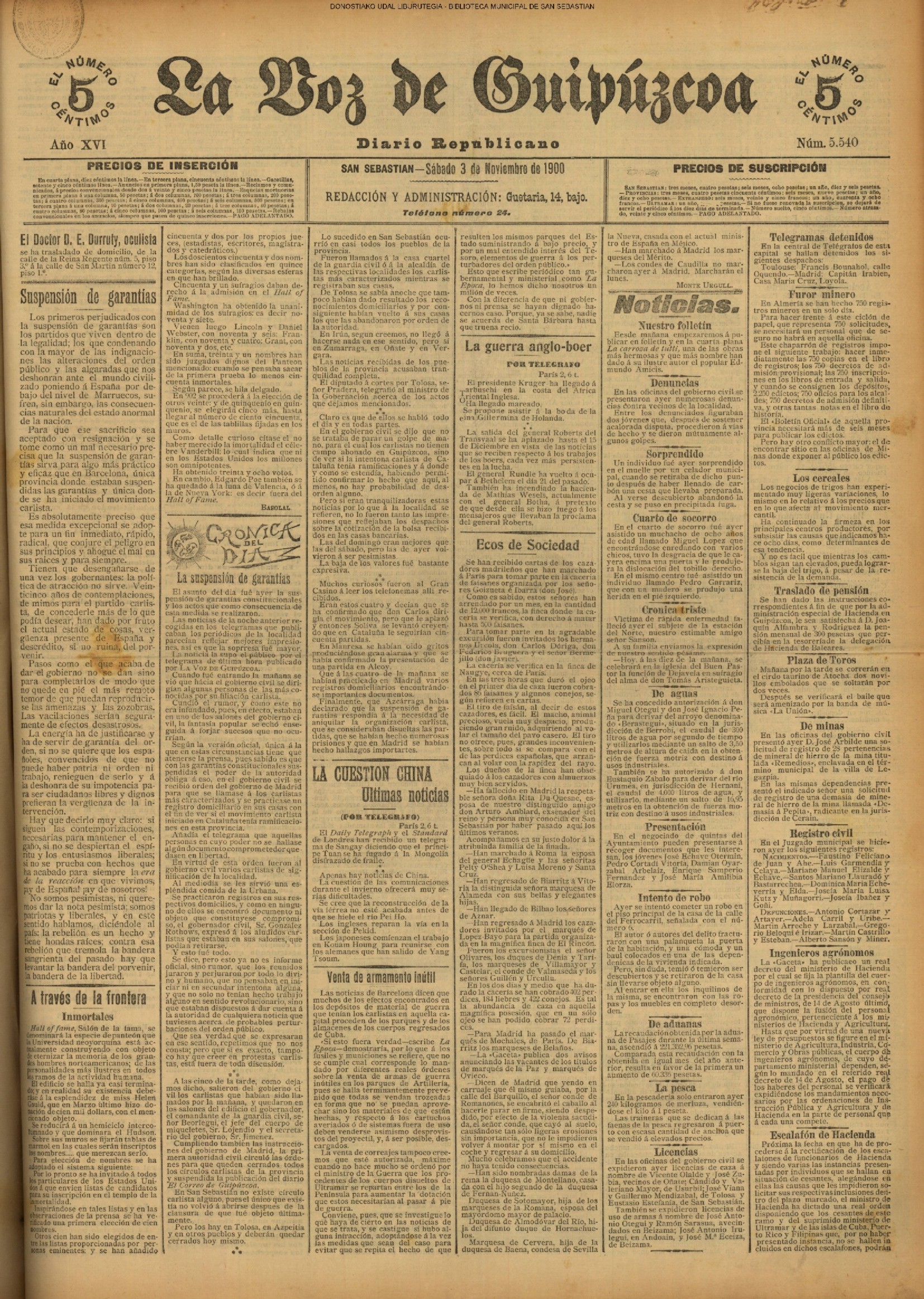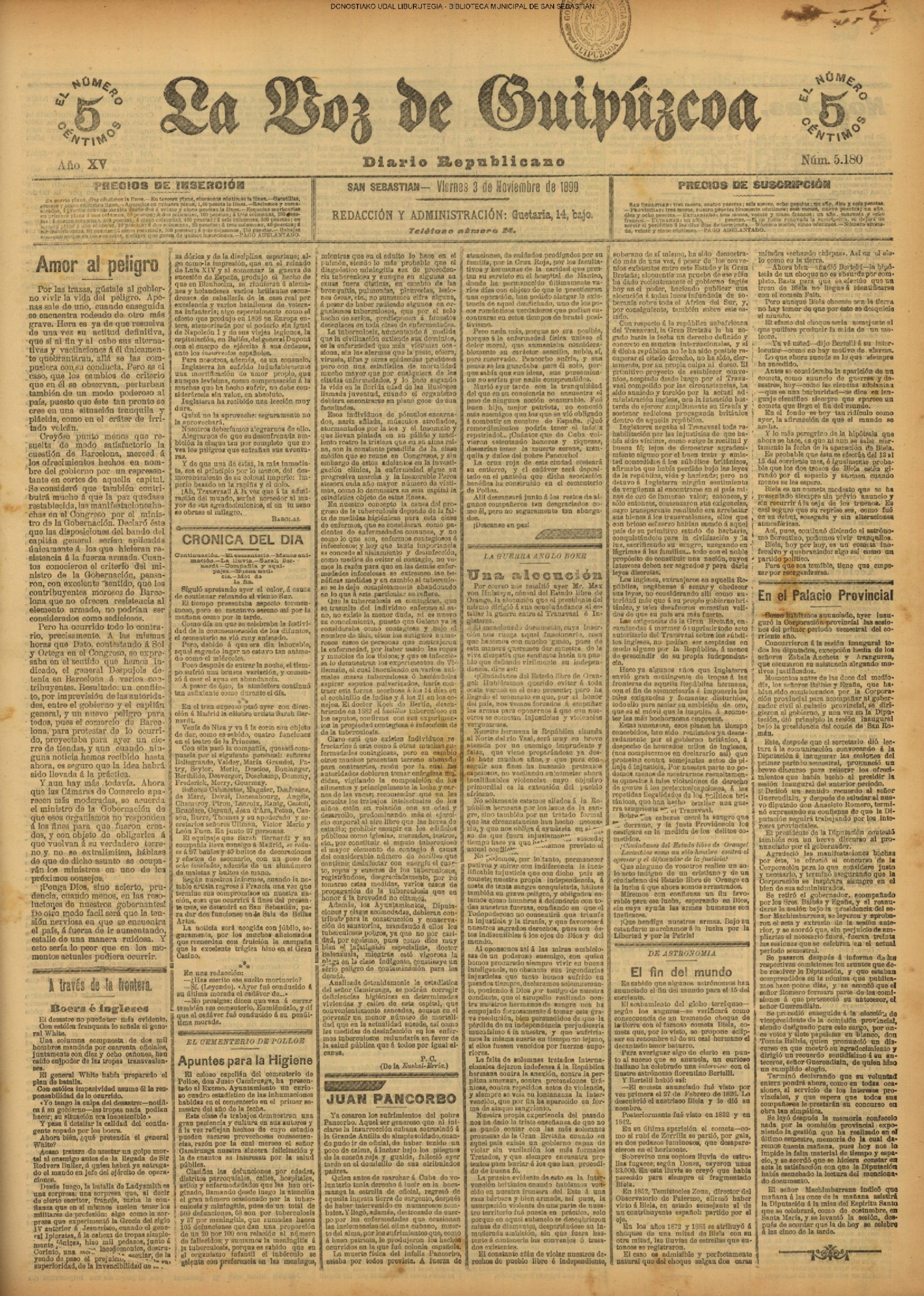 | 1875 | (MARTES) (*).- El voluntario Manuel Olaondo da parte verbal de que ayer, en el camino de Hernani, han sido presas y llevadas por los carlistas, su hermana Ursula Olaondo, su acompañante y su tío (FUENTE: "Anales de la Segunda Guerra Carlista en San Sebastián". FERMIN MUÑOZ ECHABEGUREN). (*).- A las cuatro de la tarde tuvo lugar la Conducción al Cementerio de esta Ciudad de los restos mortales de D. Francisco Mendía, Comandante del tercer batallón de Voluntarios, muerto repentinamente de madrugada. El acto fue presidido por el Brigadier Gobernador militar Sr. Calvet y el 2º Comandante del tercer batallón Sr. Lasquibar, asistiendo a él un numeroso concurso. Las cintas del túmulo eran llevadas por los Comandantes del primer batallón de Voluntarios, Sres. Arcelus y Albarellos, el del segundo batallón Sr. Ibarzabal, y el coronel graduado teniente coronel, jefe del batallón de Miqueletes, Sr. Logendio, prestando los honores la charanga de Voluntarios y dos compañías del tercer batallón, cuyo mando tenía el finado Mendía. (DIARIO DE SAN SEBASTIÁN. 03/11. p.01) (*).- HERNANI, 2 de Noviembre: Las baterías enemigas de Basaun y Santiago-mendi han continuado hoy molestando a esta villa con sus disparos. La primera, sobre todo, ha estado muy molesta y tenaz, especialmente entre diez y doce de la mañana, metiendo varios proyectiles en la casa-palacio del general Barrenechea, donde uno de los cascos ha herido en un brazo a una mujer; en la del Sr. Sanchez Salvador y su inmediata, en la confitería del Sr. Fernandez, en casa de Mochados, en la del carnicero José y en otras que no recuerdo en este momento. Una de las granadas enemigas ha reventado en medio de 17 músicos de Puerto Rico, envolviéndolos en humo y escombros y rompiendo los cascos algunos instrumentos, y sin embargo, parece providencial, ni uno solo de aquellos ha recibido no solo herida alguna sino ni aun la menor contusión. Santiago-mendi por su parte ha disparado sobre la plaza del Mercado y resto de la población. Los edificios han padecido bastante, ascendiendo el total de proyectiles lanzados a 29 (Basaun 16 y 13 Santiago-mendi). Los cañones Krupp han hecho callar por mucho rato al enemigo. No hemos tenido más bajas que la mujer herida de que dejo hecha mención, gracias a los vigias de la Torre que prestan admirablemente su penoso servicio. El vecindario y la guarnición con excelente espíritu. (DIARIO DE SAN SEBASTIÁN. 03/11. p.02) |