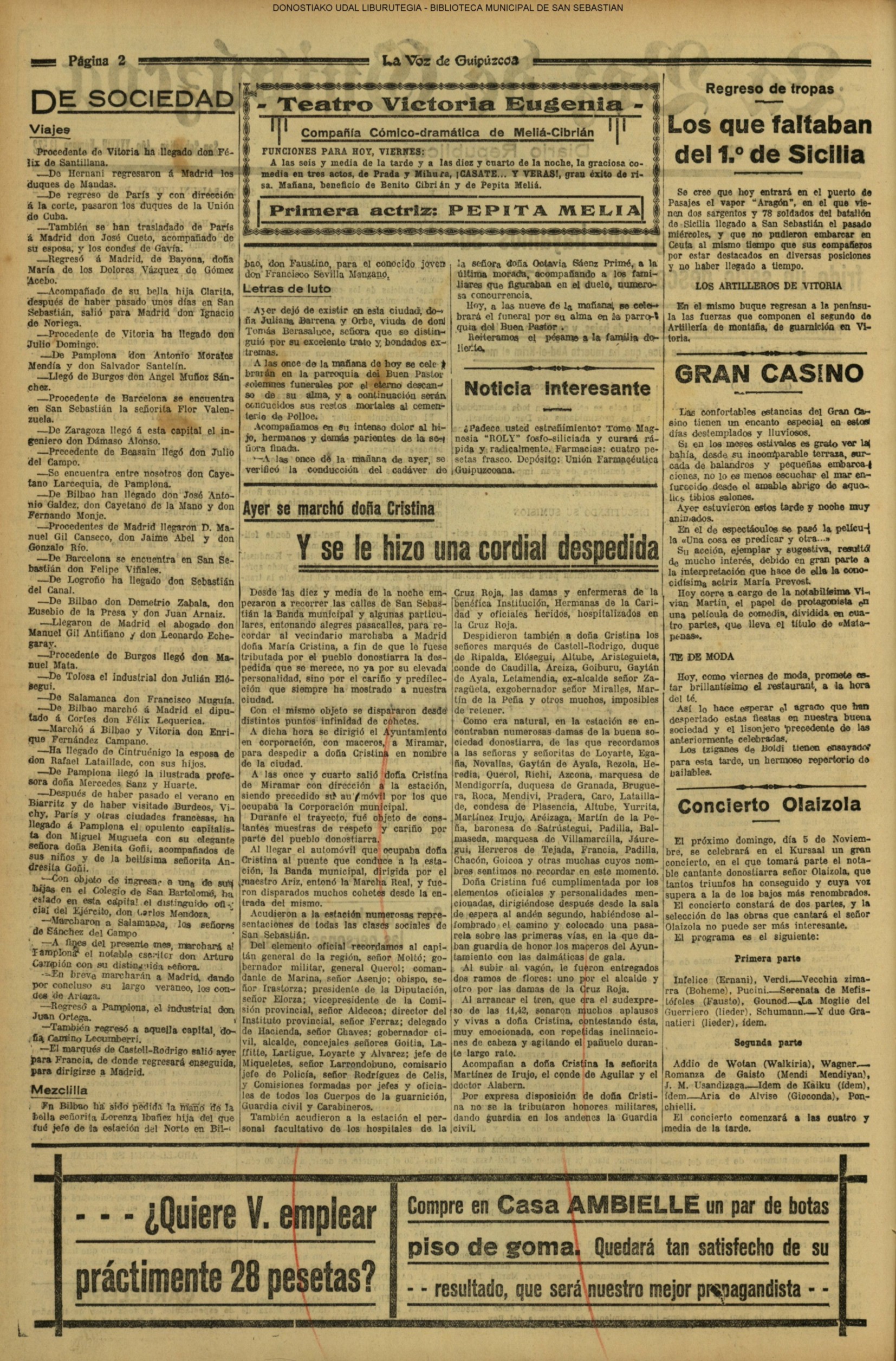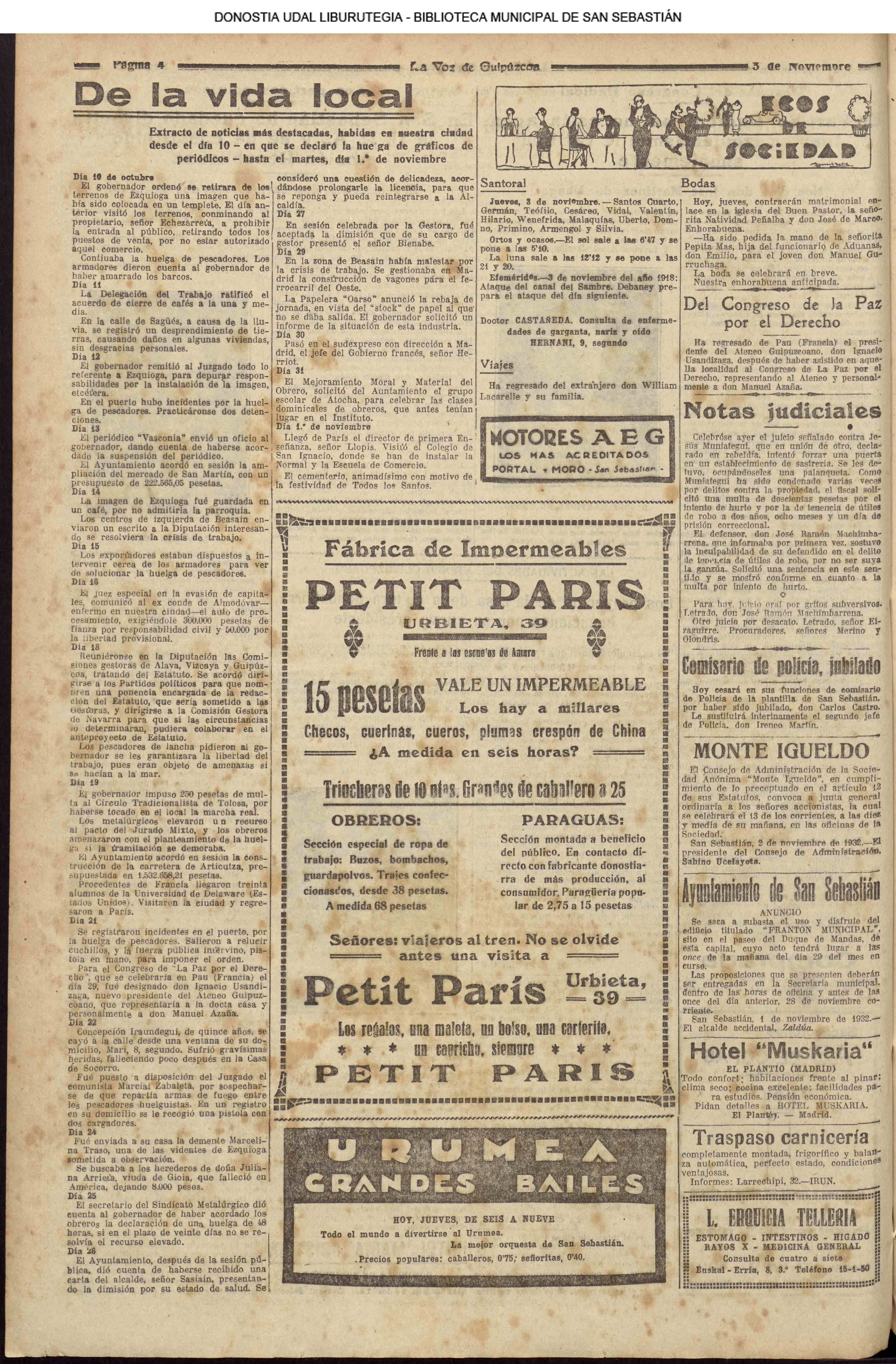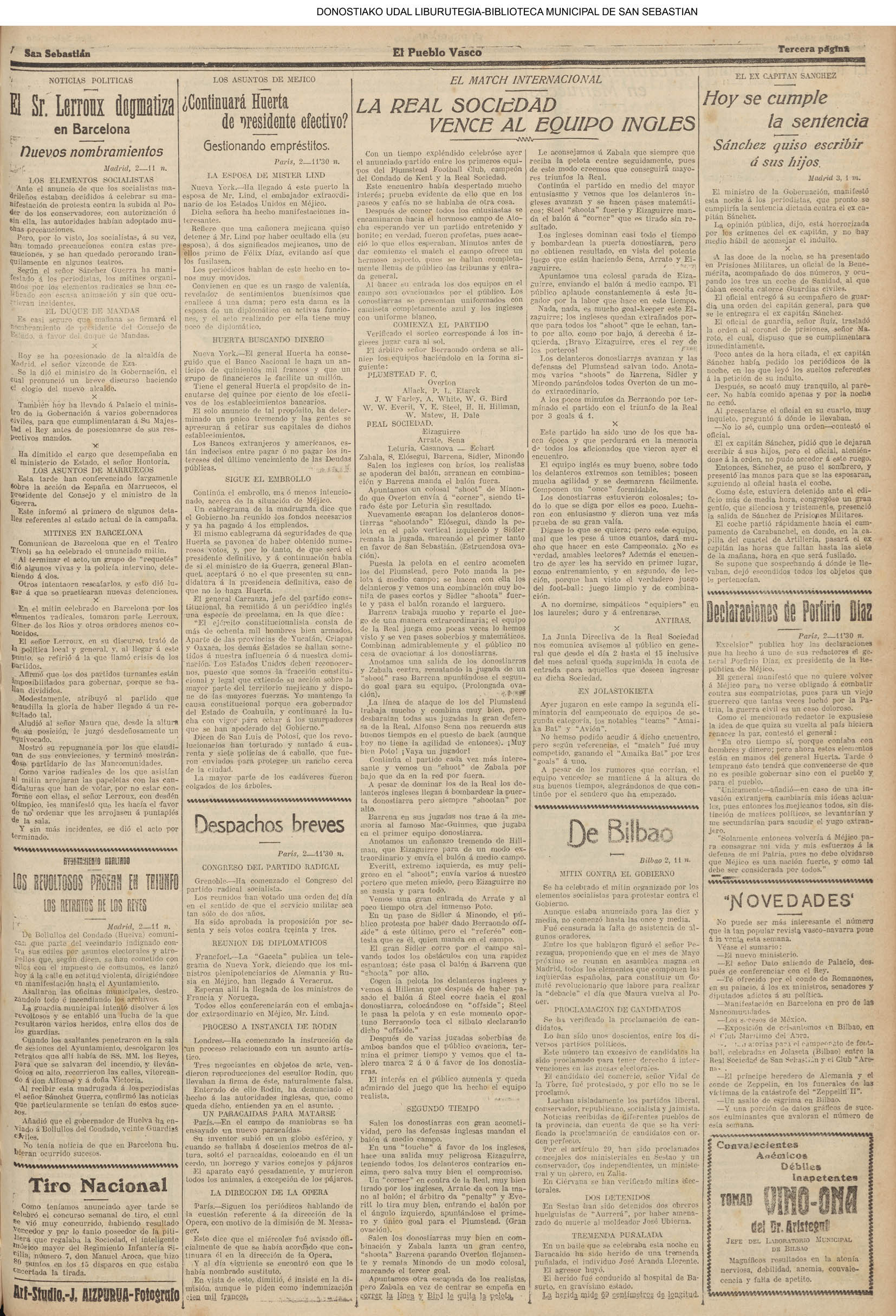 | 02 - noviembre ![]() . | (1939) - COMISIÓN MUNICIPAL PERMANENTE # Celebró sesión la Comisión Municipal Permanente, bajo la presidencia del alcalde señor Pauaga...... # SESIÓN DE LA GESTORA PROVINCIAL # Bajo la presidencia del señor Querejeta celebró sesión ordinaria la Gestora Provincial. (EL DIARIO VASCO)(LA VOZ DE ESPAÑA)(UNIDAD) (1941) REAL SOCIEDAD (2-0) BARCELONA (1942) (1945) Recibe sepultura en Polloe el cadáver del insigne pintor Zuloaga. (1947) REAL MADRID (3.0) REAL SOCIEDAD (1952) Domingo. Una grave avería, originada por el vendaval, incomunica a nuestra Ciudad por telégrafo con el resto de España, durante cuatro horas, por la tarde. Y al subir a un poste para repararla, en la Estación del Norte, una fuerte sacudida eléctrica despide al obrero celador de segunda del Cuerpo de Telégratos Manuel Sánchez Conde, cayendo de cabeza y matándose. Salva la vida, descendiendo a tiempo del poste, su compañero Eladio Freigido Várela. (1957). Cogida por el ascensor, perece esta tarde Petra Iturrarán Langarica, de 48 años, soltera, criada de los señores de Laca (Oquendo, 12). (1958) SEVILLA (0-1) REAL SOCIEDAD (1962) (1969) DEPORTIVO DE LA CORUÑA (0-2) REAL SOCIEDAD (1972) PLENO MUNICIPAL EXTRAORDINARIO (LA VOZ DE ESPAÑA) |